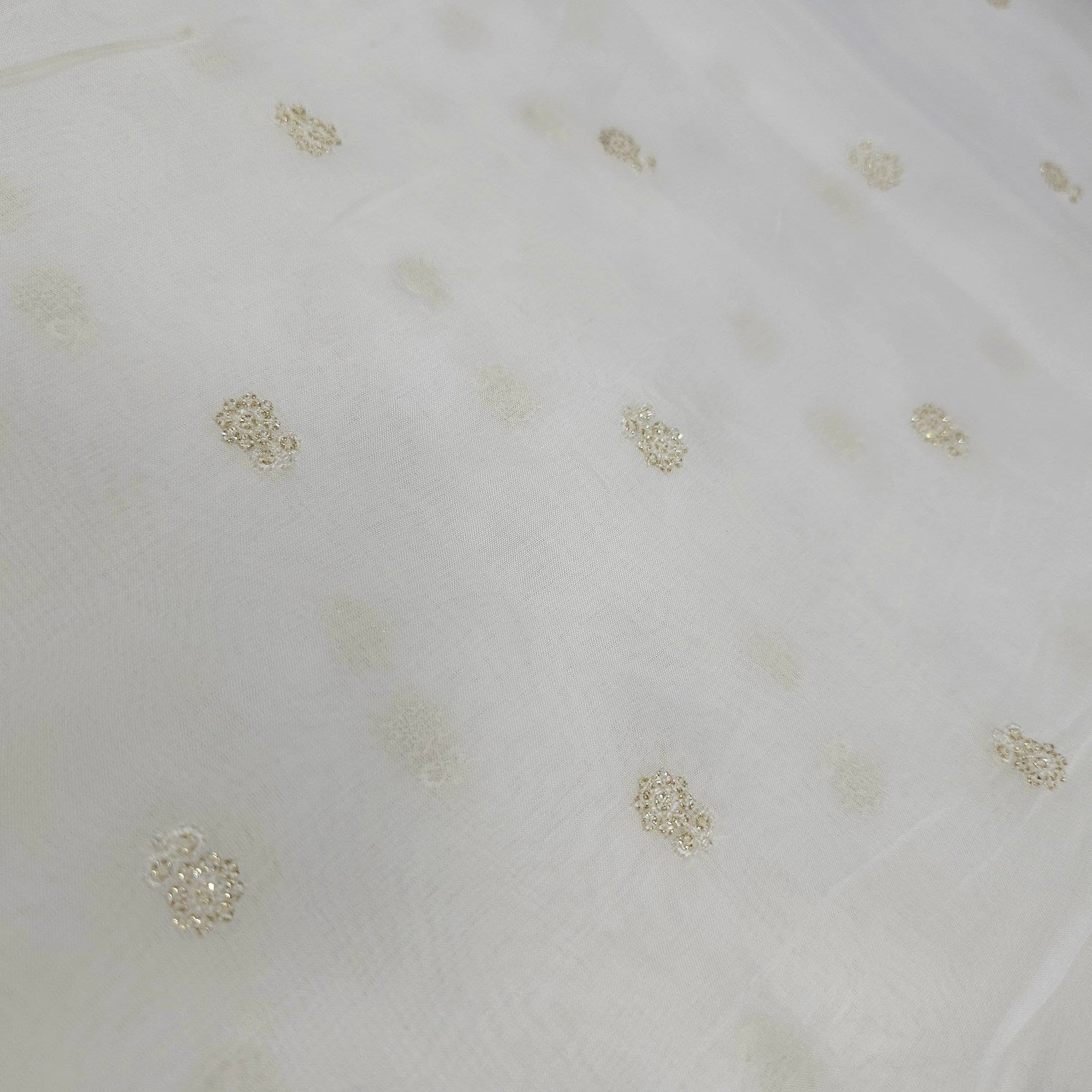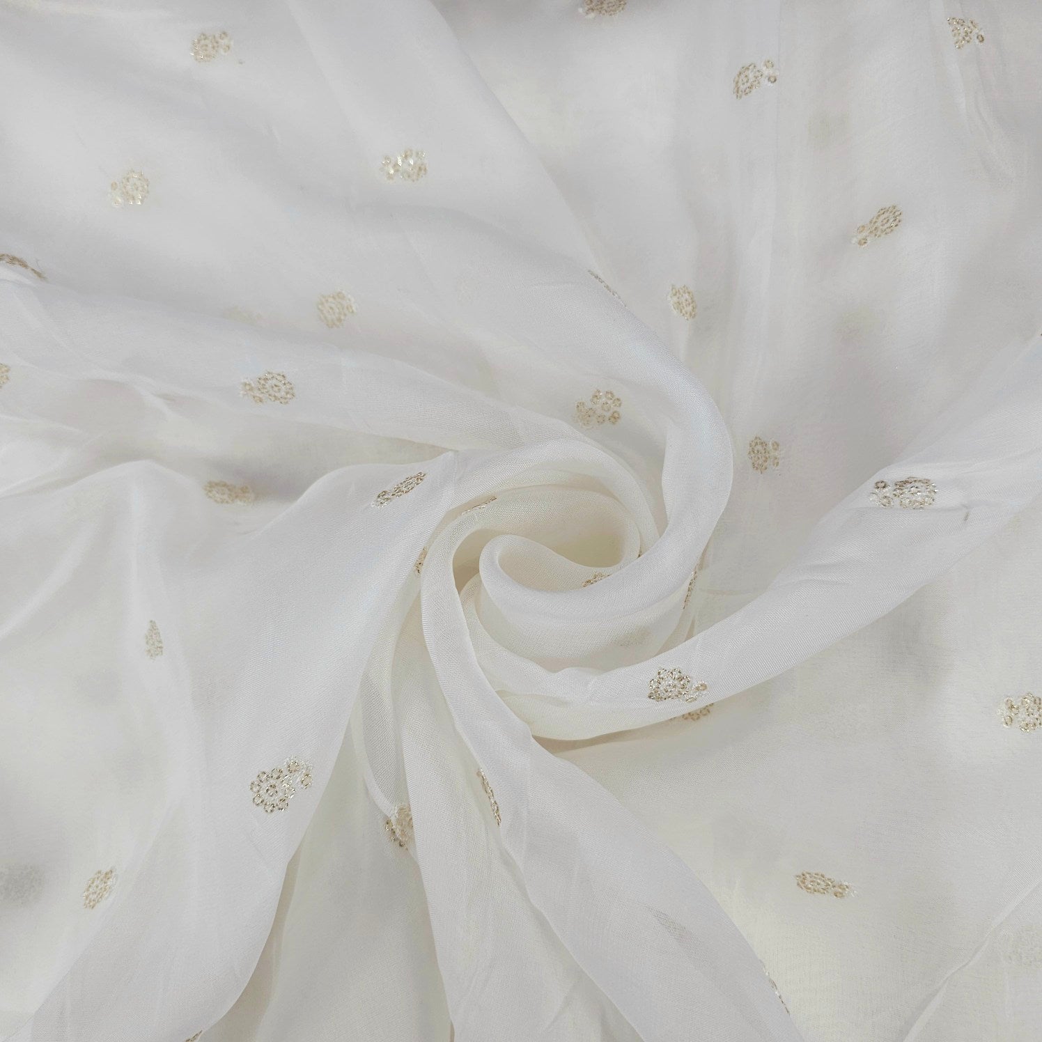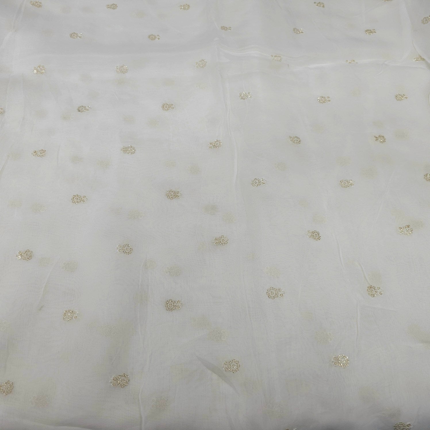 A delicate dyeable white organza fabric with fine, vertical arrangements of miniature gold floral sequins. The sequin motifs are scattered with measured spacing, adding a touch of sparkle and charm without overpowering the light, airy base. Ideal for festive overlays and elegant occasion wear.