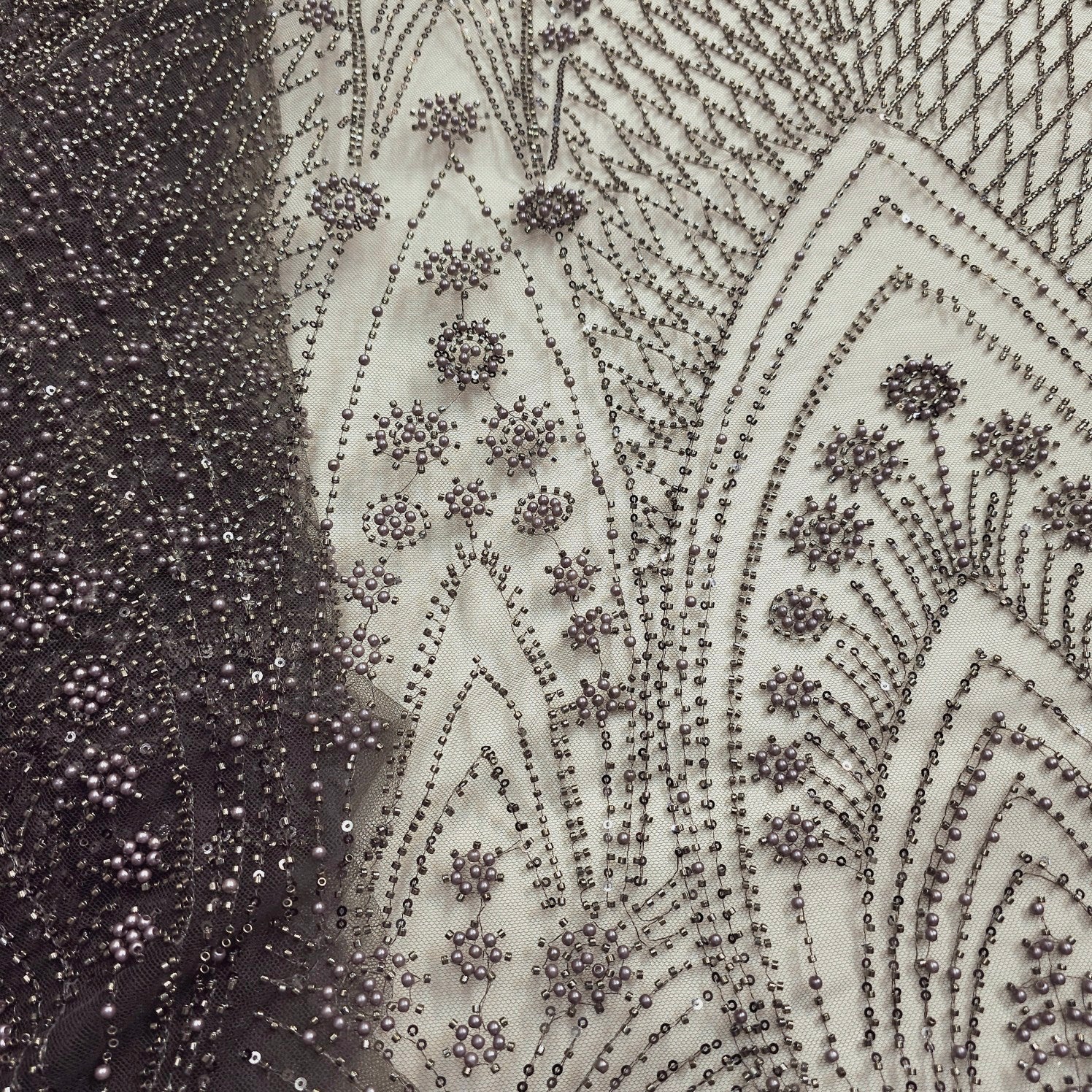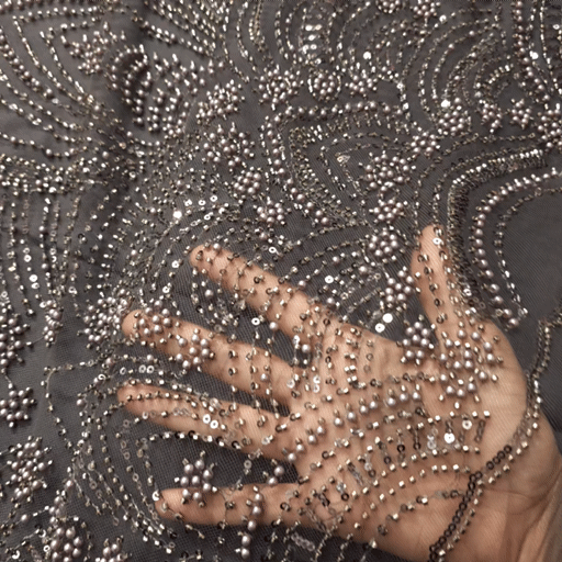 This grey net fabric features intricate floral embroidery highlighted with pearls, cutdana for a luxurious, radiant finish. The delicate grey tone adds a soft, elegant charm, making it perfect for premium ethnic and bridal wear. Its detailed craftsmanship brings depth, richness, and a statement-making appeal to any outfit.