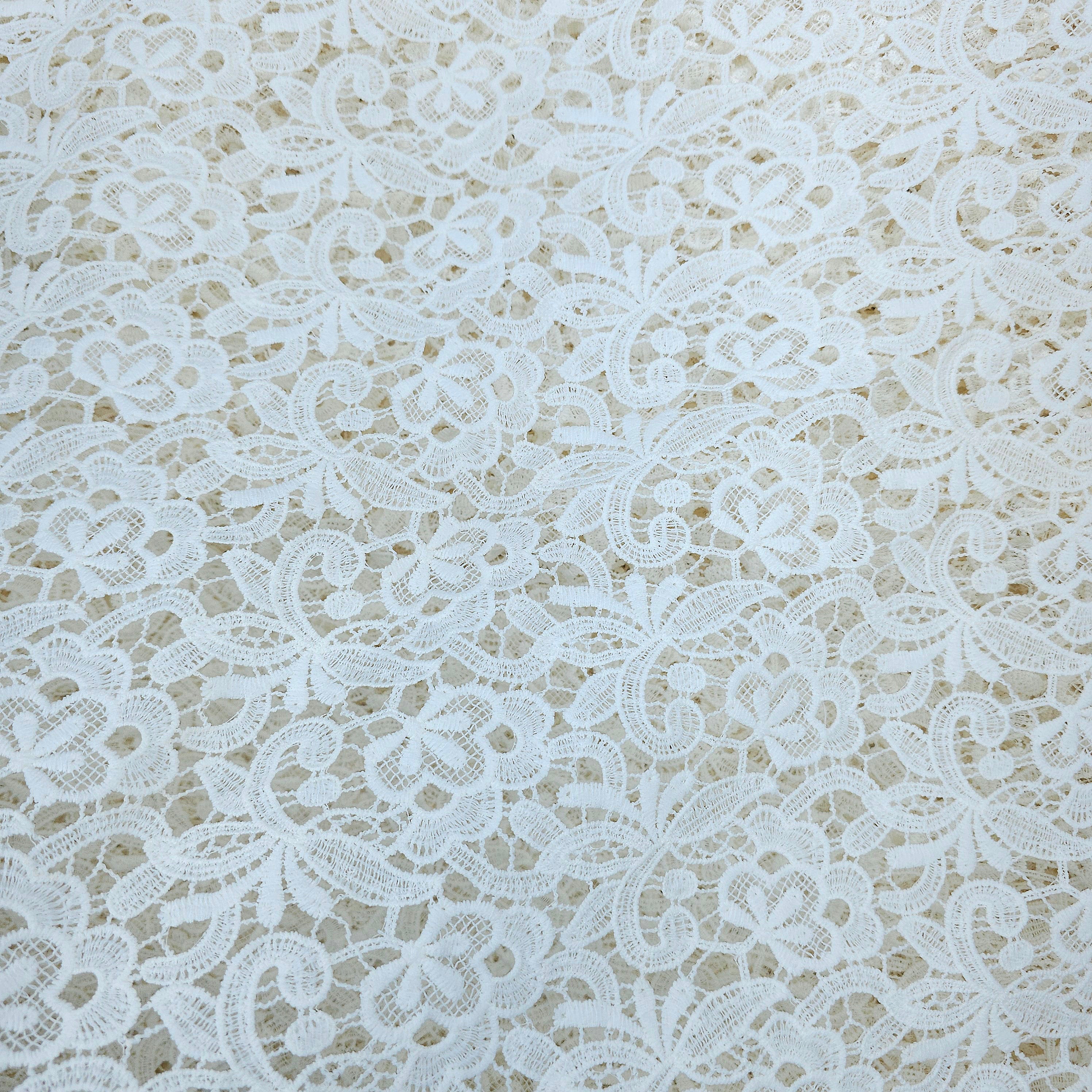 This guipure cotton fabric features a striking floral pattern with intricate soft floral motifs, all linked with delicate bridges for a seamless lace effect. The embroidery is bold yet refined, creating a dramatic texture that adds elegance to formal and festive apparel.