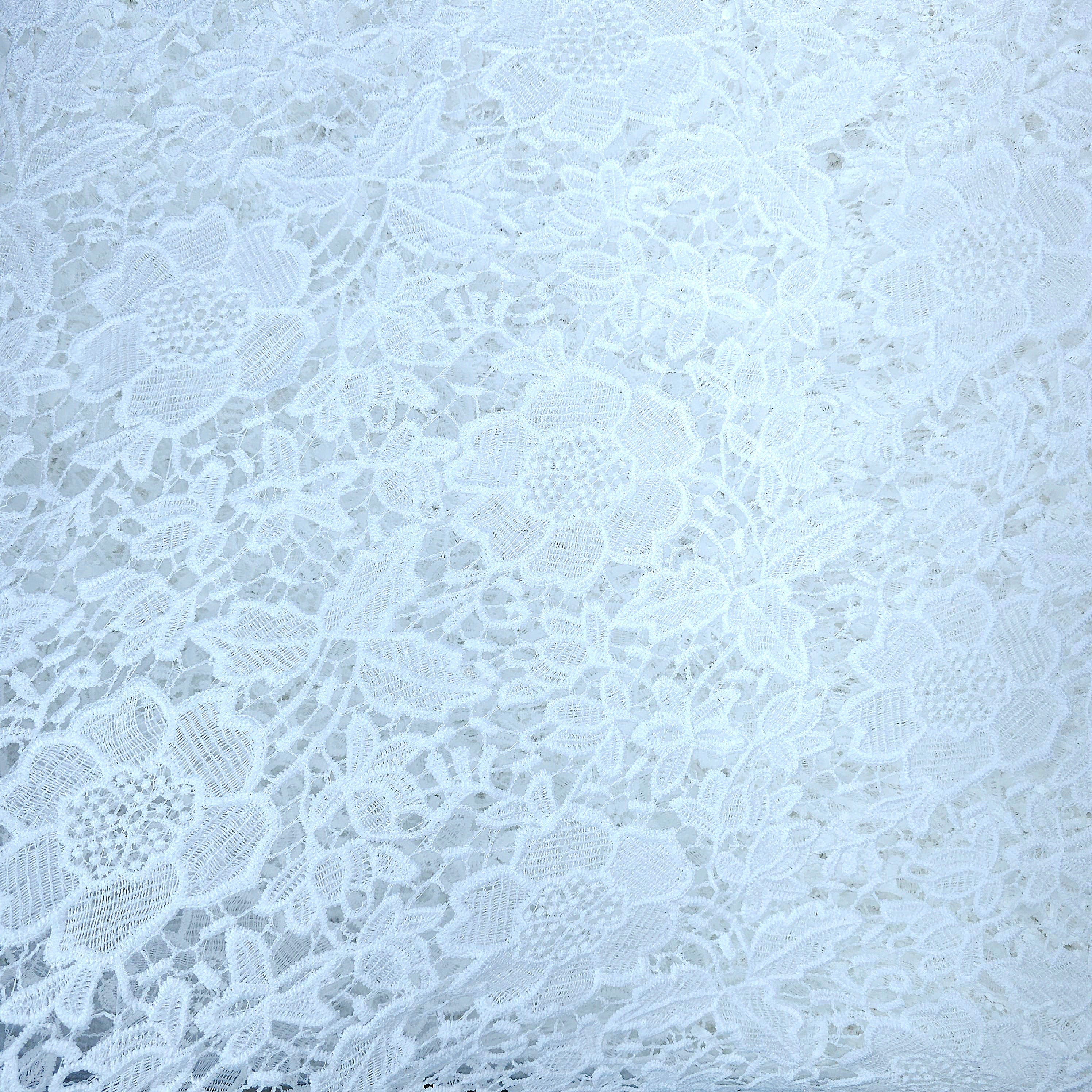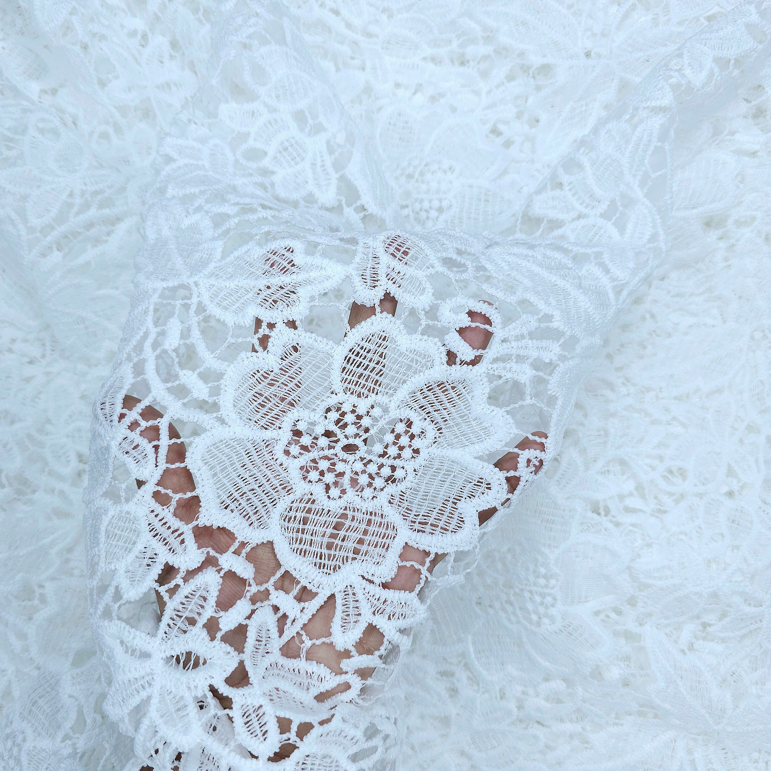 This guipure cotton fabric features a striking floral pattern with intricate soft floral motifs, all linked with delicate bridges for a seamless lace effect. The embroidery is bold yet refined, creating a dramatic texture that adds elegance to formal and festive apparel.