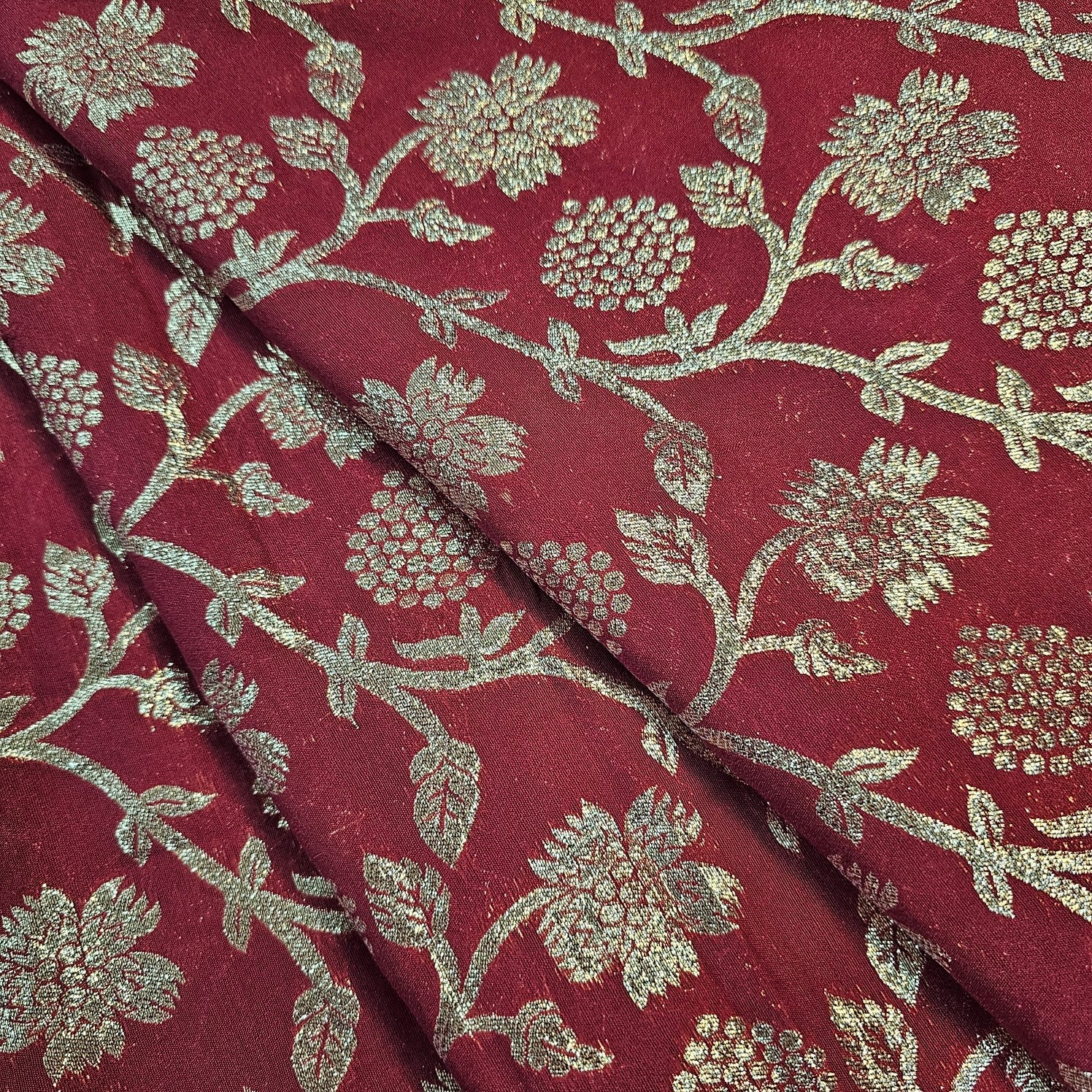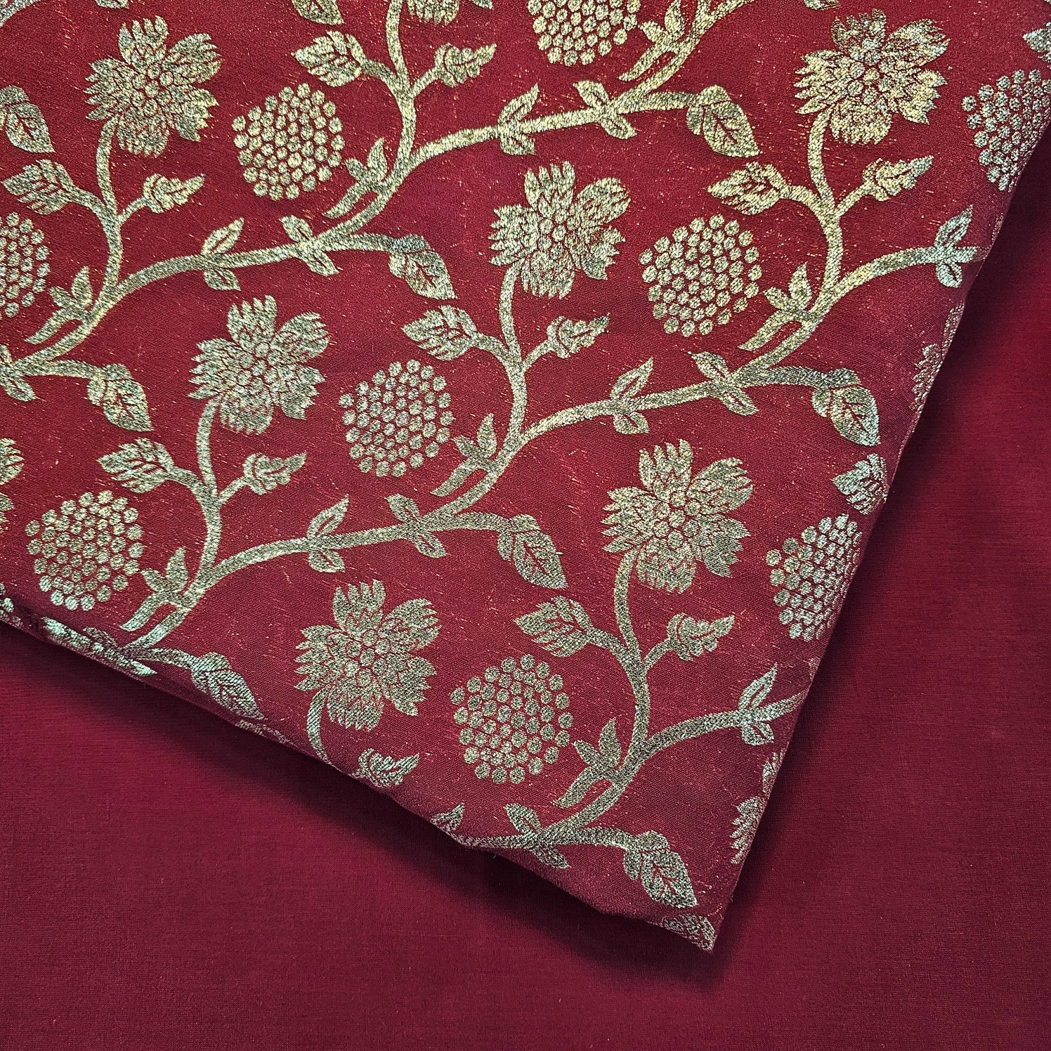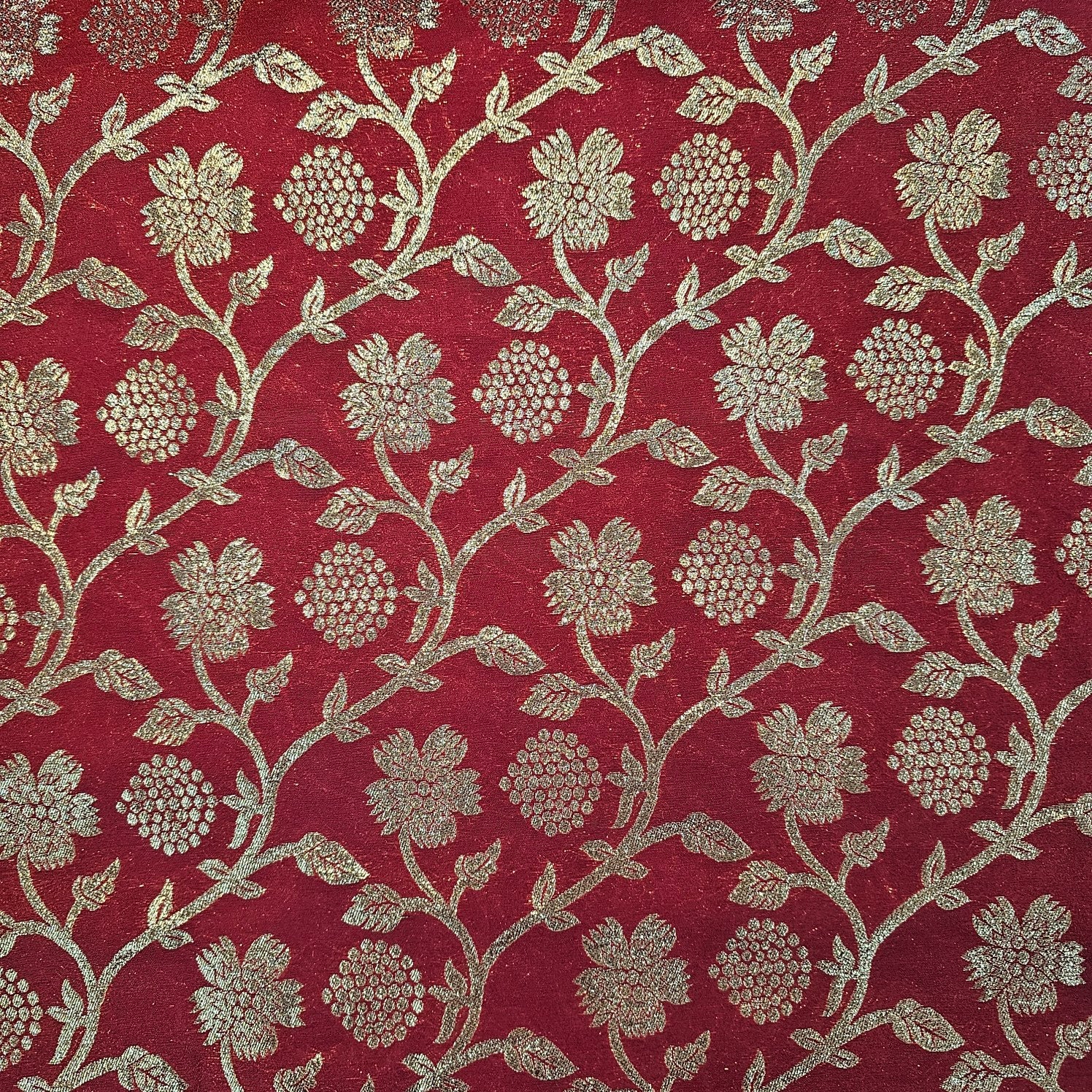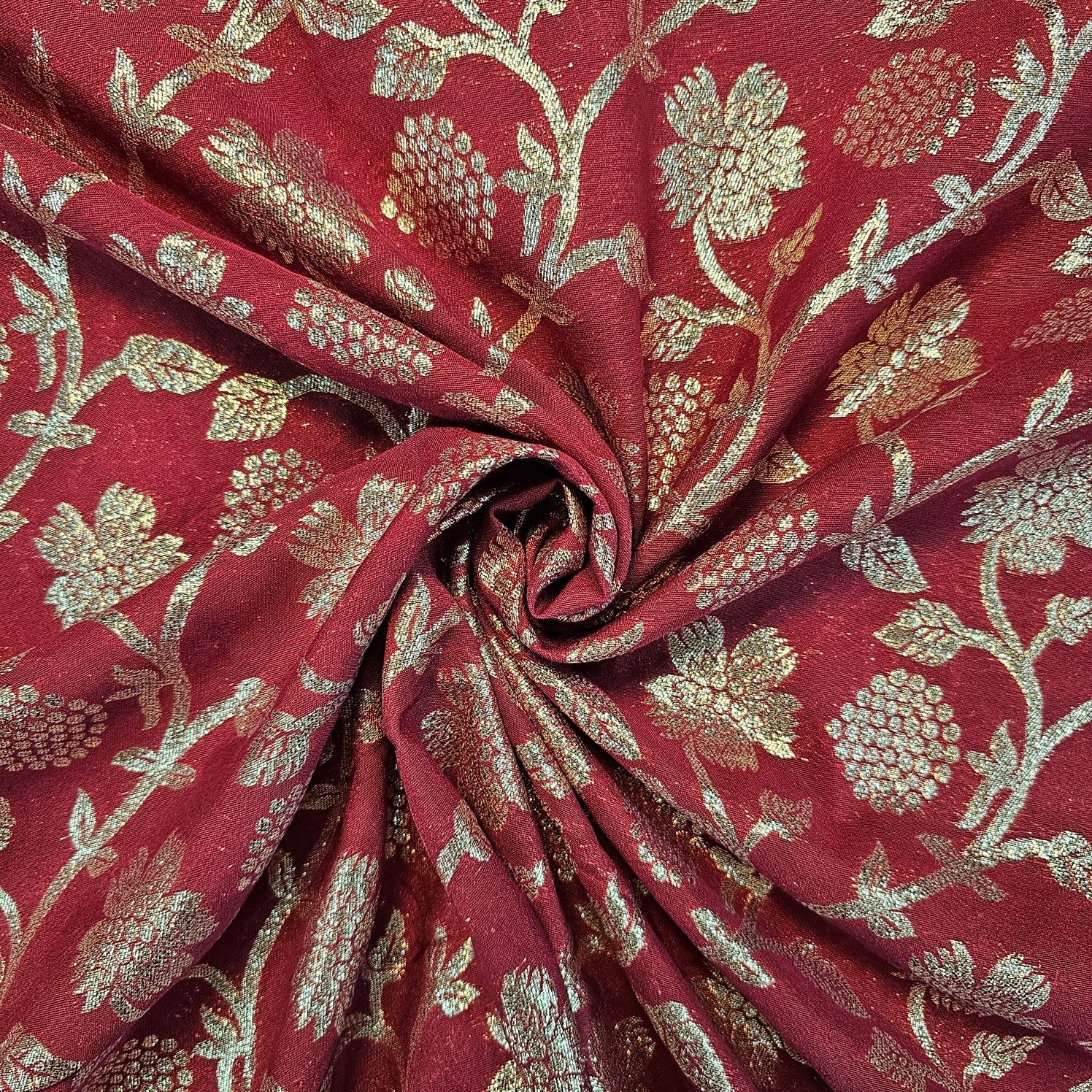 A luxurious Banarasi brocade fabric featuring intricate floral vine motifs woven with fine golden zari threads. The exquisite craftsmanship adds a regal touch, making it a perfect choice for ethnic and festive wear. The fabric's soft texture and lustrous sheen enhance its elegance, ensuring a timeless appeal.