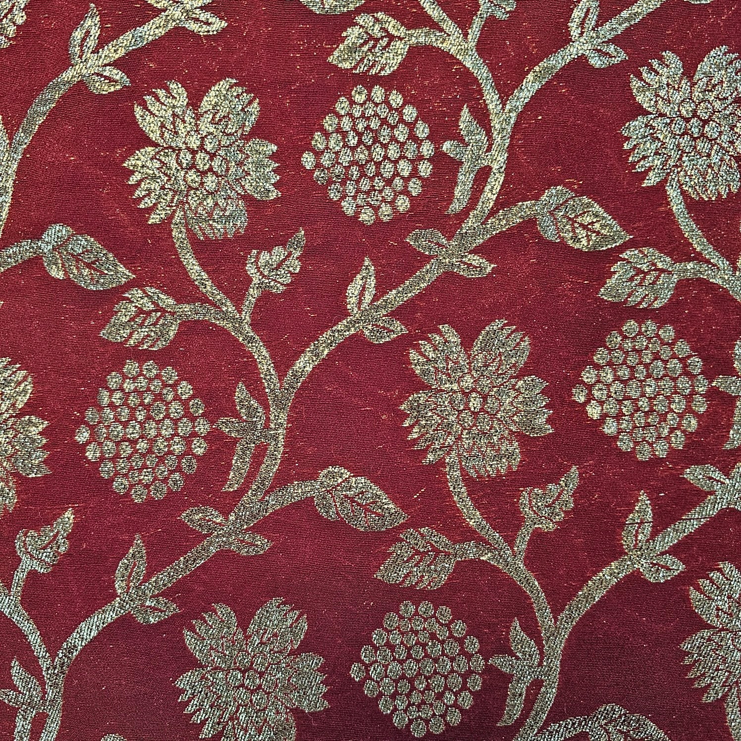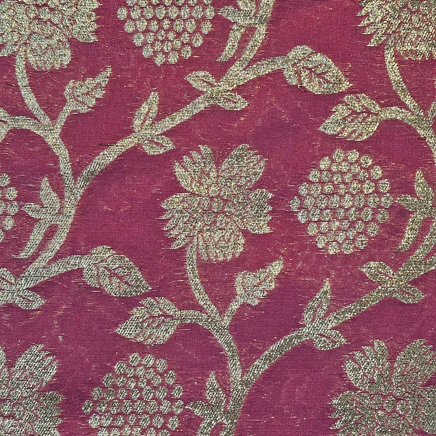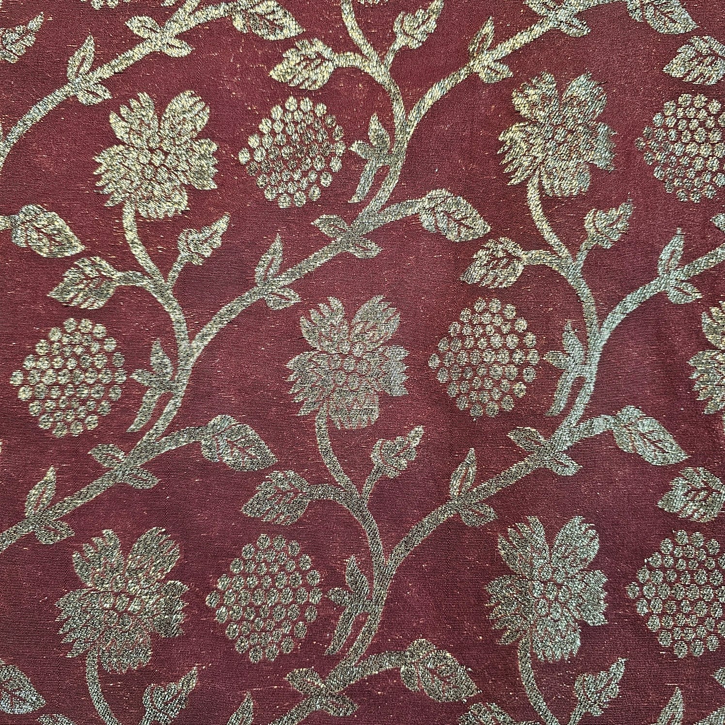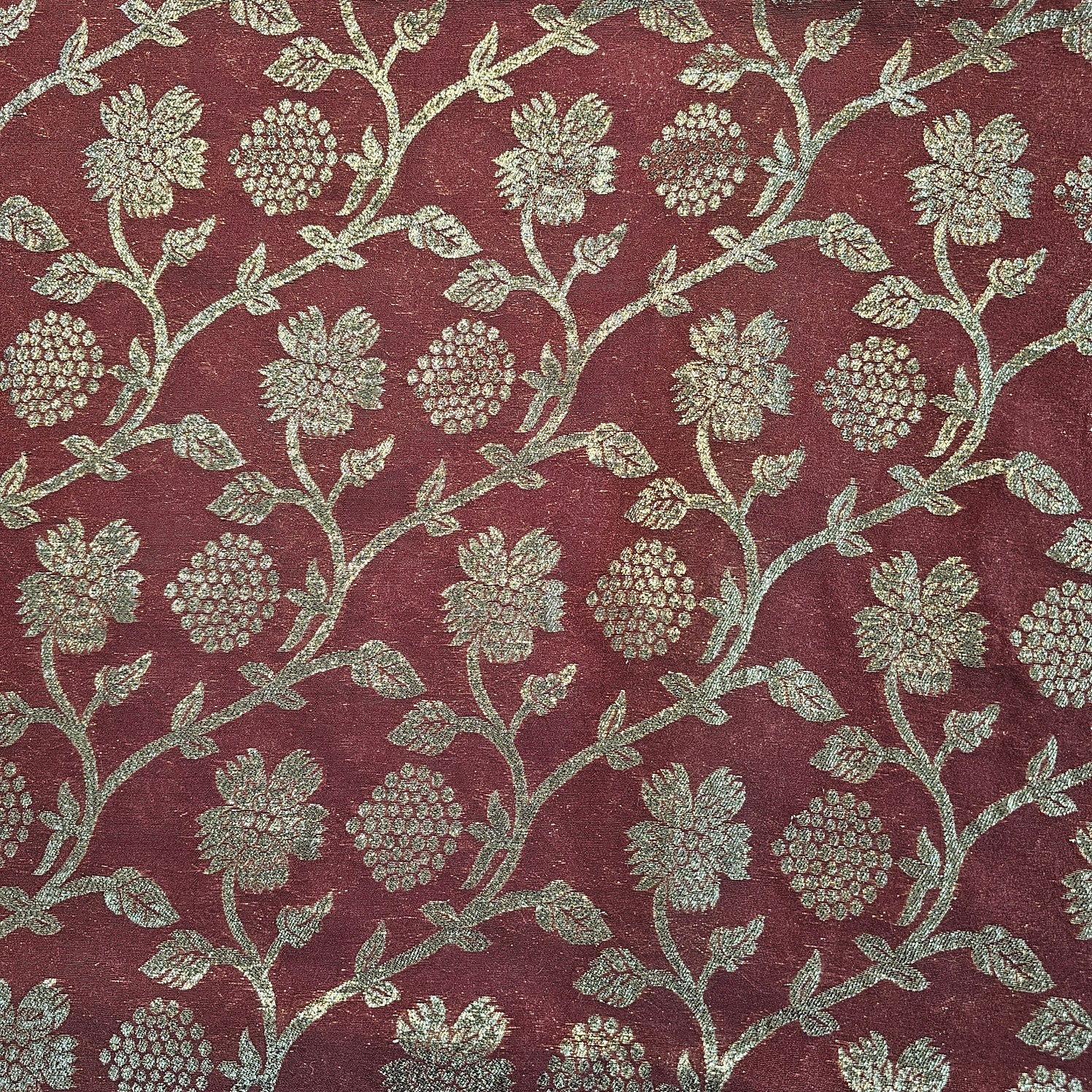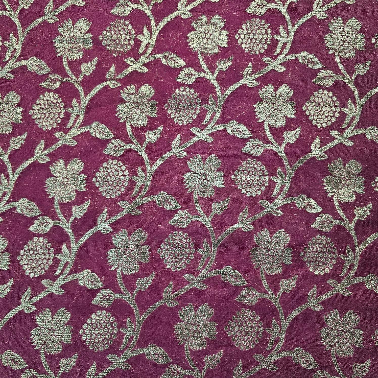 A luxurious Banarasi brocade fabric featuring intricate floral vine motifs woven with fine golden zari threads. The exquisite craftsmanship adds a regal touch, making it a perfect choice for ethnic and festive wear. The fabric's soft texture and lustrous sheen enhance its elegance, ensuring a timeless appeal.