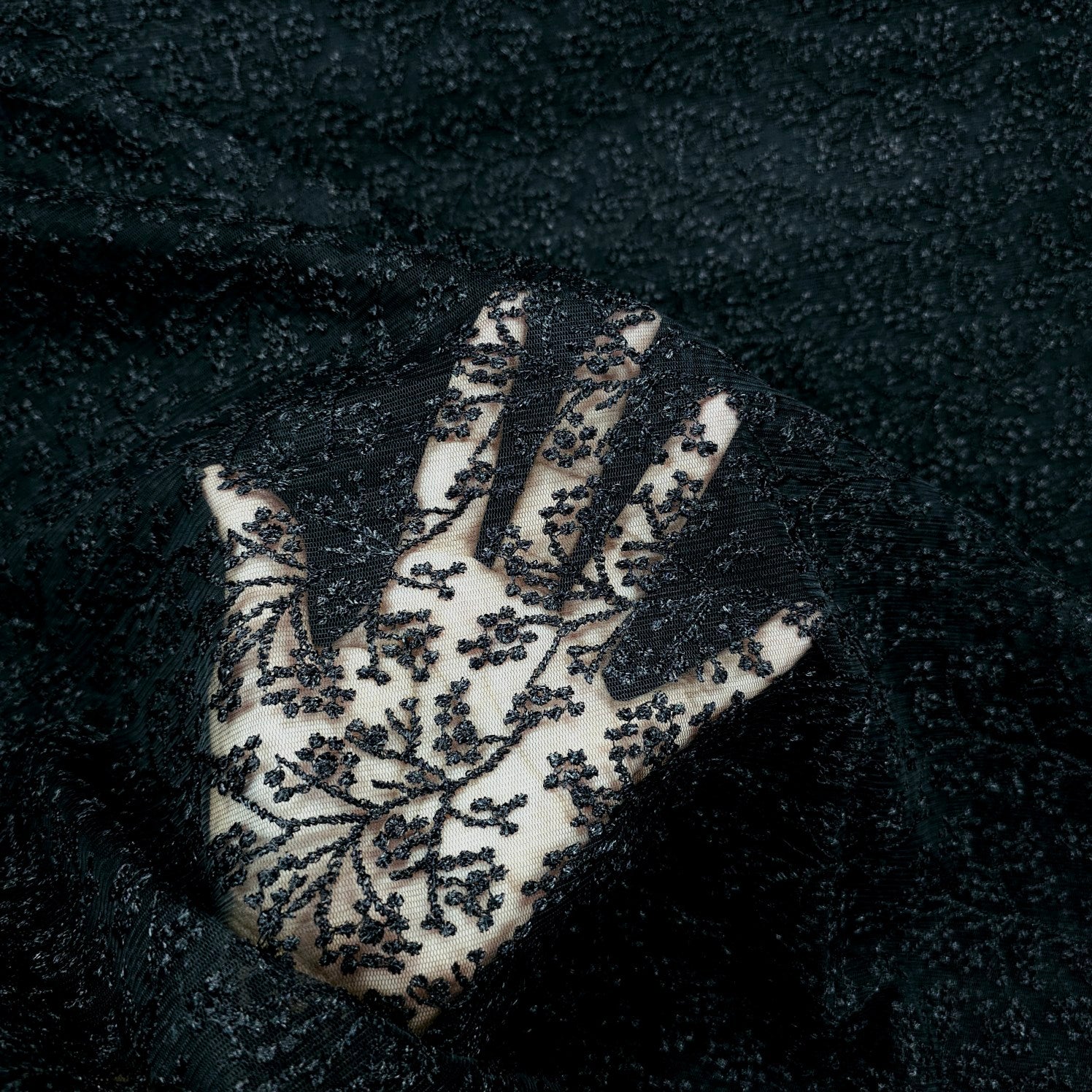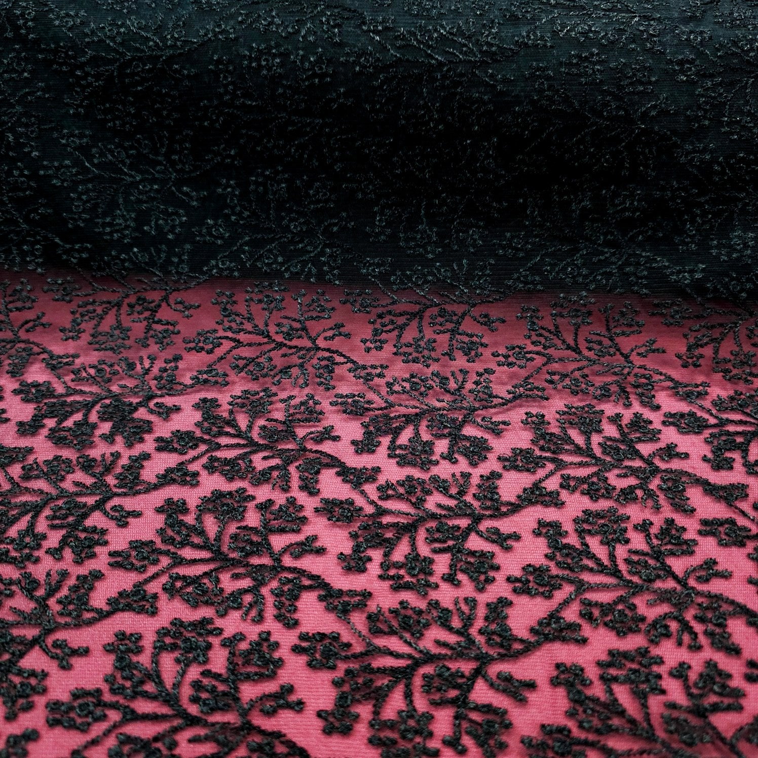 Elegant floral embroidered net fabric with a contrasting sheer base, offering a luxurious and sophisticated look. Ideal for ethnic and evening wear.