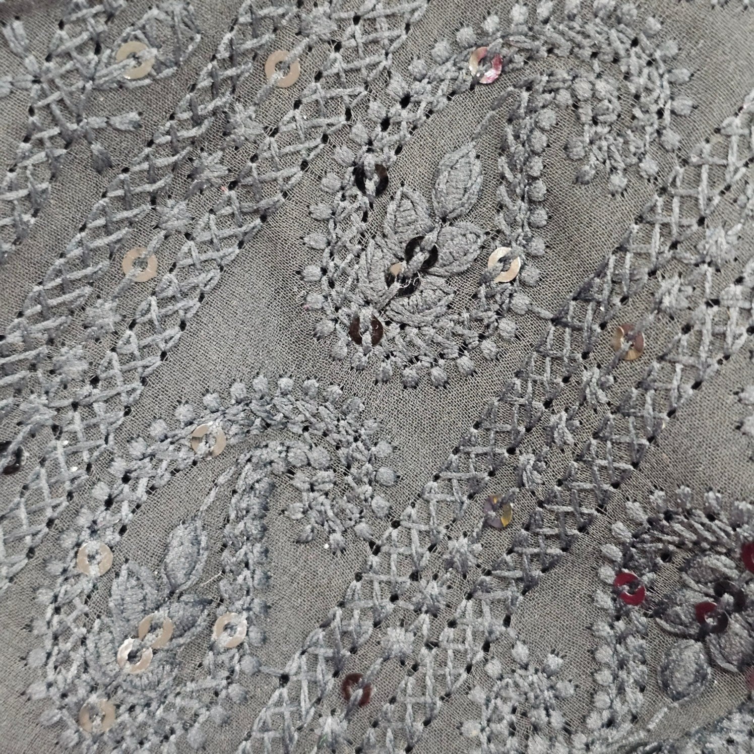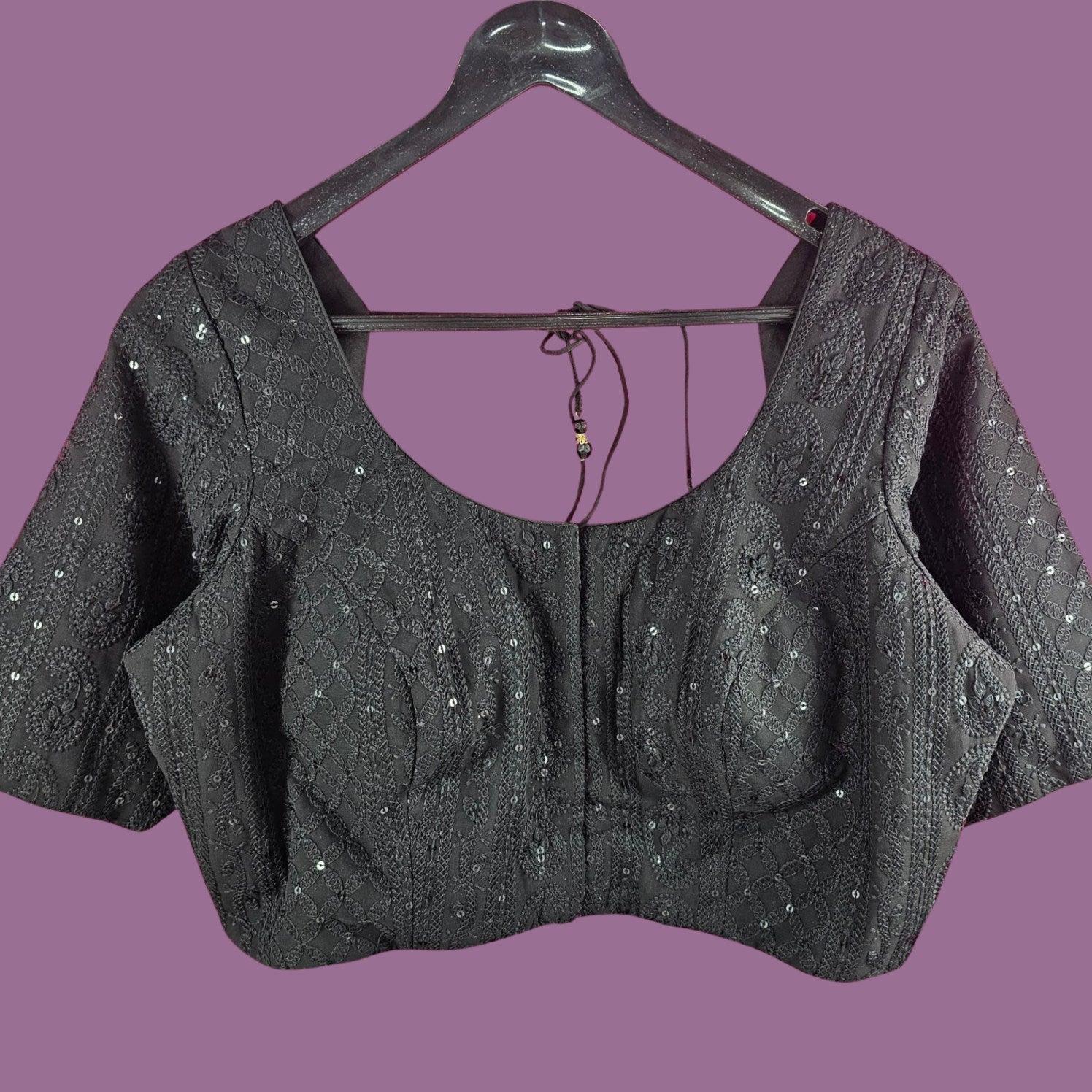 This is black color elegant self-textured blouse adorned with subtle sequins for a hint of sparkle and paisely motif. Featuring a classic round neckline and half sleeves, offers timeless charm - perfect for evening functions, cocktail parties, or festive celebrations.