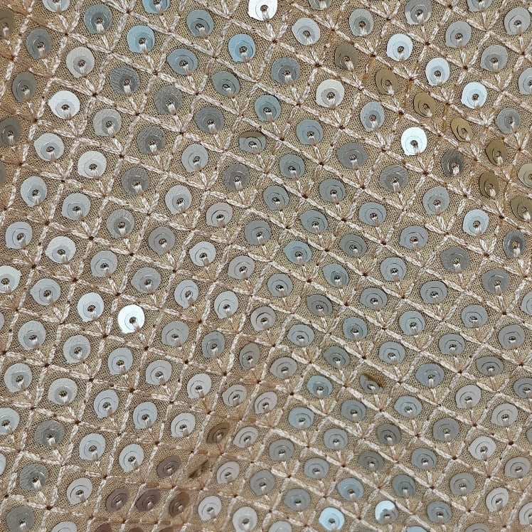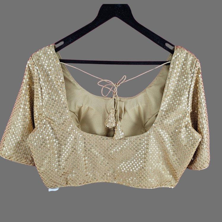 These are elegant sequin-embellished blouses with a classic round neckline and half sleeves. The shimmering silver and champagne tones add a luxurious touch, making them ideal for festive occasions or wedding celebrations.