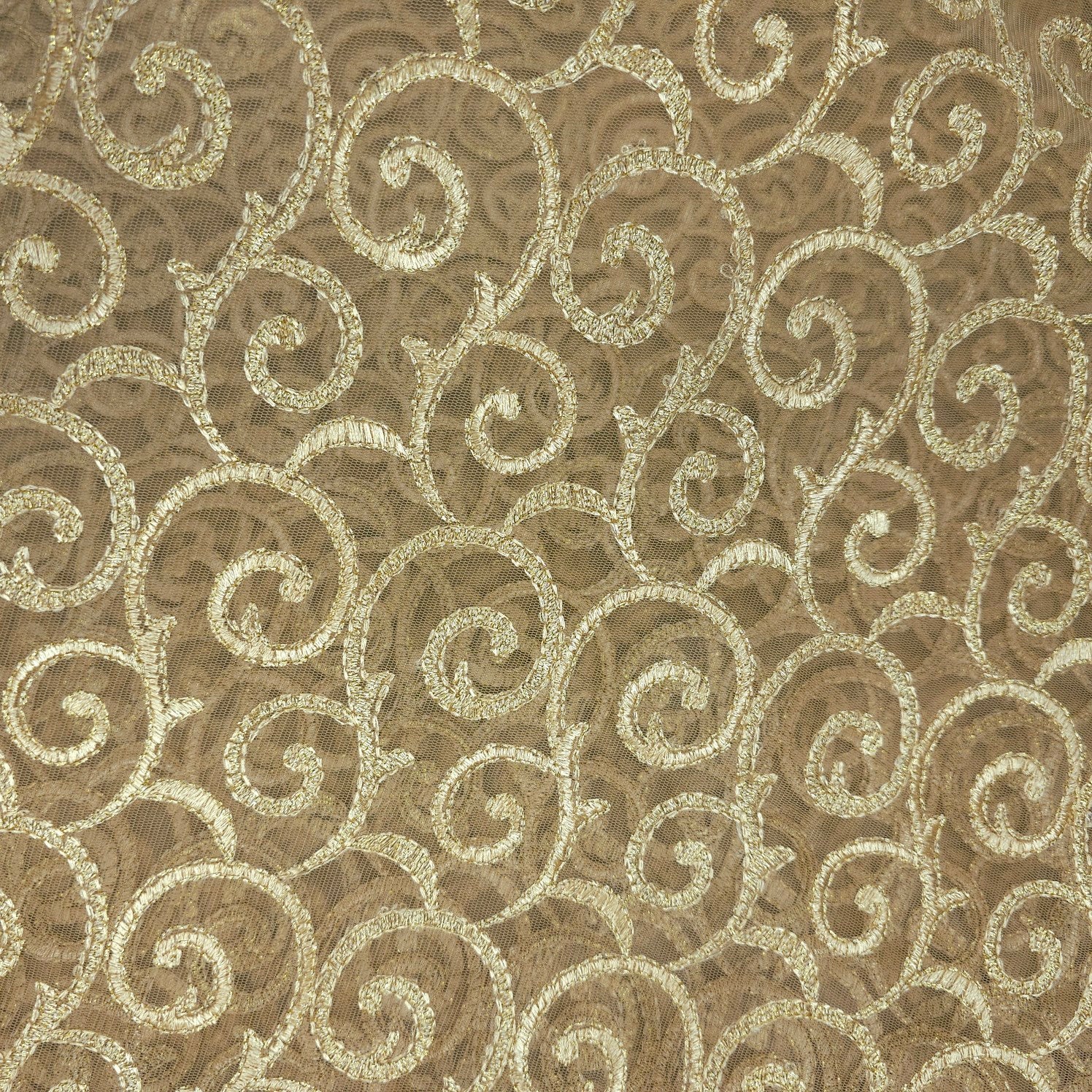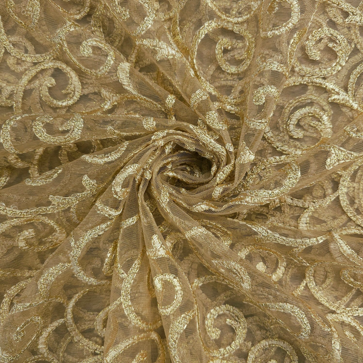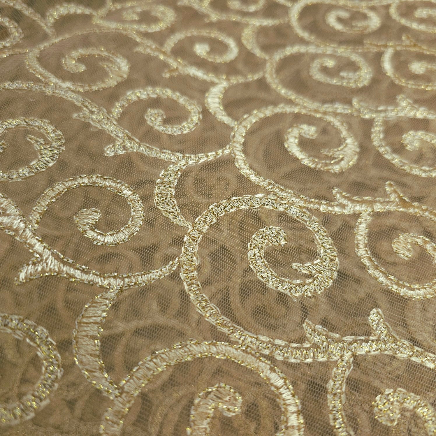 A luxurious gold swirl embroidered net fabric featuring a delicate sheer base with intricate metallic embroidery. The elegant swirling pattern adds a touch of glamour, making it perfect for grand occasions and festive wear.