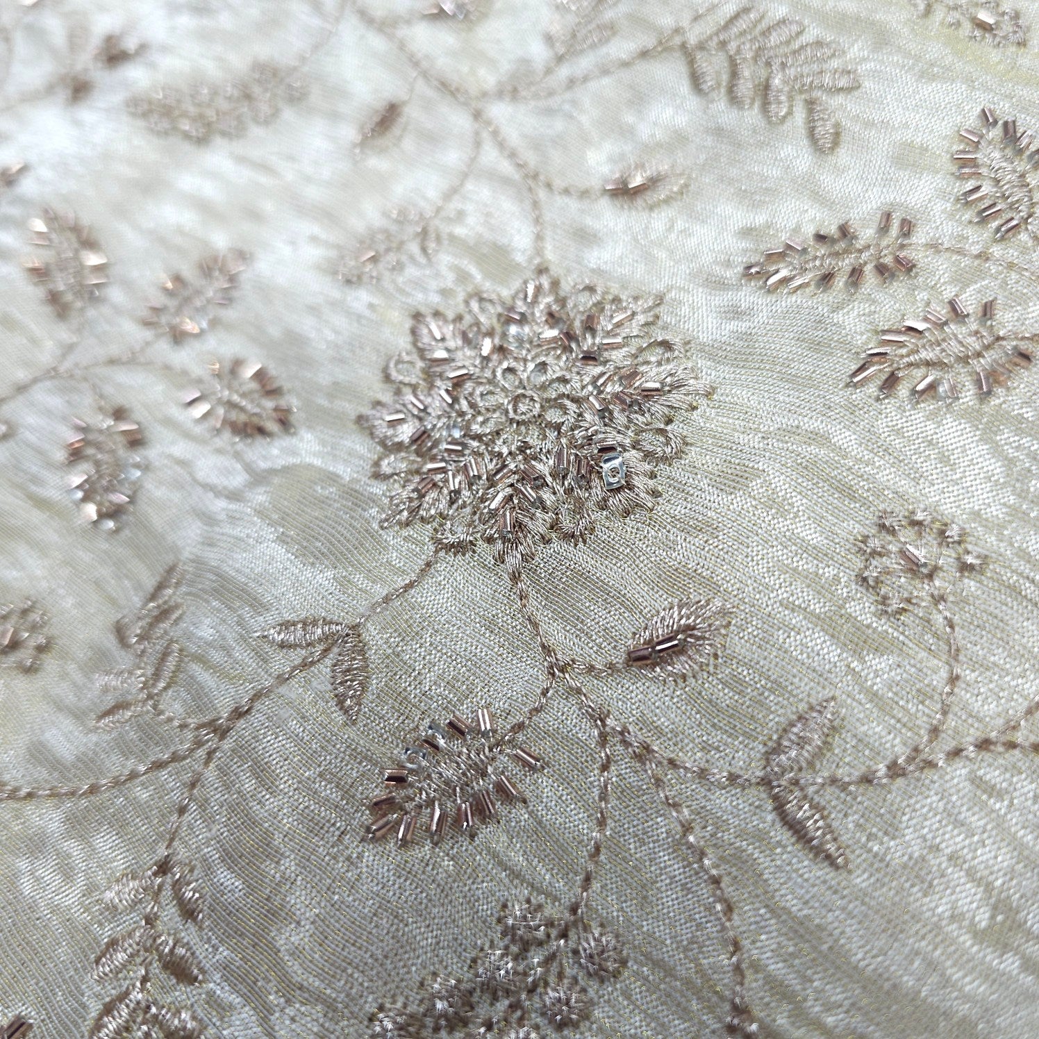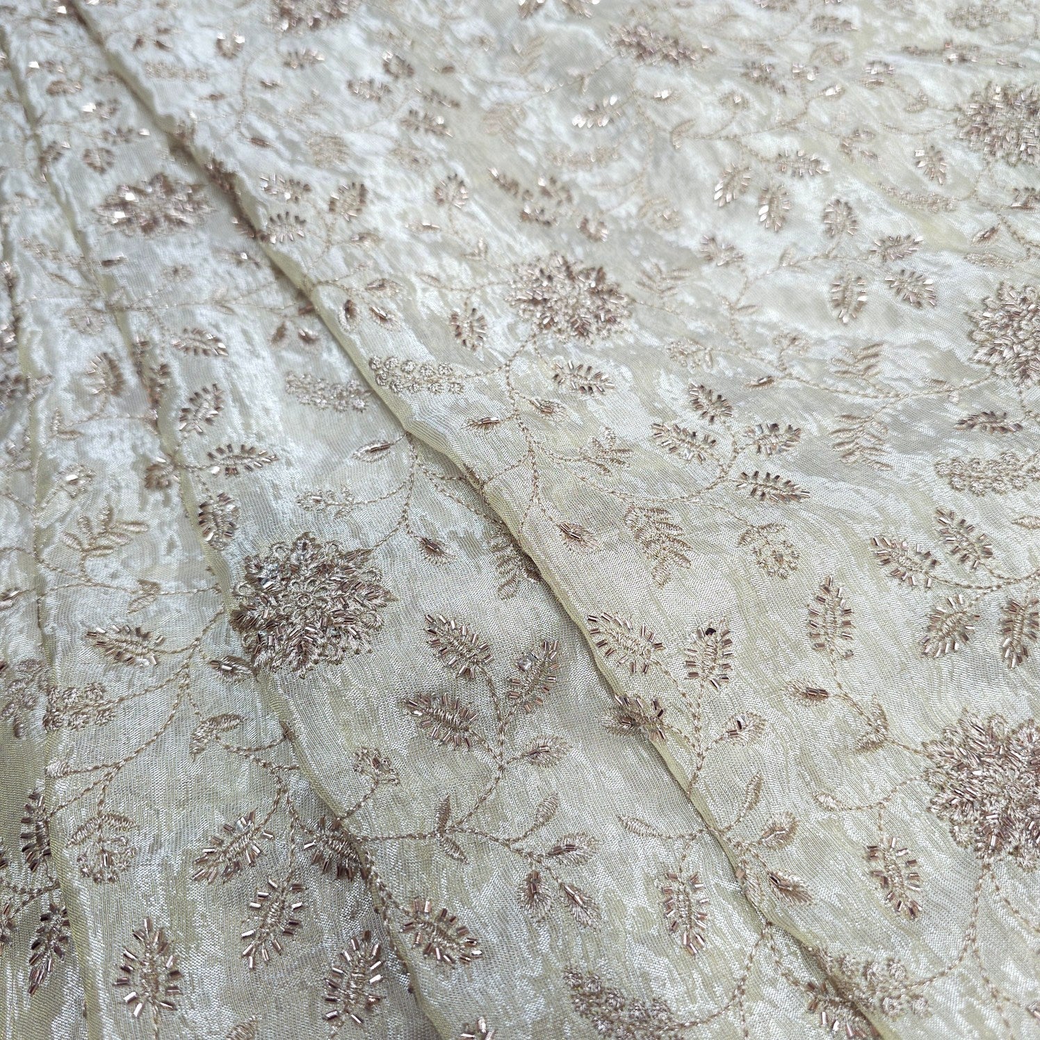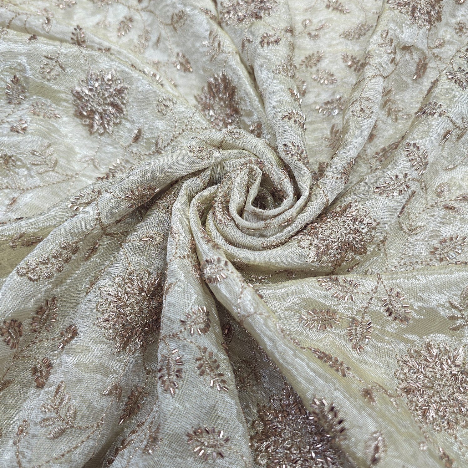This is a shimmer tissue fabric featuring a translucent golden base with a lustrous finish and intricate floral embroidery. The motifs are enhanced with metallic threads (zari), sequins, seed beads, cut danas, creating a luxurious, decorative surface. The fabric’s natural shimmer, paired with its structured drape, makes it perfect for elegant and festive garments.
