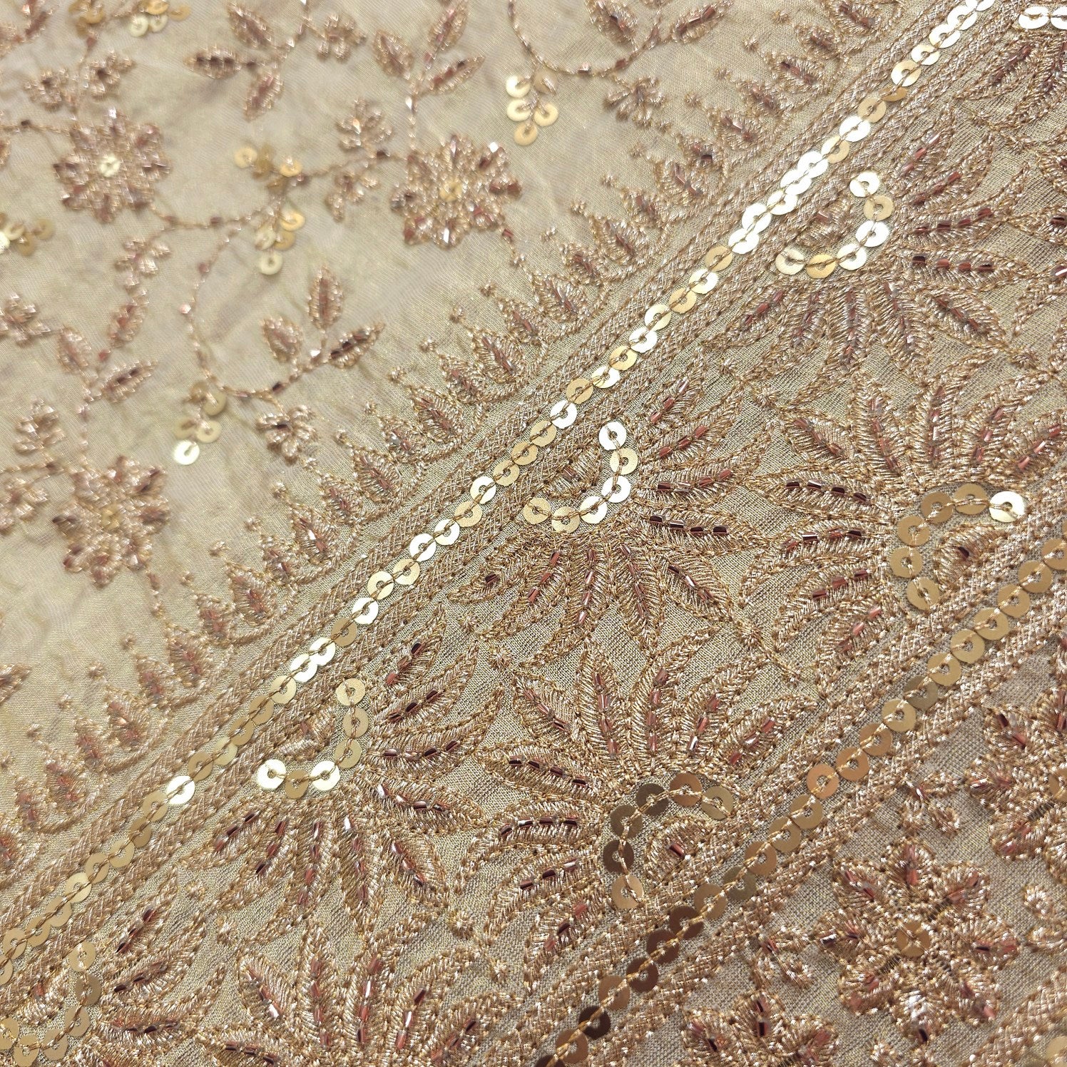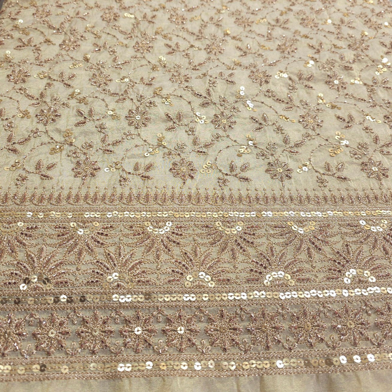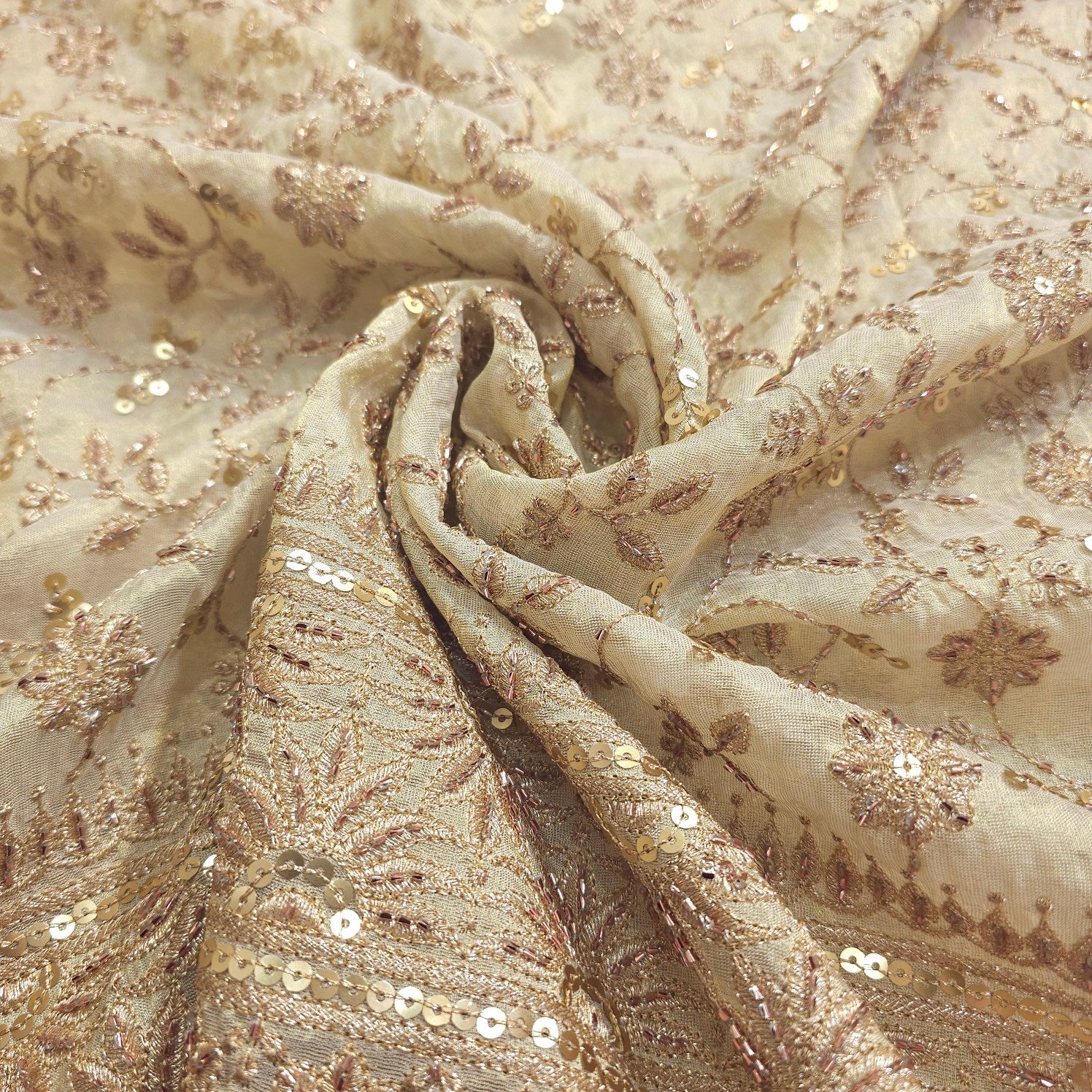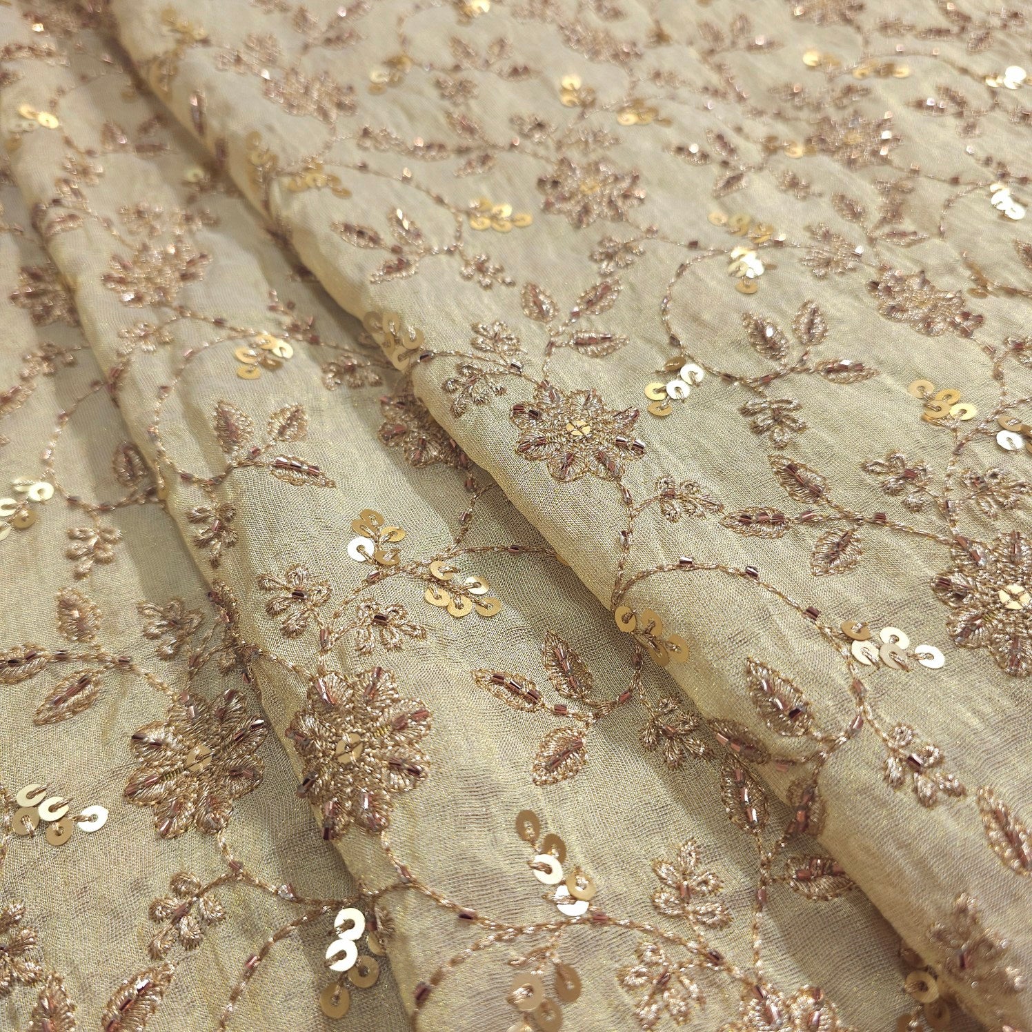 A luxurious dyeable shimmer tissue fabric adorned with floral embroidery and intricate. The lower half is richly detailed with sequin vines and motifs, while delicate vertical lines of embellishments cascade down the length, creating a graceful and festive appeal. Ideal for statement kurta, dupattas, or ethnic gowns.