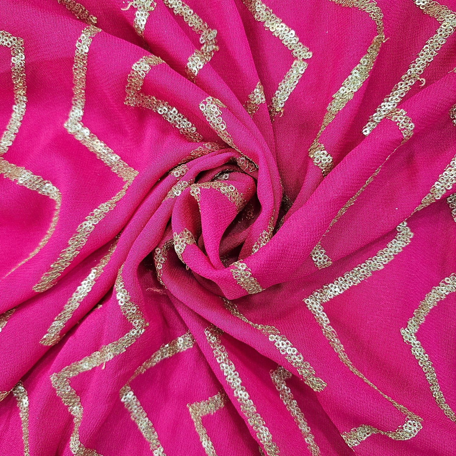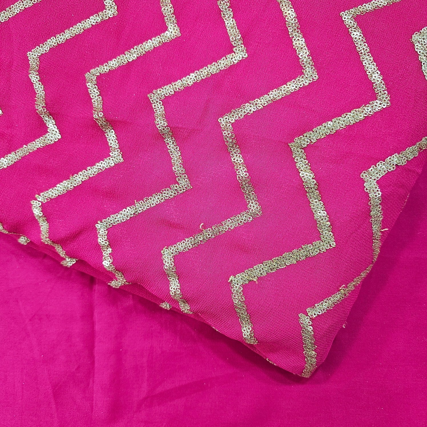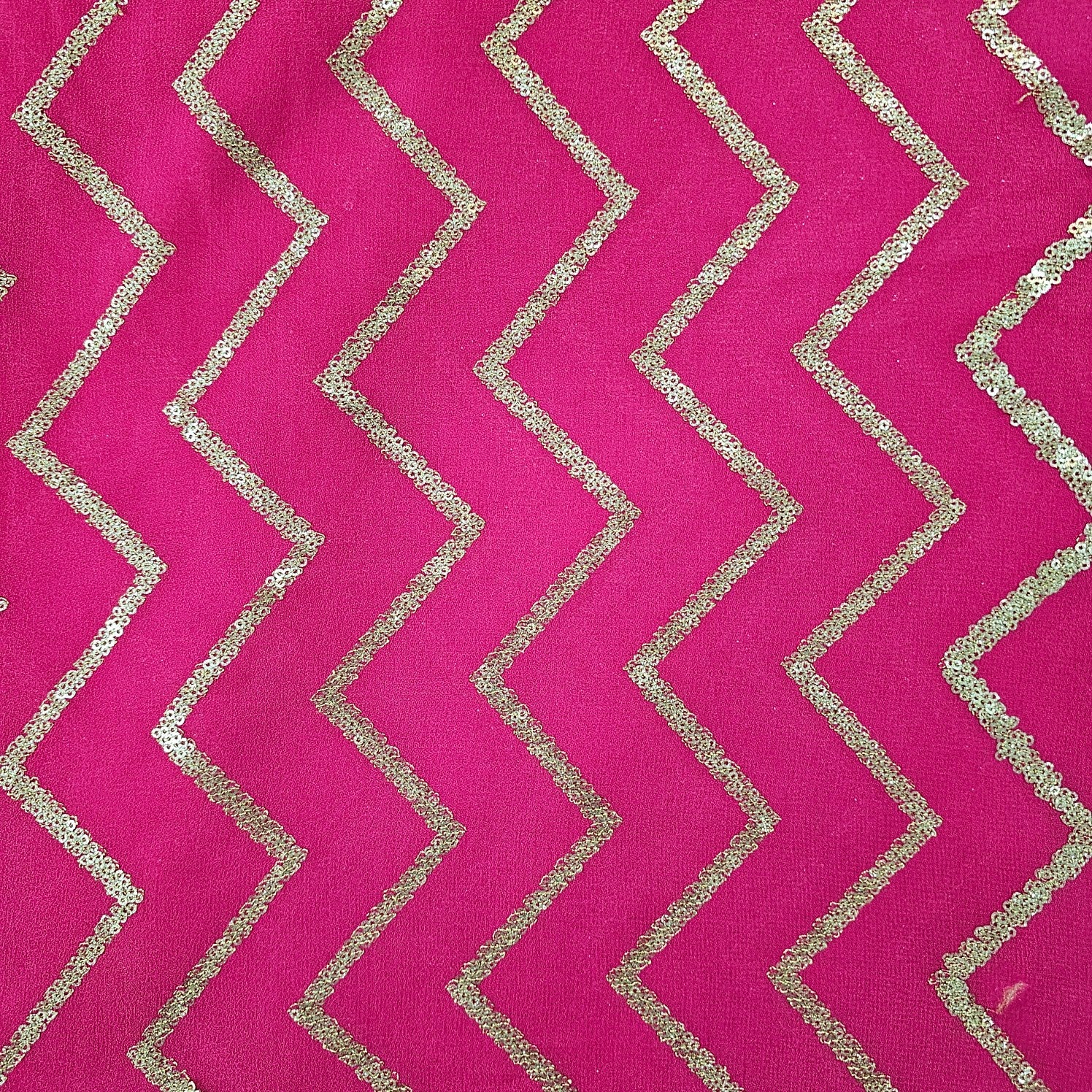 A rich black georgette fabric adorned with intricate golden sequin embroidery in a striking zigzag pattern. This fabric has a graceful drape and a shimmering effect, perfect for festive and party wear ensembles.