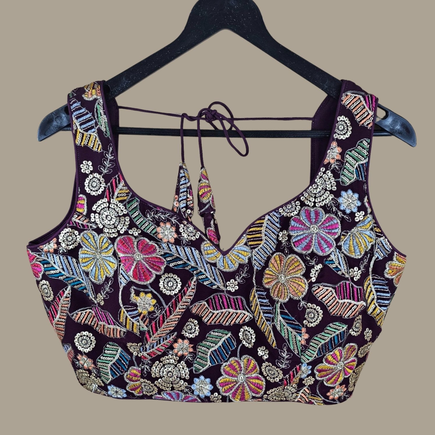 This is a richly embroidered blouse featuring vibrant floral and leaf motifs in multicolored thread and sequins on a Purple base. The sleeveless cut and deep neckline lend a festive flair, perfect for weddings, sangeet, or statement ethnic ensembles.