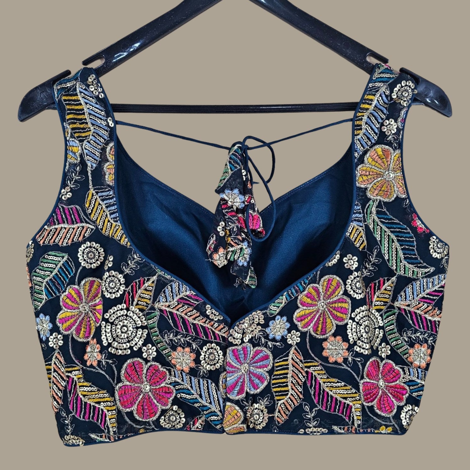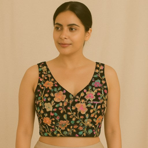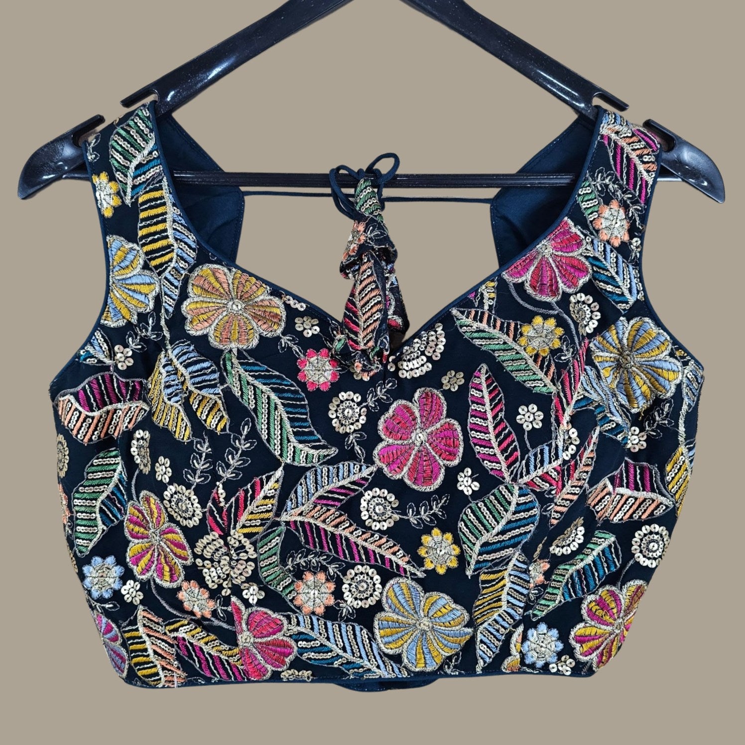 This is a richly embroidered blouse featuring vibrant floral and leaf motifs in multicolored thread and sequins on a Firozi base. The sleeveless cut and deep neckline lend a festive flair, perfect for weddings, sangeet, or statement ethnic ensembles.