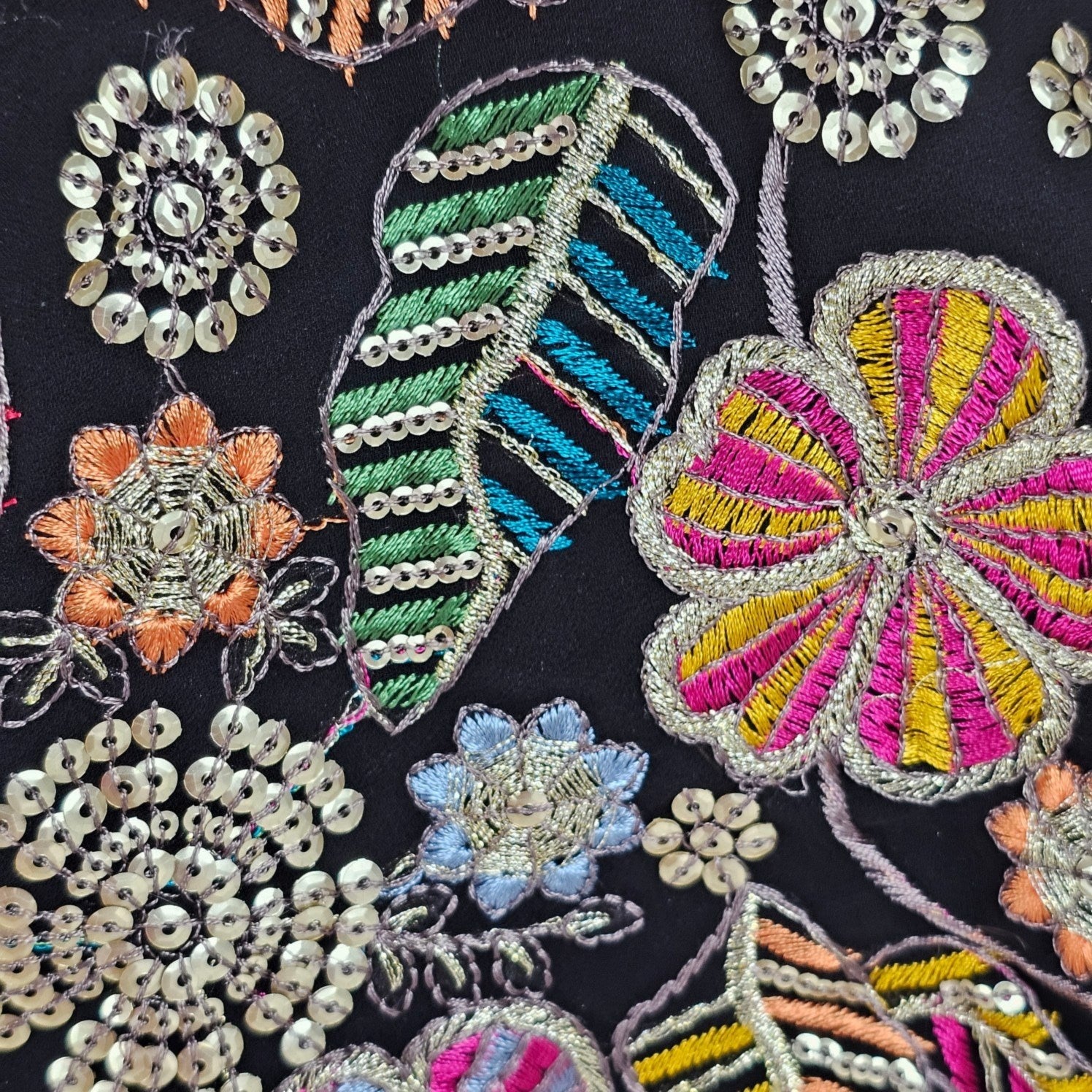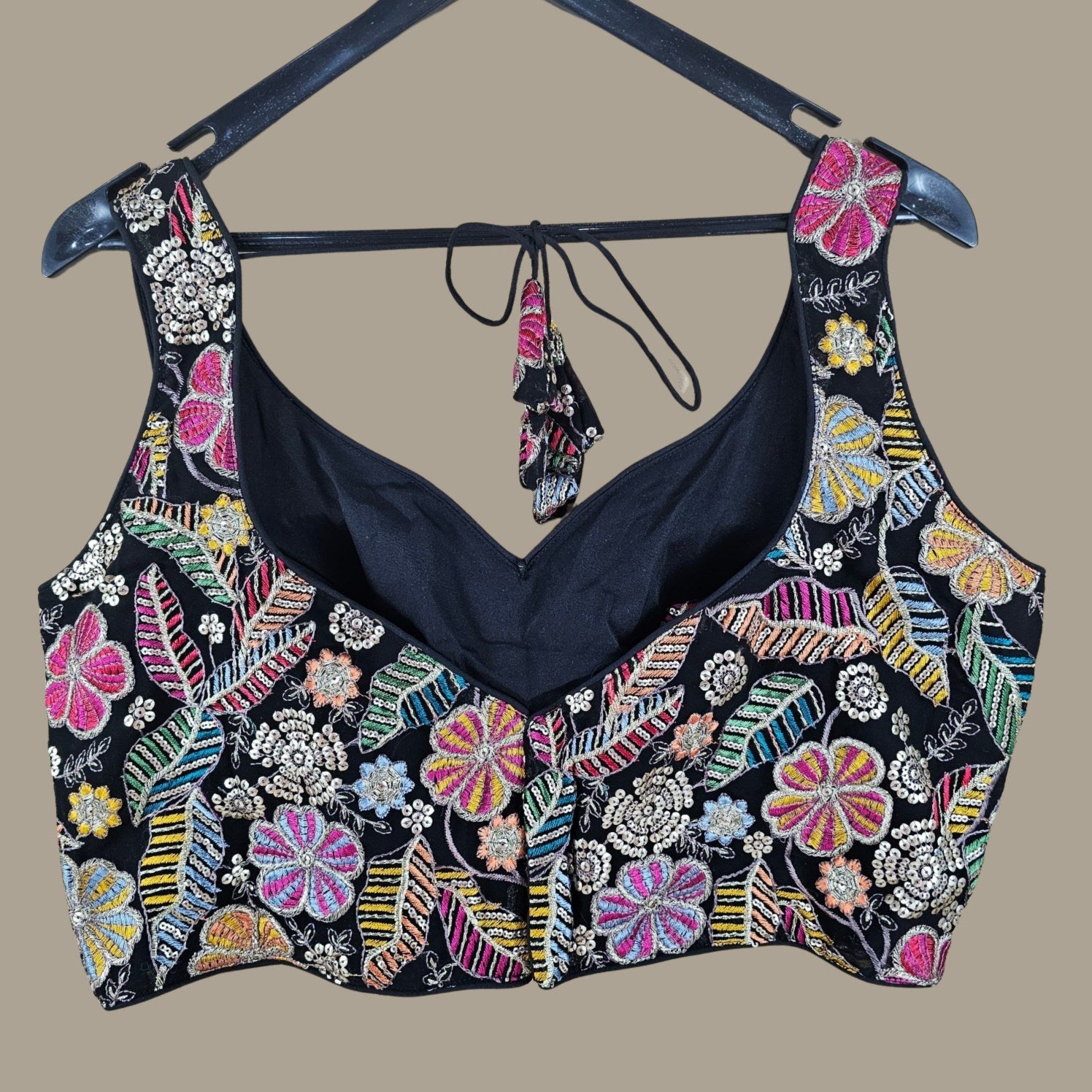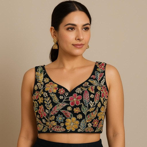 This is a richly embroidered blouse featuring vibrant floral and leaf motifs in multicolored thread and sequins on a black base. The sleeveless cut and deep neckline lend a festive flair, perfect for weddings, sangeet, or statement ethnic ensembles.