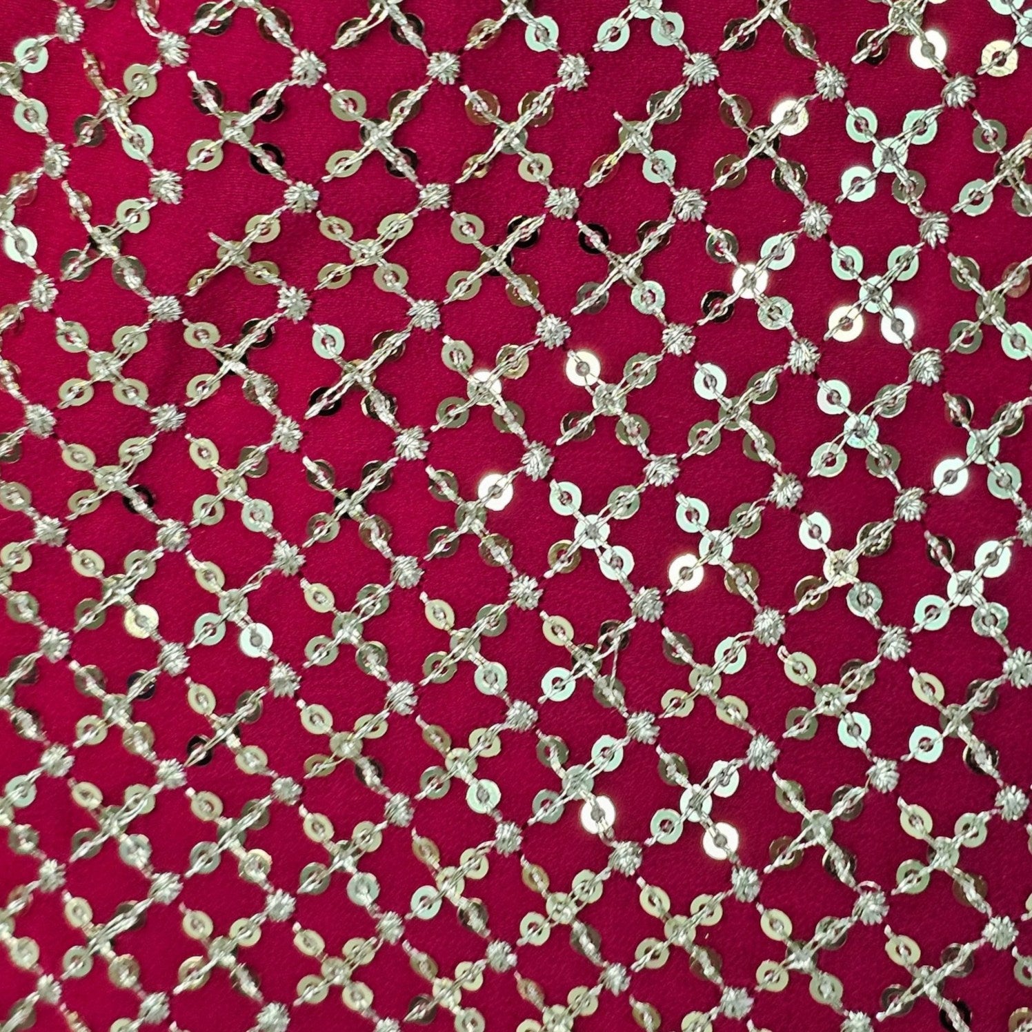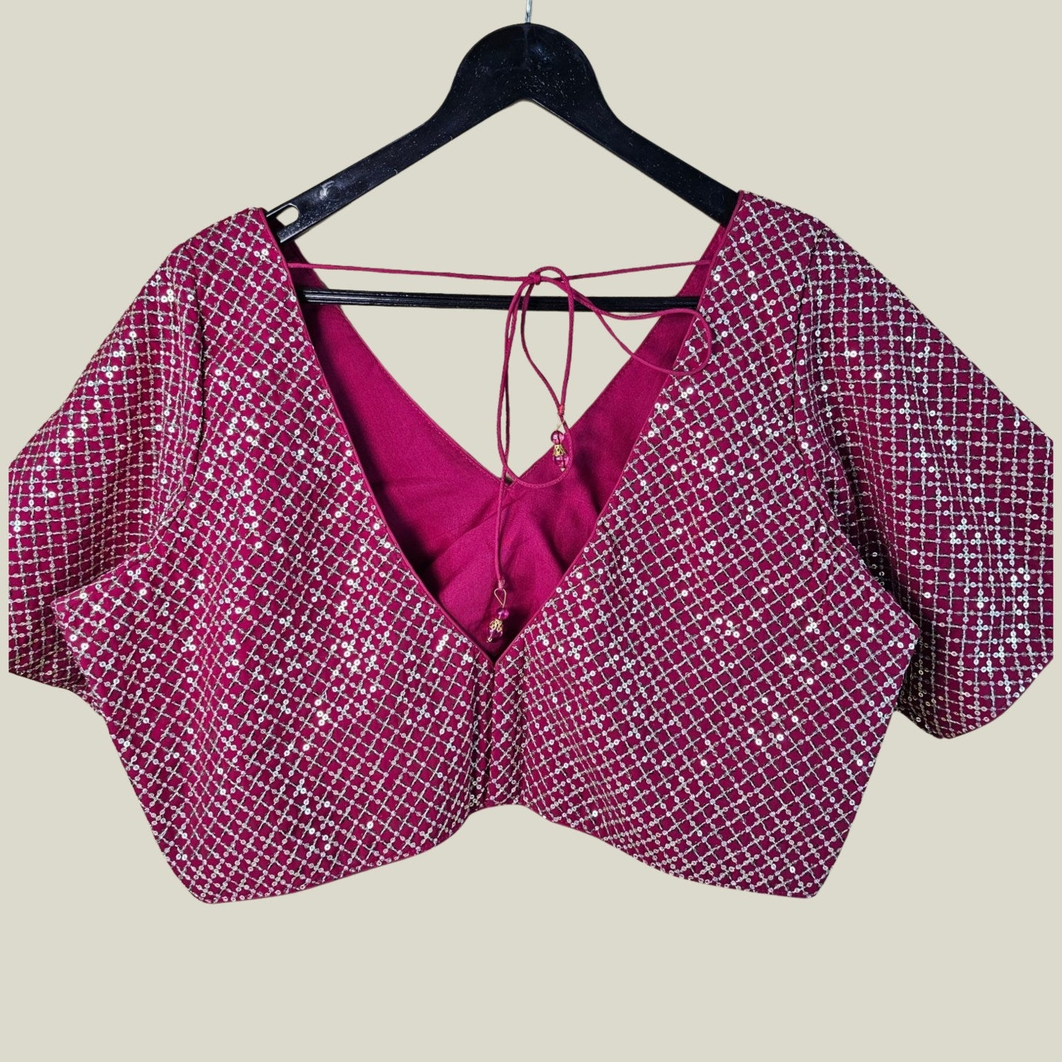 This elegant sequin-embellished blouse with a V-neckline and short sleeves. The shimmering silver grid pattern on a rich magenta pink color base adds a bold and festive flair, making them ideal for evening functions, receptions, or celebratory events.