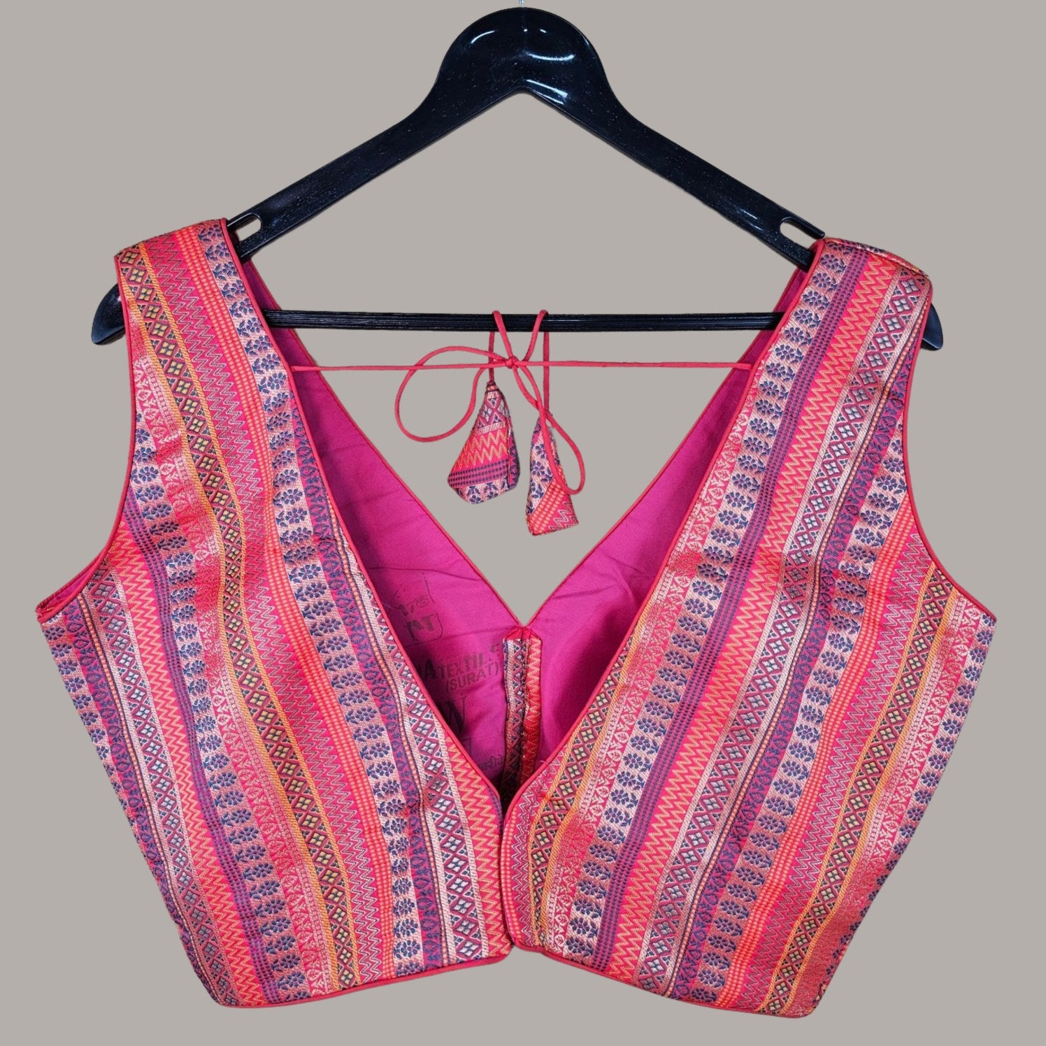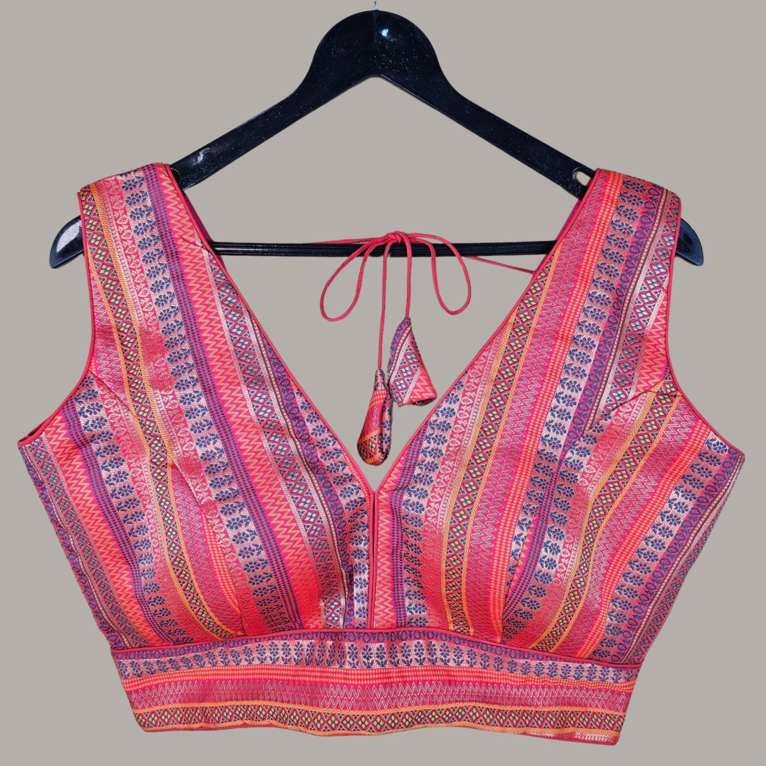 This blouse features a richly woven fabric with intricate geometric and floral patterns in shades of pink, blue, and gold. The structured silhouette, highlighted by round and V neckline and back tie, exudes traditional elegance
