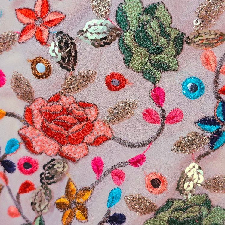 Intricate multicolored floral embroidery with sequin embellishments. The sweetheart neckline and sleeveless design add a touch of elegance, making it a perfect choice for festive and traditional events.