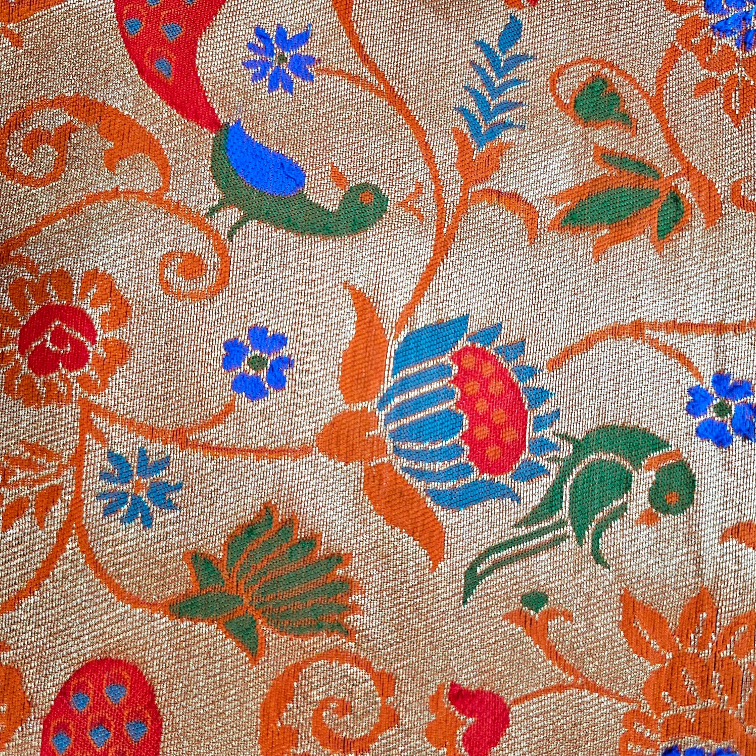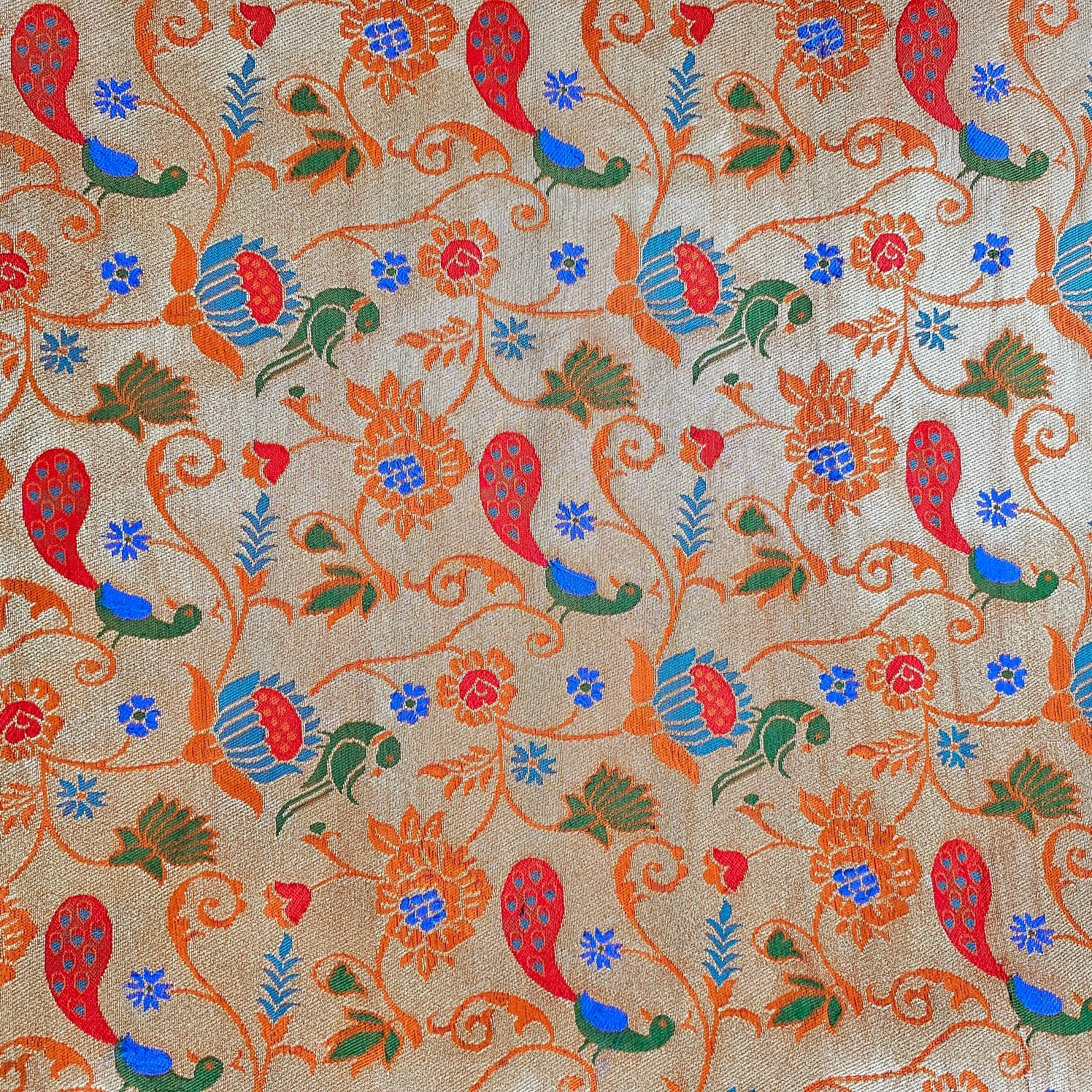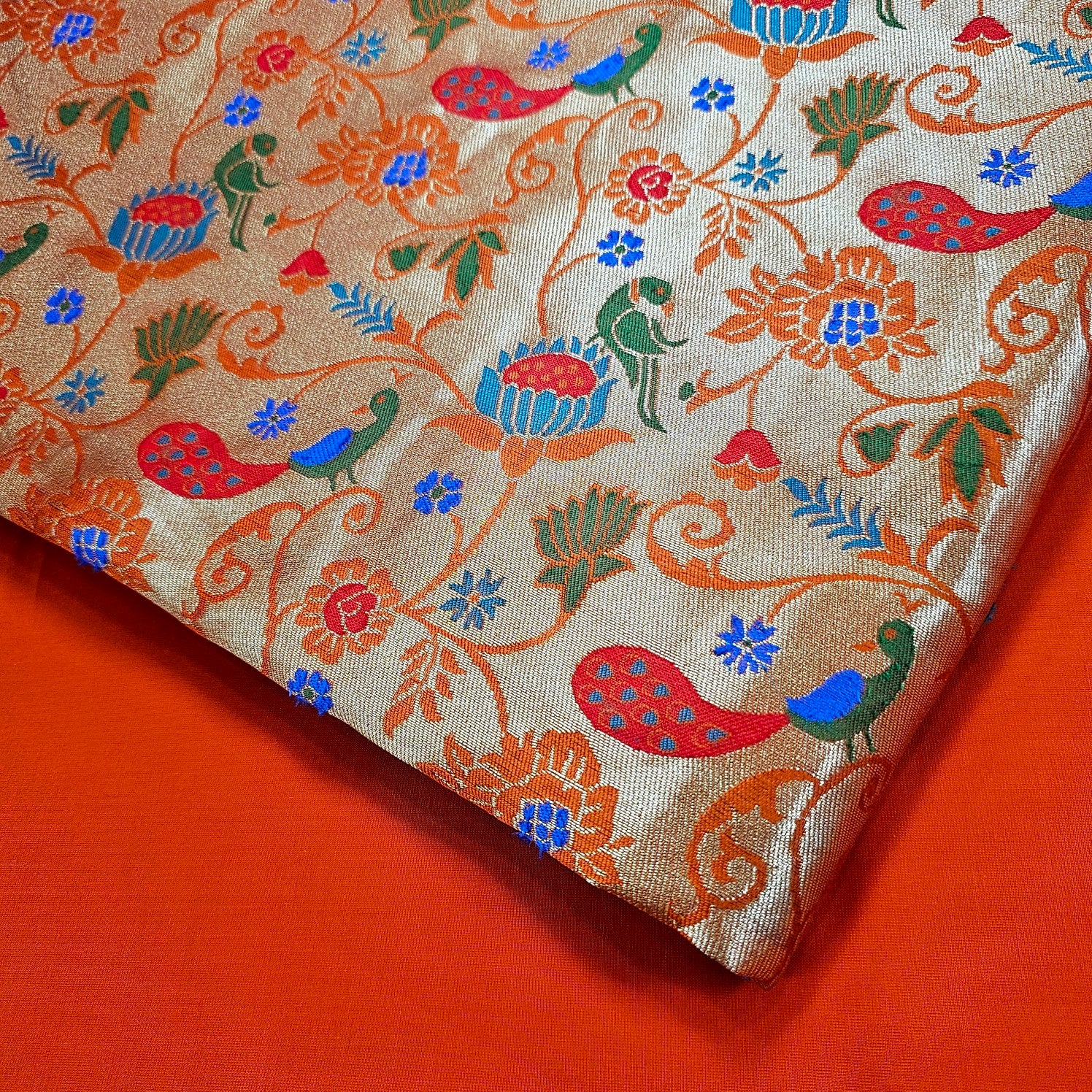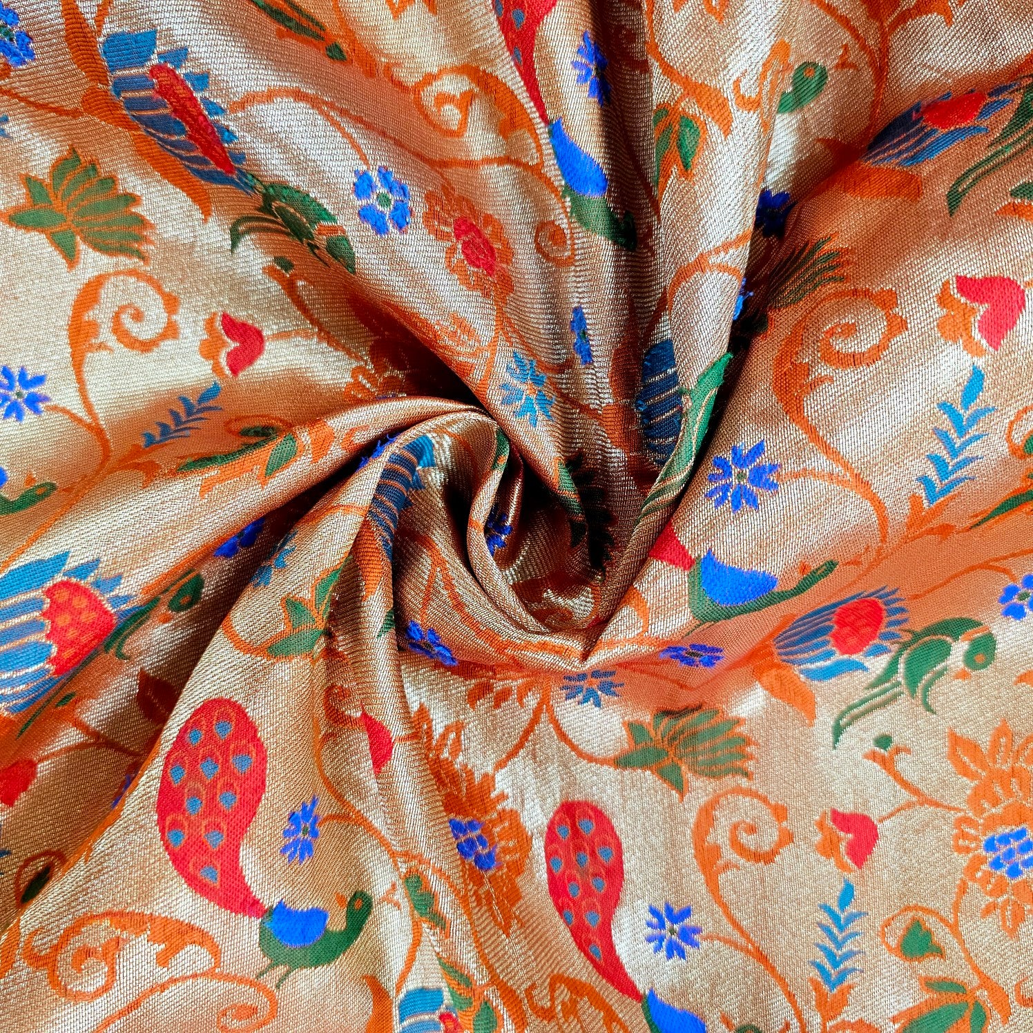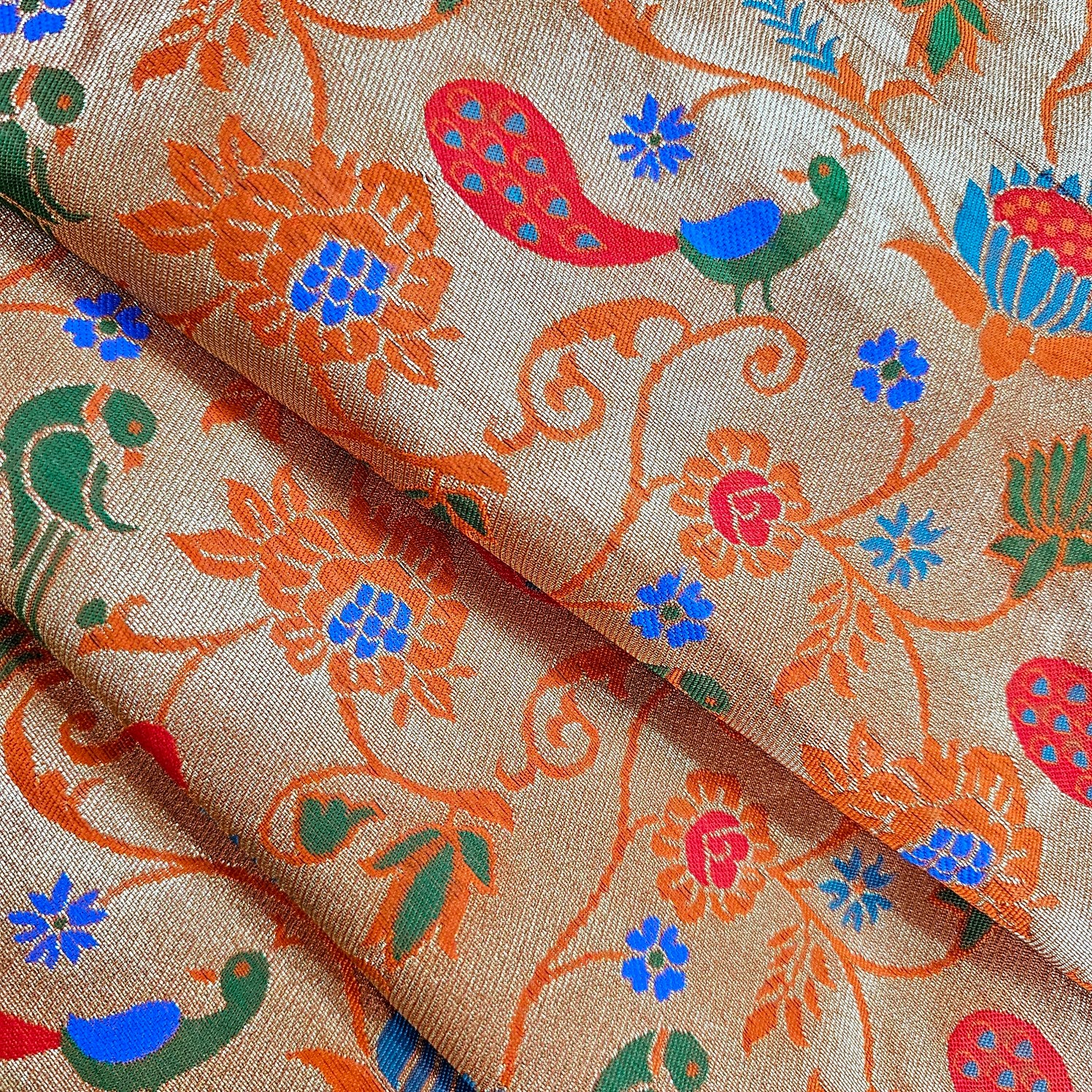 Elegant Paithani brocade fabric in a rich golden base, adorned with intricate floral, lotus and peacock motifs in vibrant hues. The luxurious silk-blend weave showcases traditional craftsmanship, perfect for ethnic and festive wear.