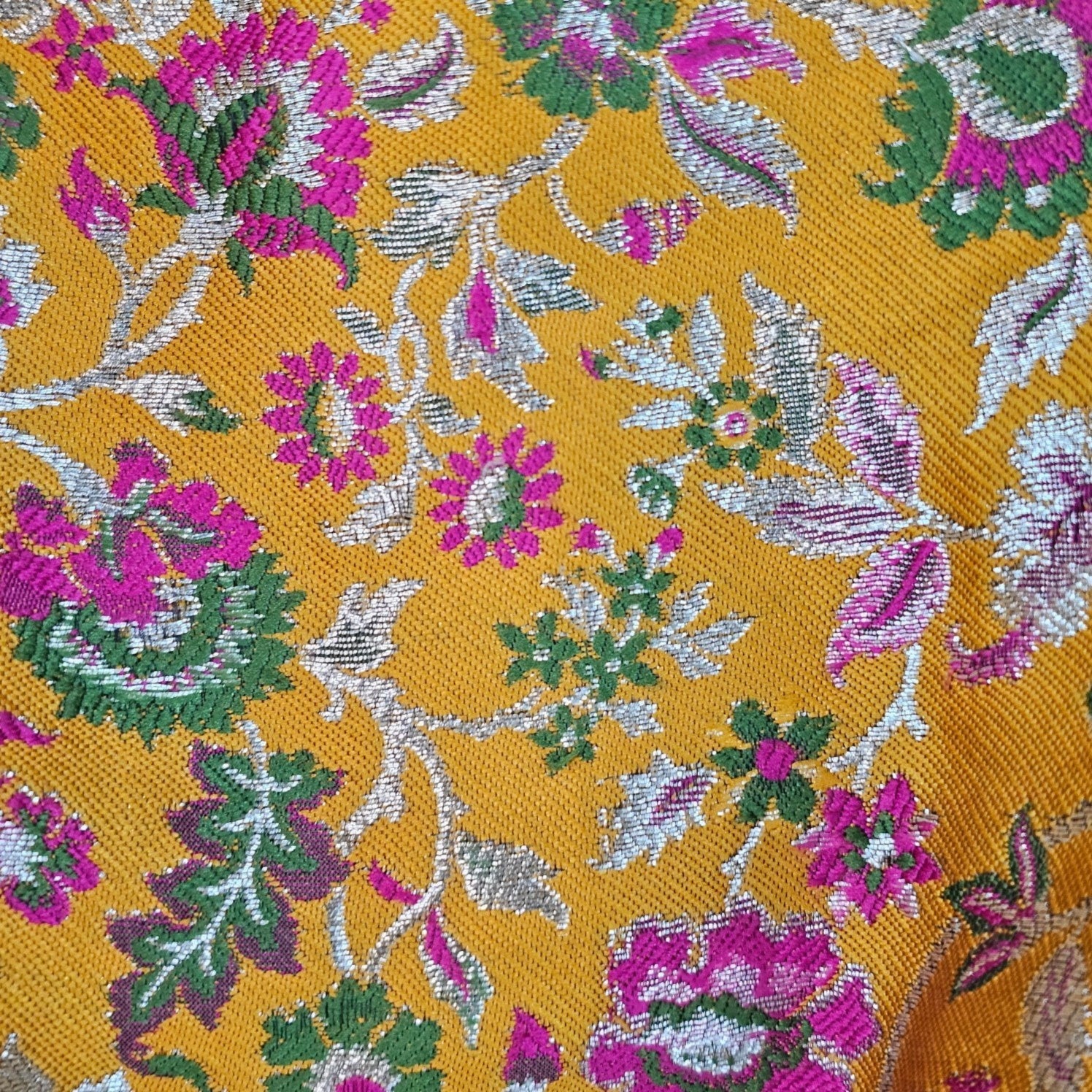This floral Banaras brocade blouse exudes grace with its intricate multi-color woven floral motifs and luxurious sheen. The classic round front neckline offers a timeless appeal, while the matka-style back neck adds a touch of elegance, making it perfect for festive and traditional wear.