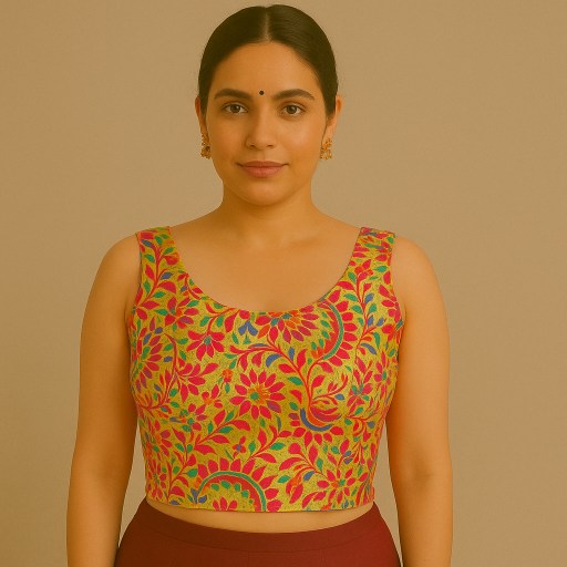 This Paithani blouse showcases the timeless elegance of traditional weaving, adorned with intricate motifs and a rich texture. The classic round neckline enhances its graceful appeal, making it a perfect complement to festive and ethnic ensembles.