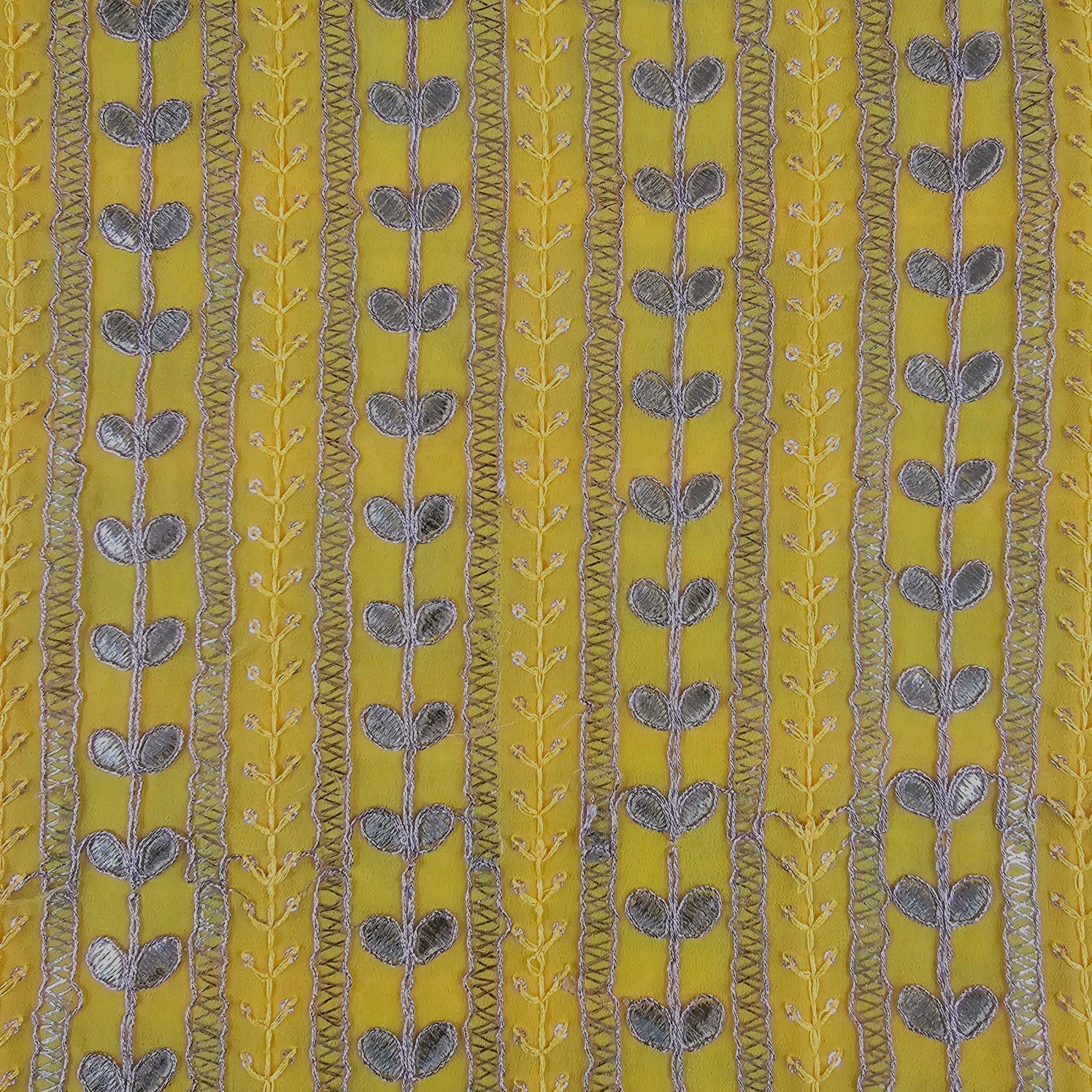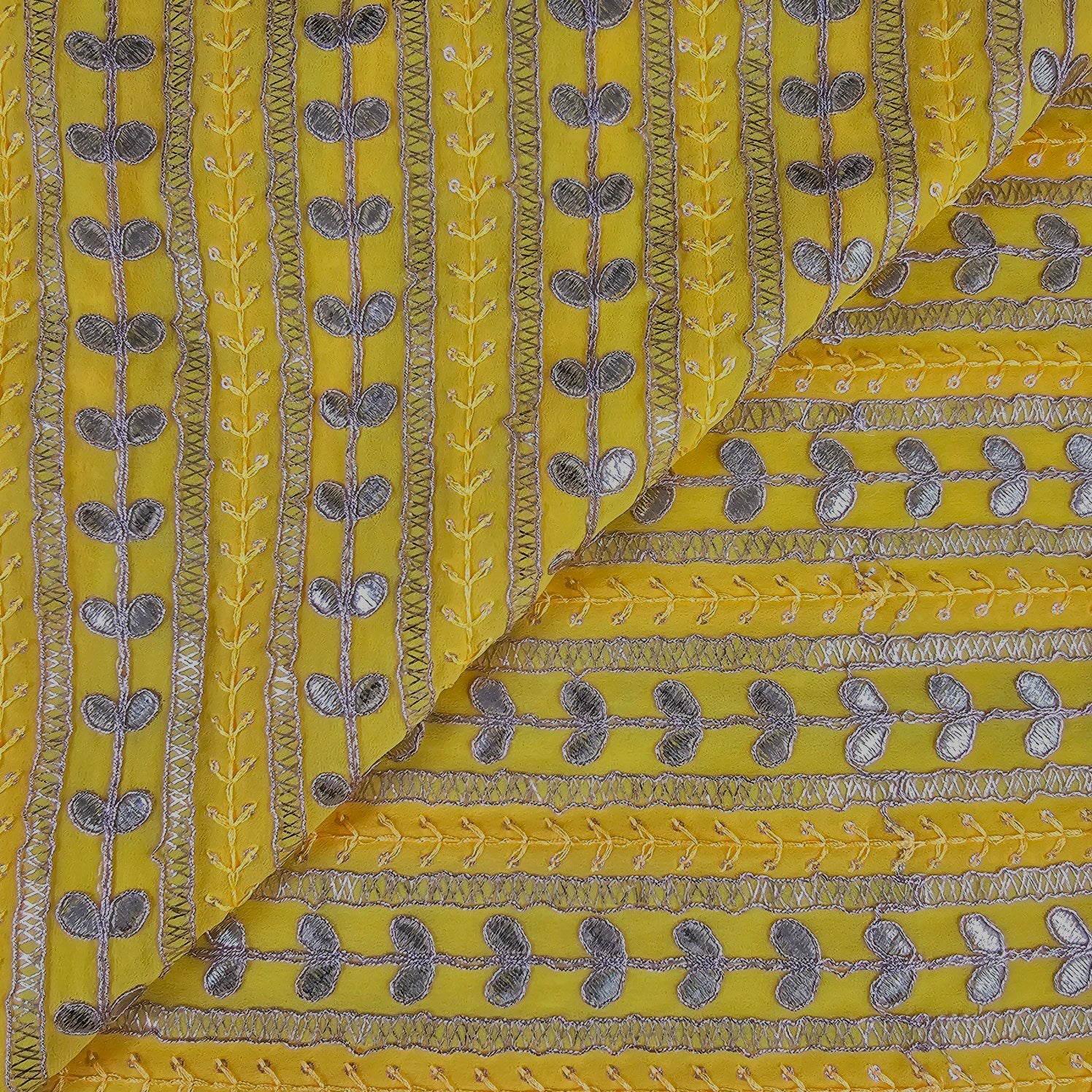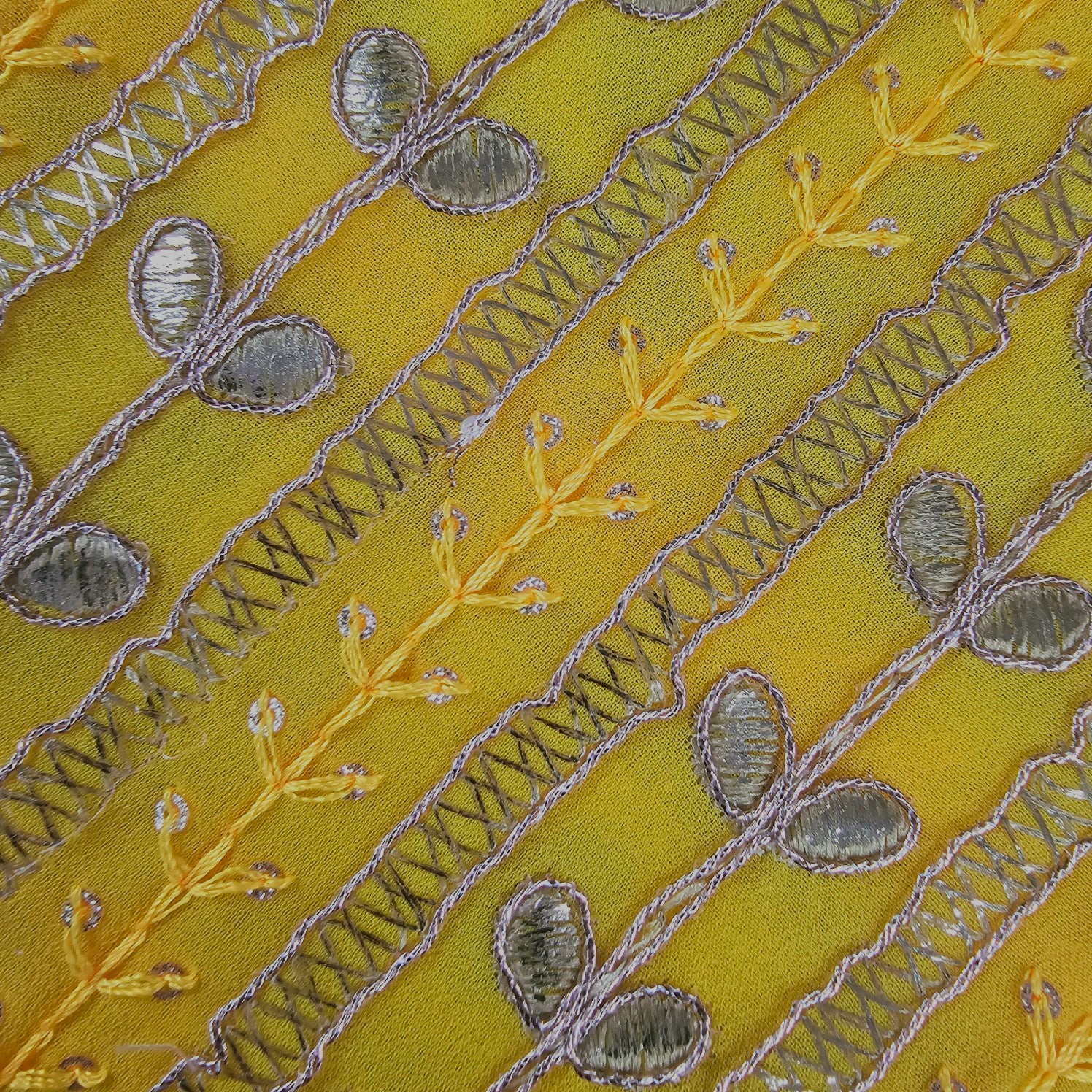Exquisite georgette fabric adorned with intricate golden gota work, adding a regal touch to any outfit. The lightweight, flowy texture of georgette complements the shimmering embellishments, making it perfect for festive and bridal ensembles. Ideal for sarees, lehengas, dupattas, and elegant ethnic wear.