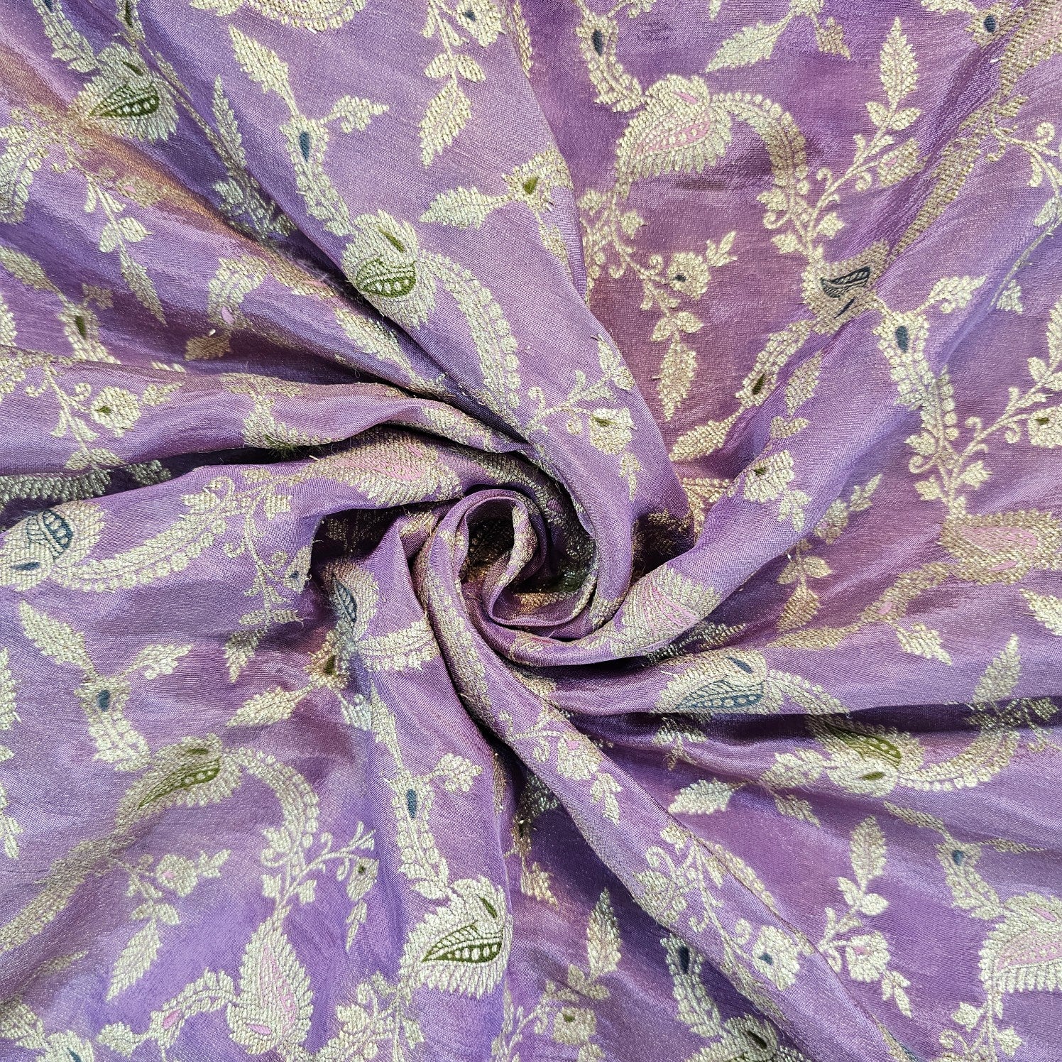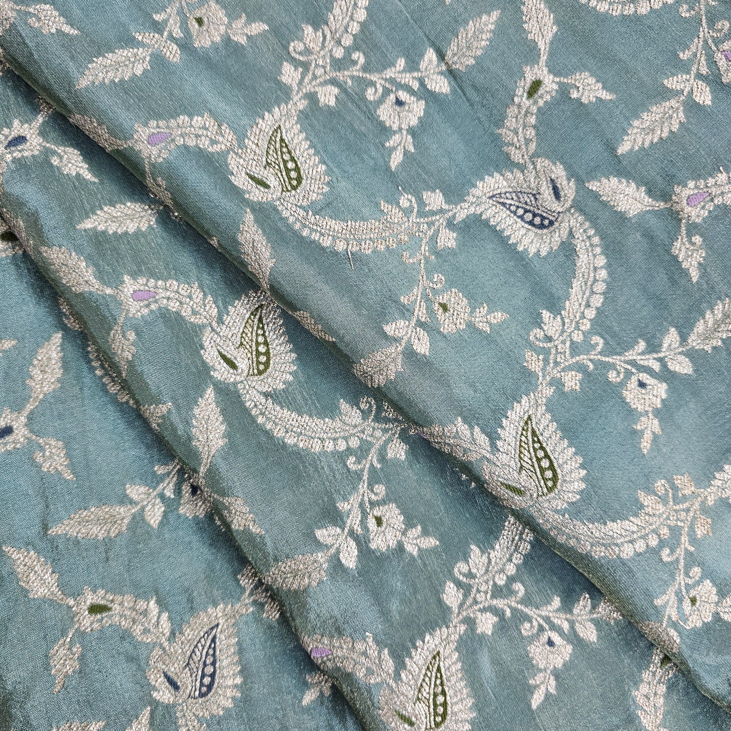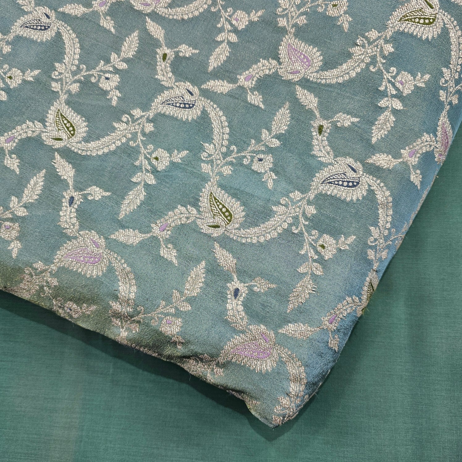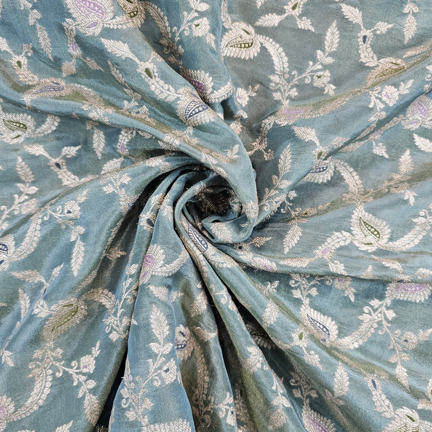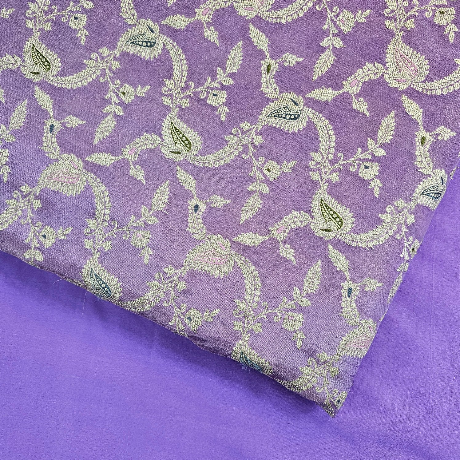 A luxurious Banarasi brocade fabric featuring intricate paisley and floral motifs woven with fine zari and resham threads. The exquisite weaving technique adds depth and elegance, making it a perfect choice for ethnic and festive wear.