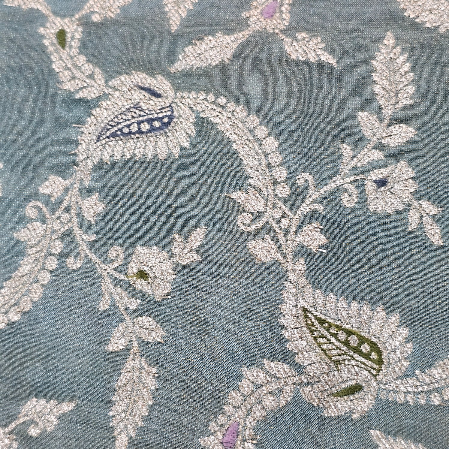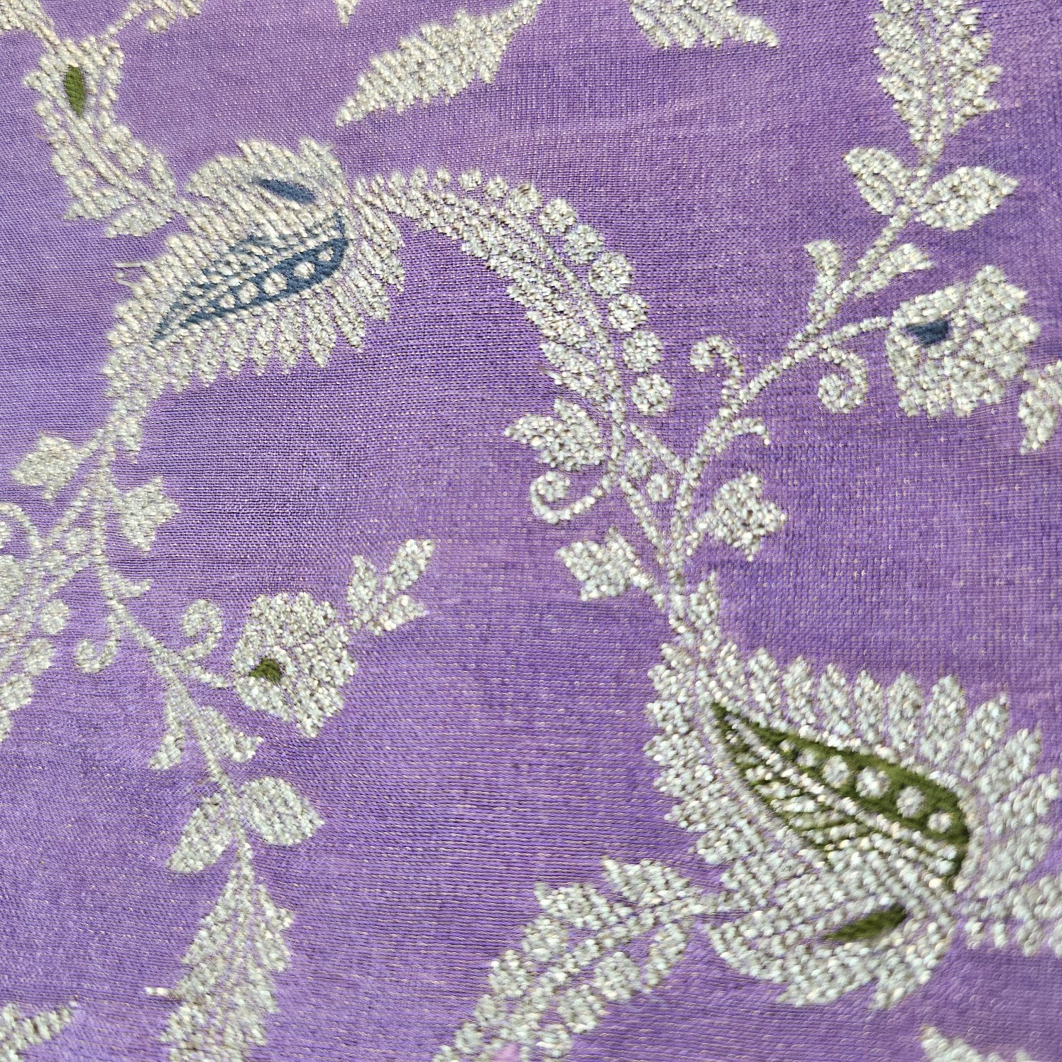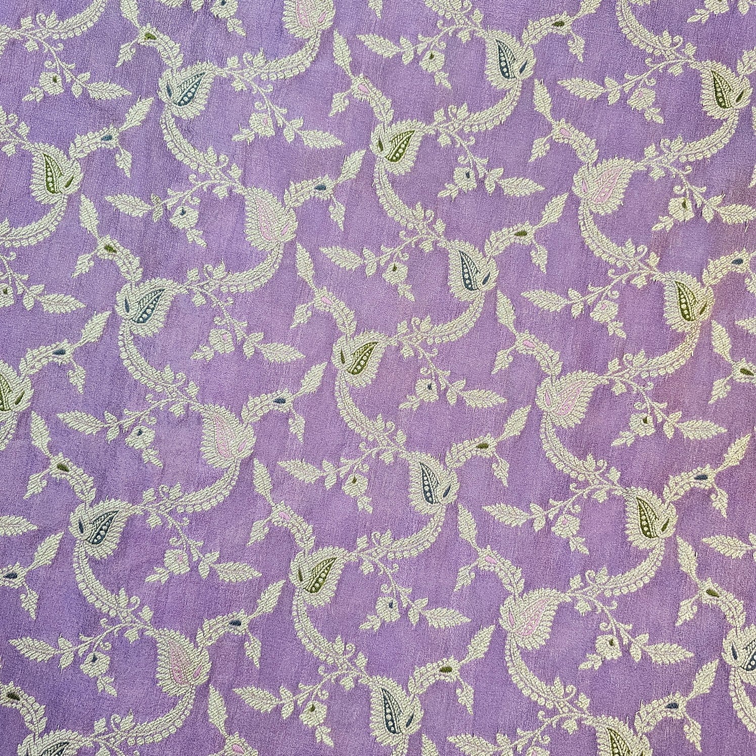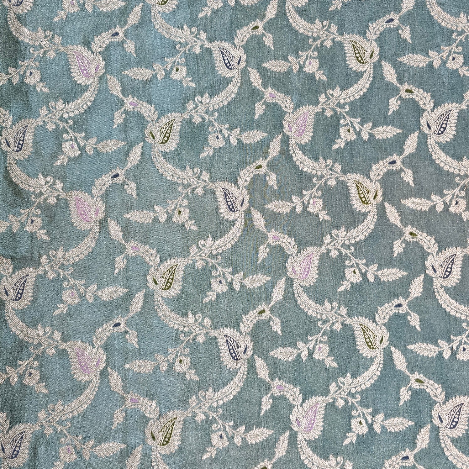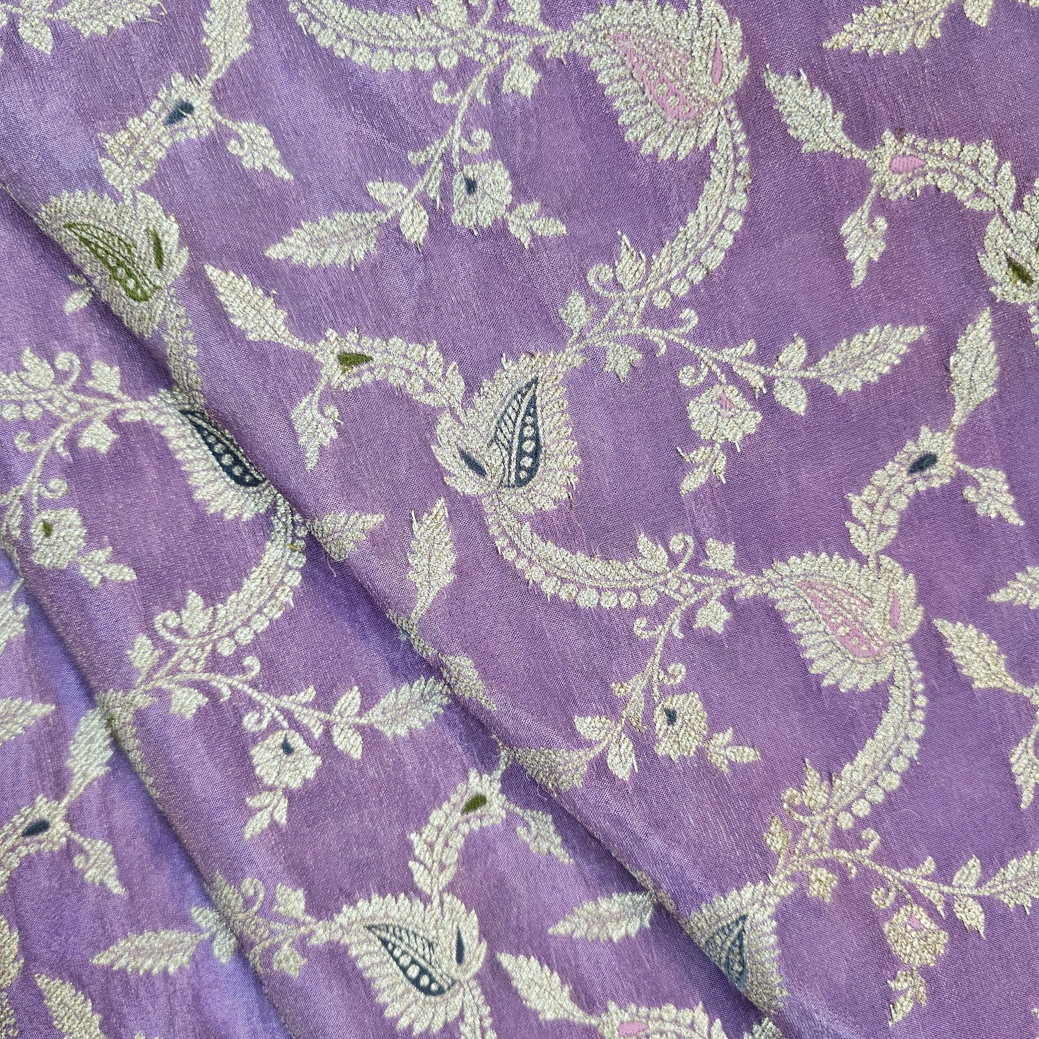 A luxurious Banarasi brocade fabric featuring intricate paisley and floral motifs woven with fine zari and resham threads. The exquisite weaving technique adds depth and elegance, making it a perfect choice for ethnic and festive wear.