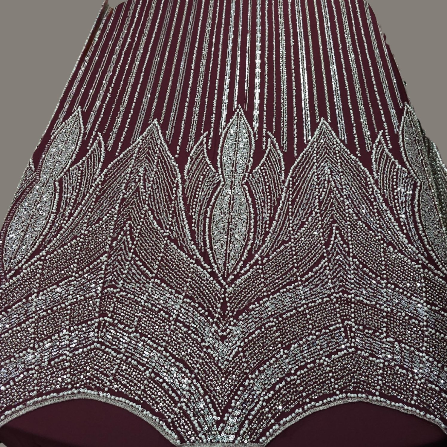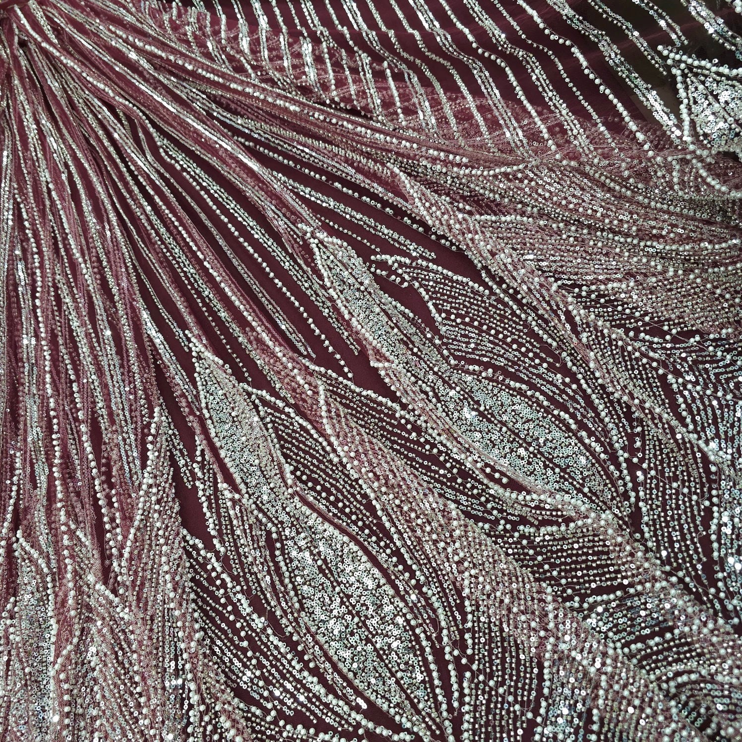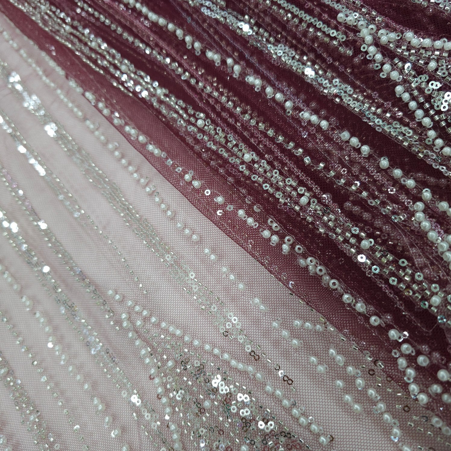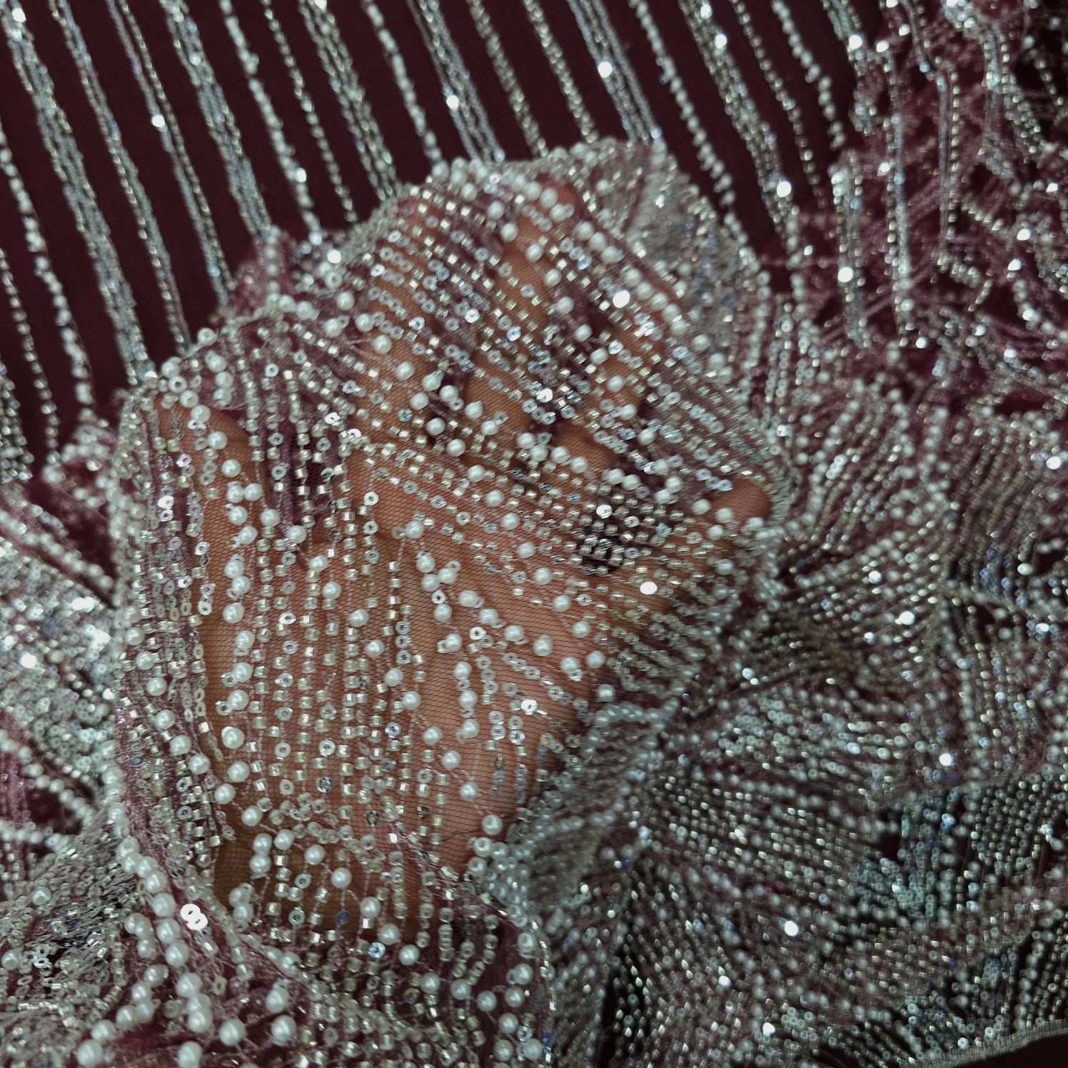 Elegant Light Plum Net Fabric (Light Maroon) with intricate sequin and bead embroidery, creating a shimmering leaf and wave-like pattern. The fabric has a luxurious, flowing texture, making it perfect for bridal wear, gowns, and evening ensembles.