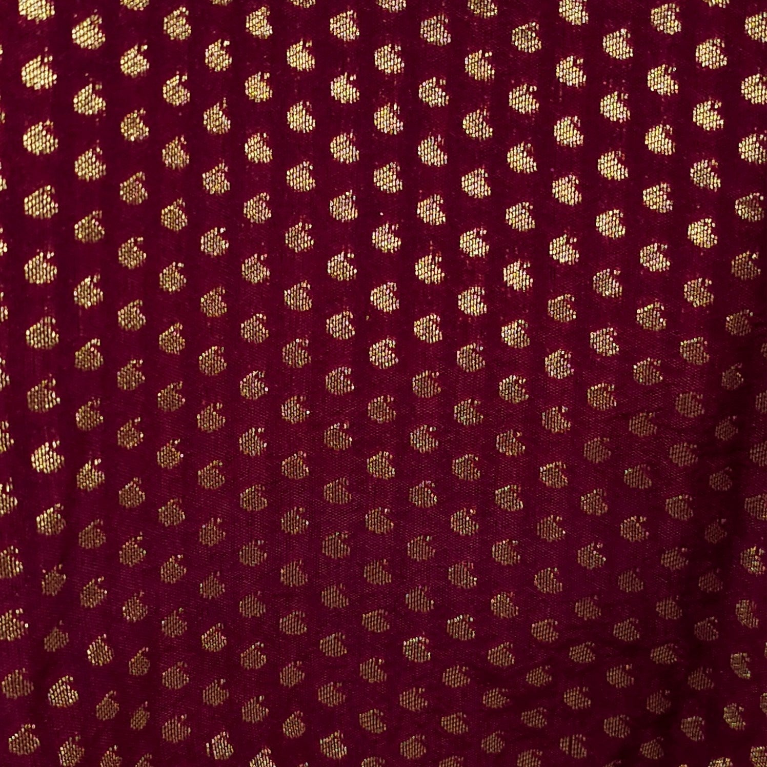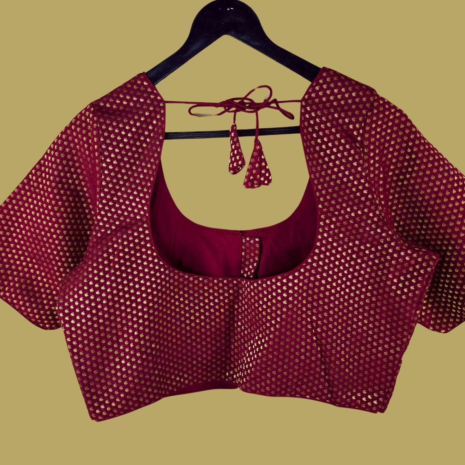 This deep maroon color blouse features all-over gold butti work, creating a rich and festive vibe. The wide round neckline and tie-up back add a traditional touch. Perfect for pairing with silk sarees or lehengas for weddings and grand celebrations.