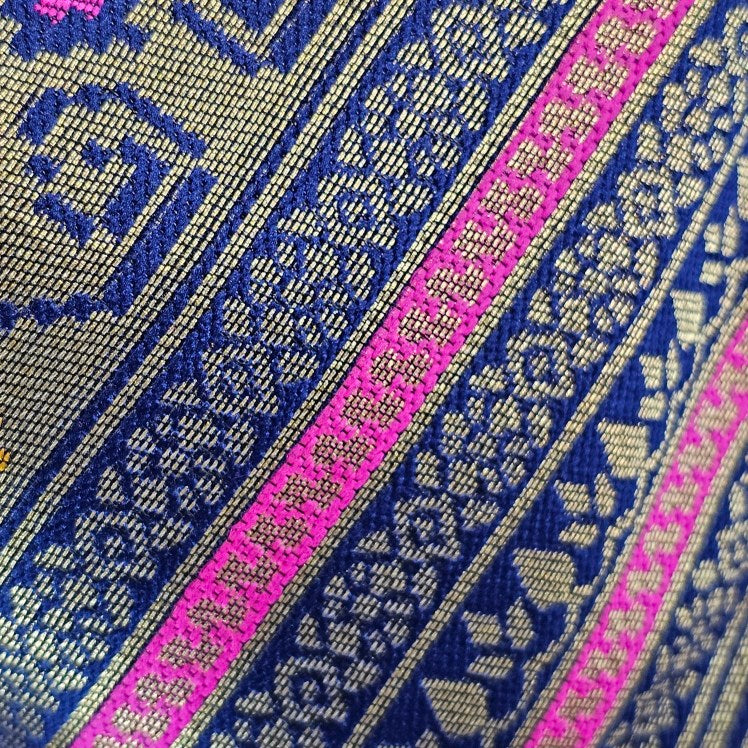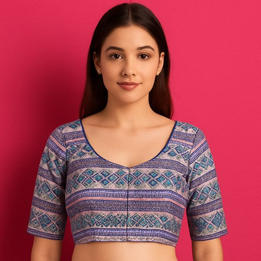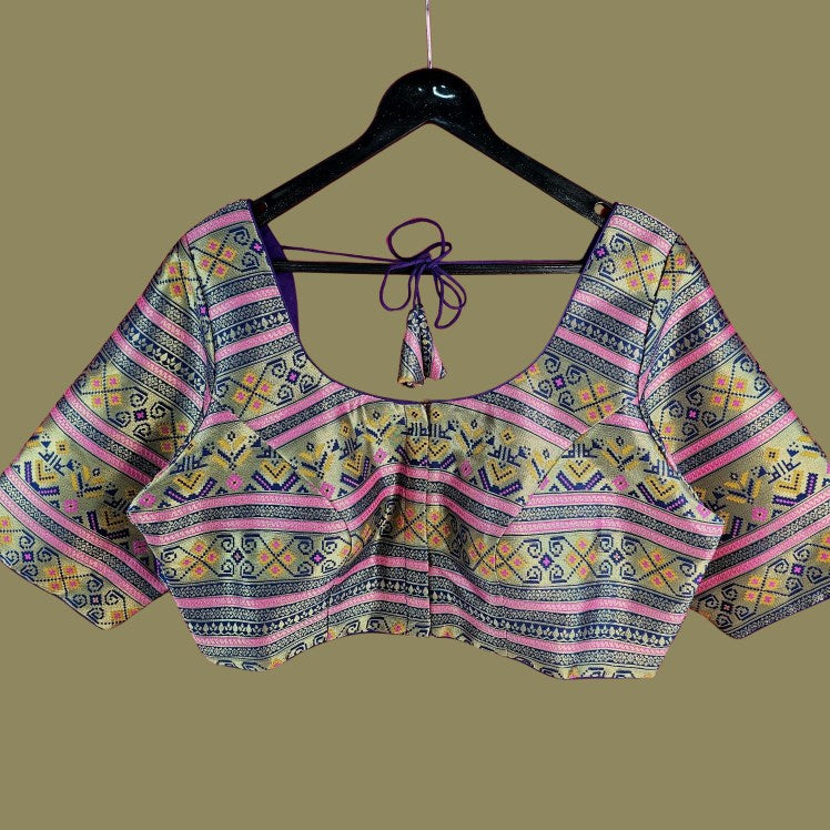 This blouse features a richly woven fabric with intricate geometric and floral patterns in shades of pink, blue, and gold. The structured silhouette, highlighted by round neckline and back tie, exudes traditional elegance