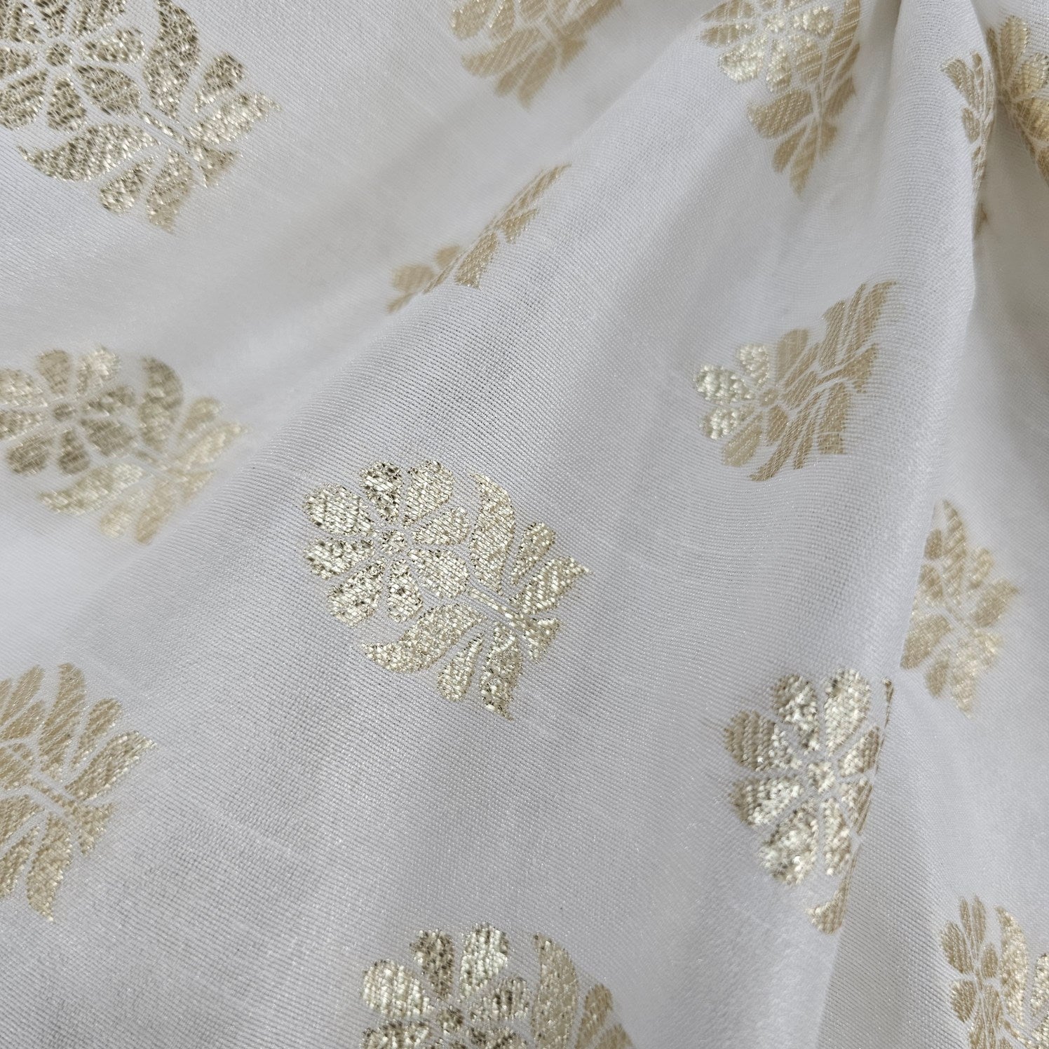 A graceful white fabric adorned with delicate gold zari butis arranged in a scattered pattern across the body. The lower portion features a heavily embroidered border with intricate floral and geometric designs, accentuated by shimmering sequins that add a touch of festive elegance. The fabric’s subtle sheen enhances its luxurious appeal, making it perfect for celebratory and ceremonial wear. Ideal for sarees, dupattas, lehengas, or festive suits.