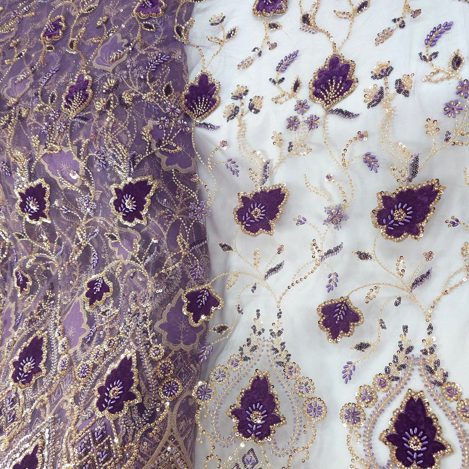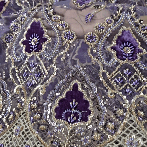 This fabric is a luxurious net base adorned with intricate floral and paisley motifs in royal violet velvet, highlighted with golden sequins, and beads. The shimmering embellishments paired with theroyal violet patchwork create a rich and regal effect, making it perfect for high-end couture, bridal, or festive wear.