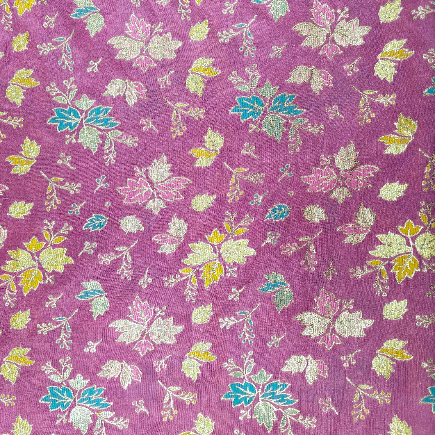 An elegant brocade-style fabric featuring pastel and jewel-toned floral motifs woven with shimmering metallic threads. Set against soft-hued or rich-toned bases, these fabrics exude subtle luxury and charm. Ideal for festive and semi-formal ethnic outfits, they blend timeless design with a modern palette. Light Pink ish purple