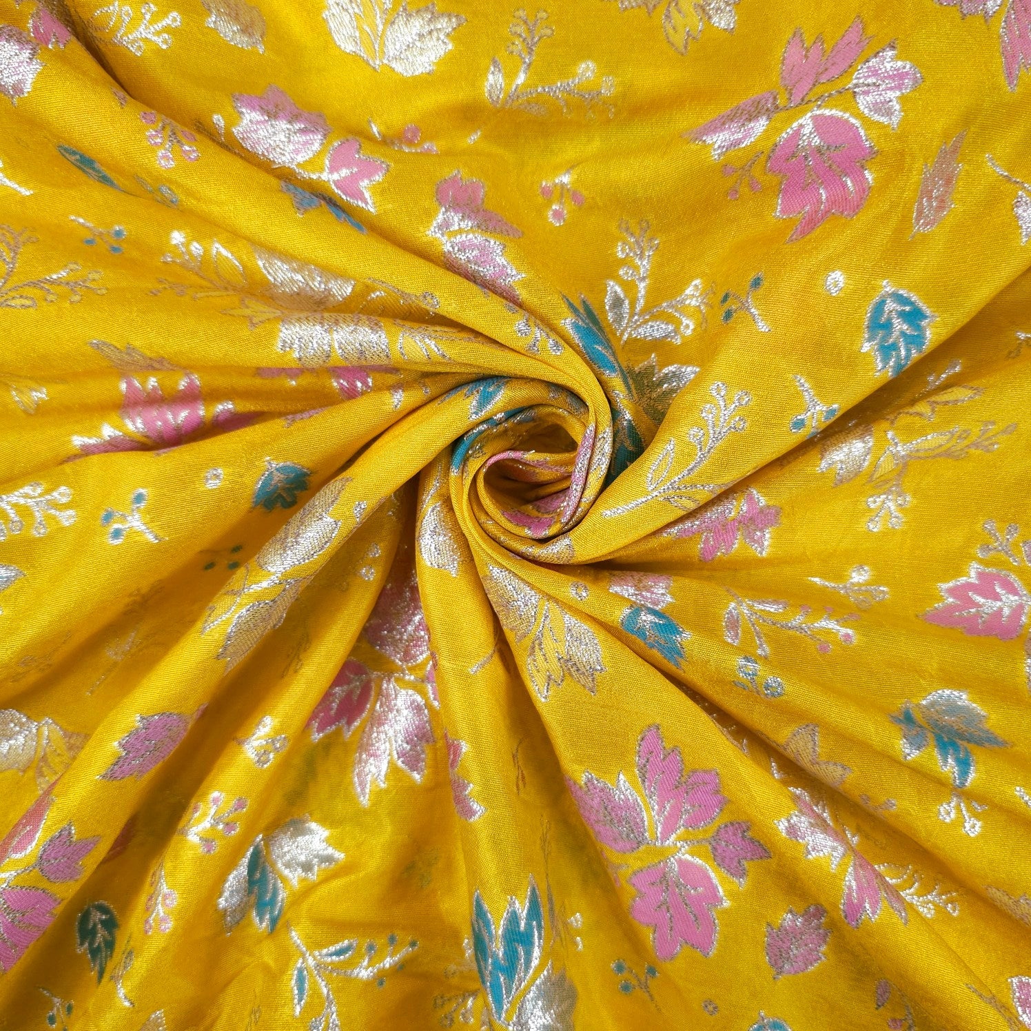 An elegant brocade-style fabric featuring pastel and jewel-toned floral motifs woven with shimmering metallic threads. Set against soft-hued or rich-toned bases, these fabrics exude subtle luxury and charm. Ideal for festive and semi-formal ethnic outfits, they blend timeless design with a modern palette.