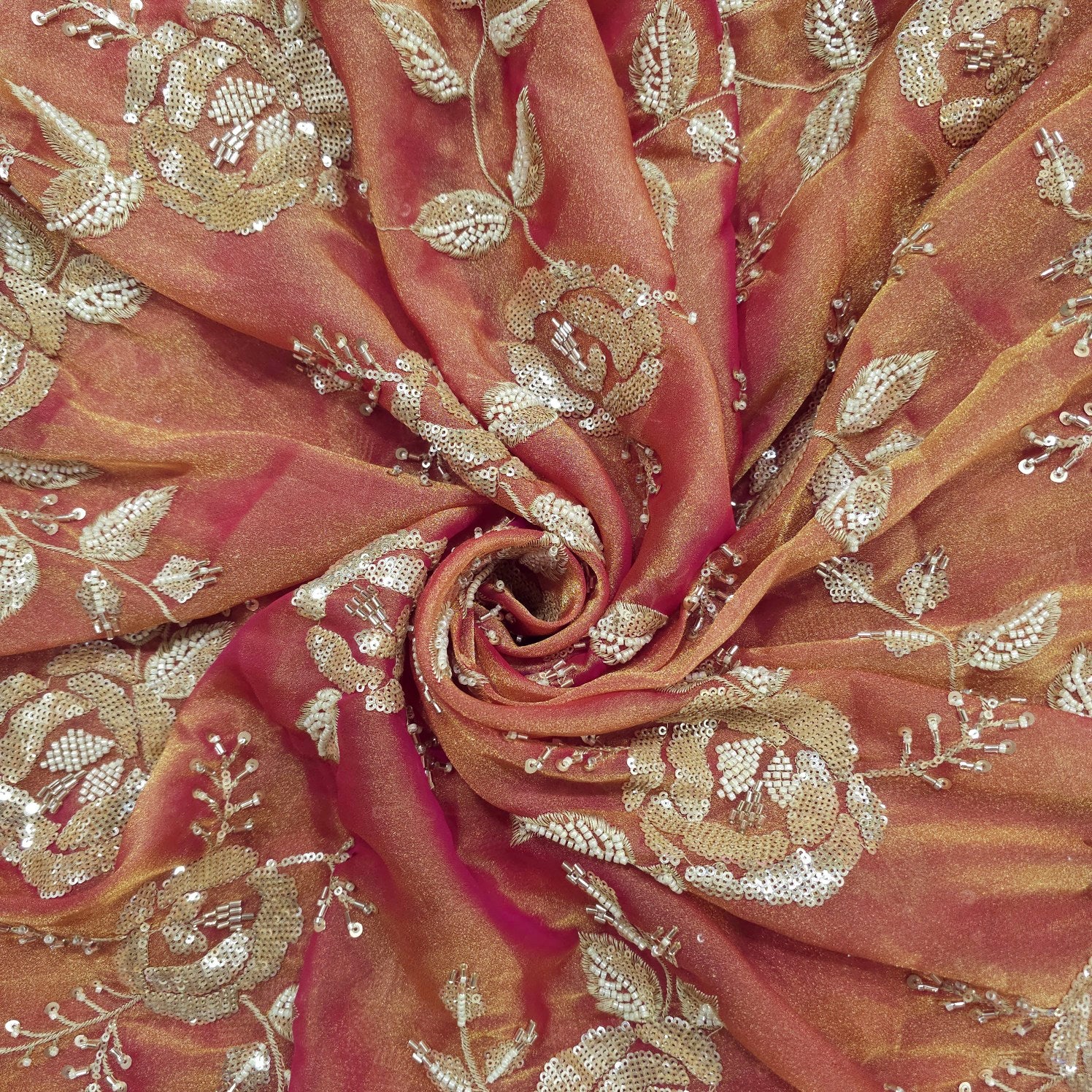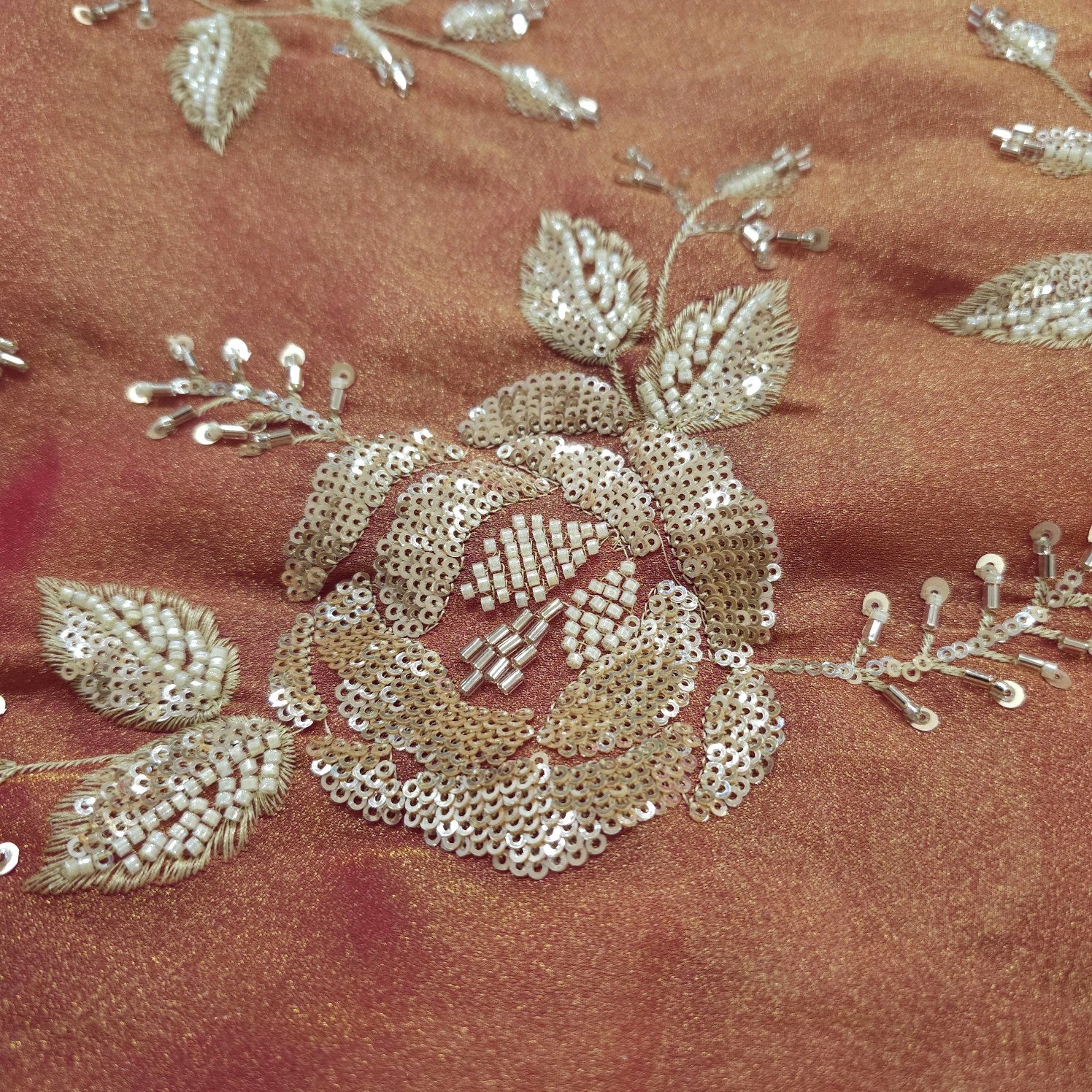 A graceful two-tone shimmer organza tissue fabric enhanced with floral embroidery in gold sequins, beads & zari work. The harmonious blend of gold and rusty peach shimmer accents offers understated luxury suited for elegant events and bridal wear.