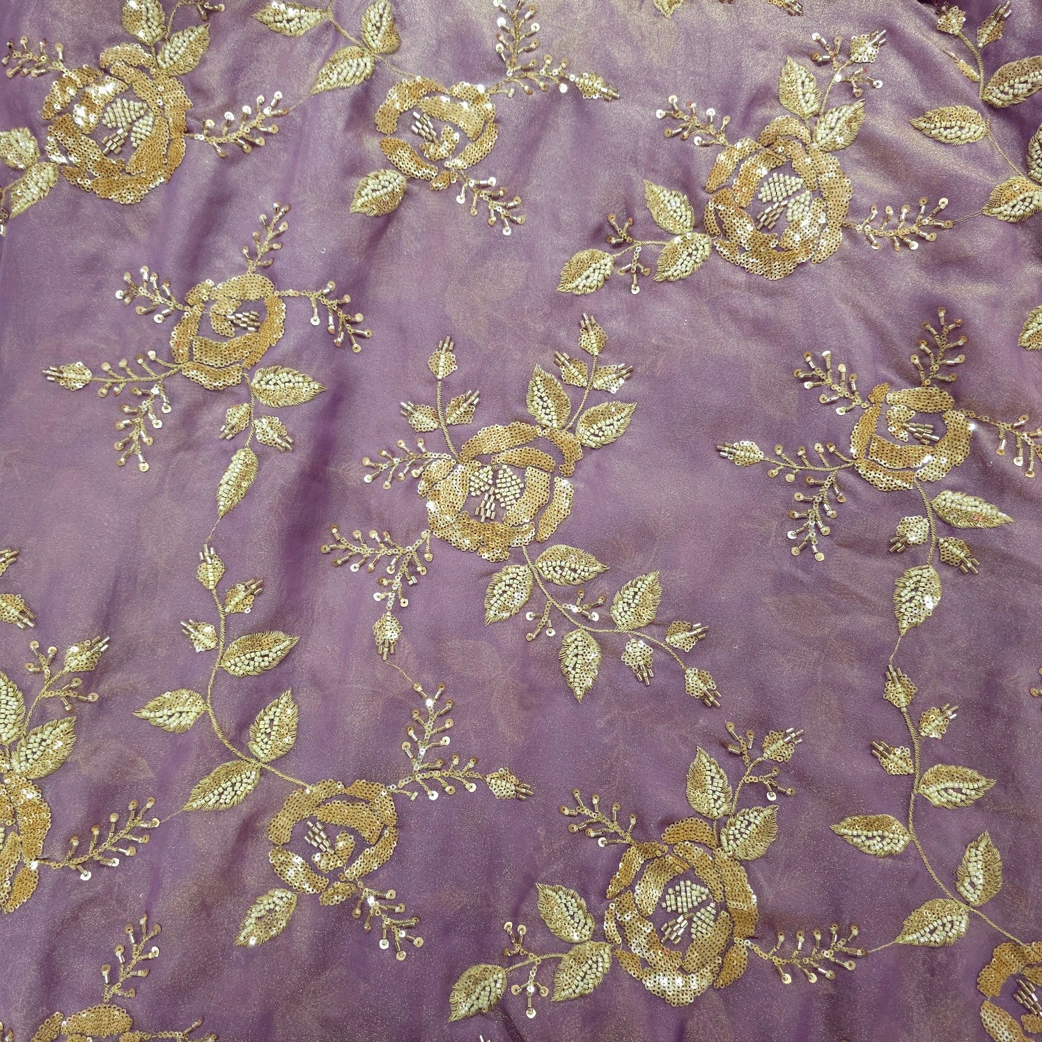 A graceful two-tone shimmer organza tissue fabric enhanced with floral embroidery in gold sequins, beads & zari work. The harmonious blend of gold and mauve shimmer accents offers understated luxury suited for elegant events and bridal wear.