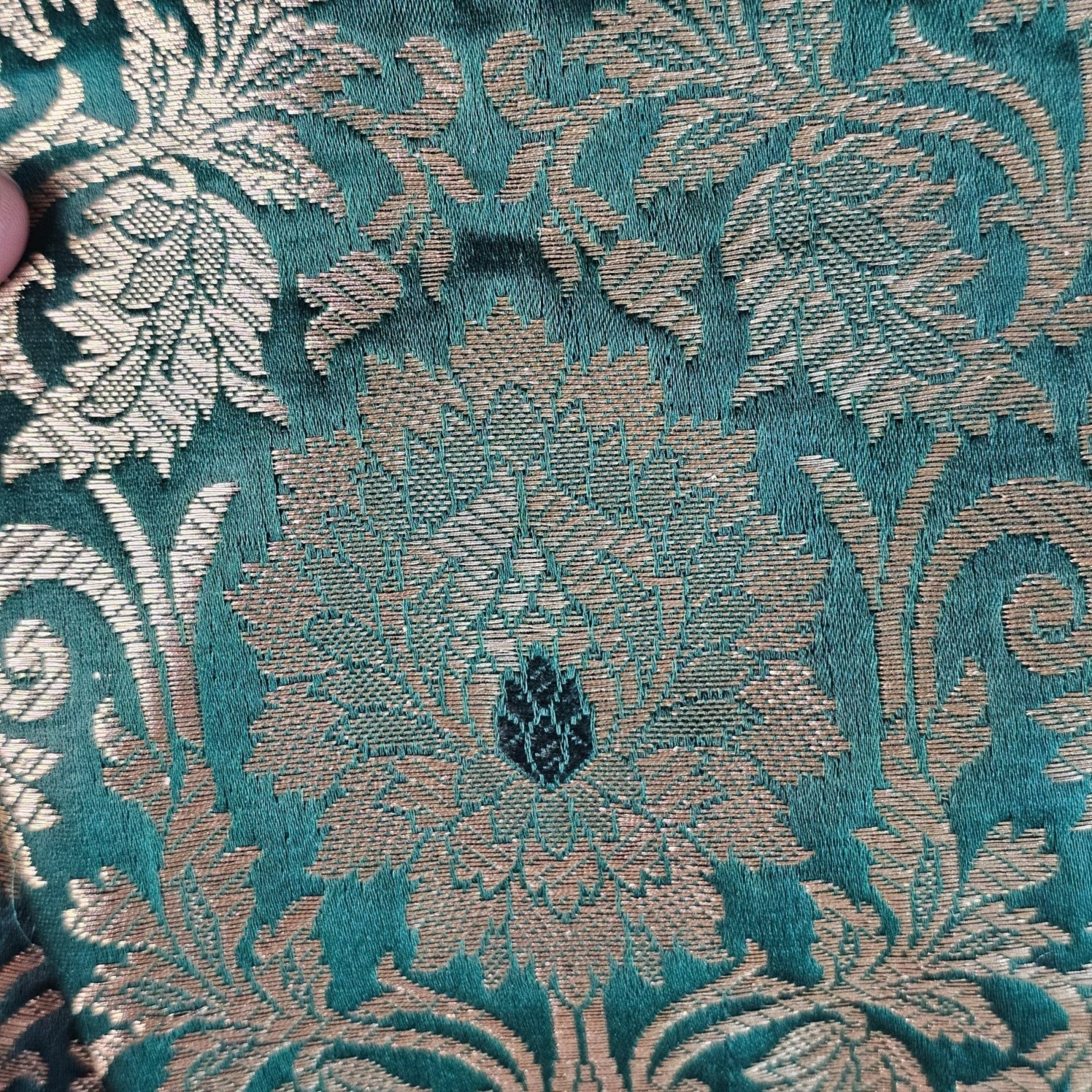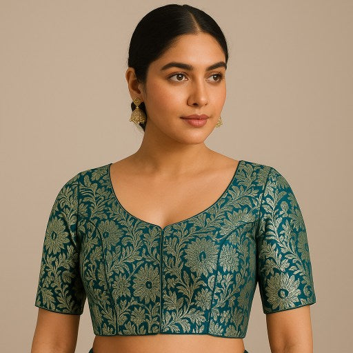 This is a elegant brocade blouse woven with intricate floral zari motifs in shimmering silver. The deep red base paired with a traditional neckline and half sleeves makes them ideal for ethnic celebrations and festive styling, perfect for weddings, receptions, and grand festive occasions.