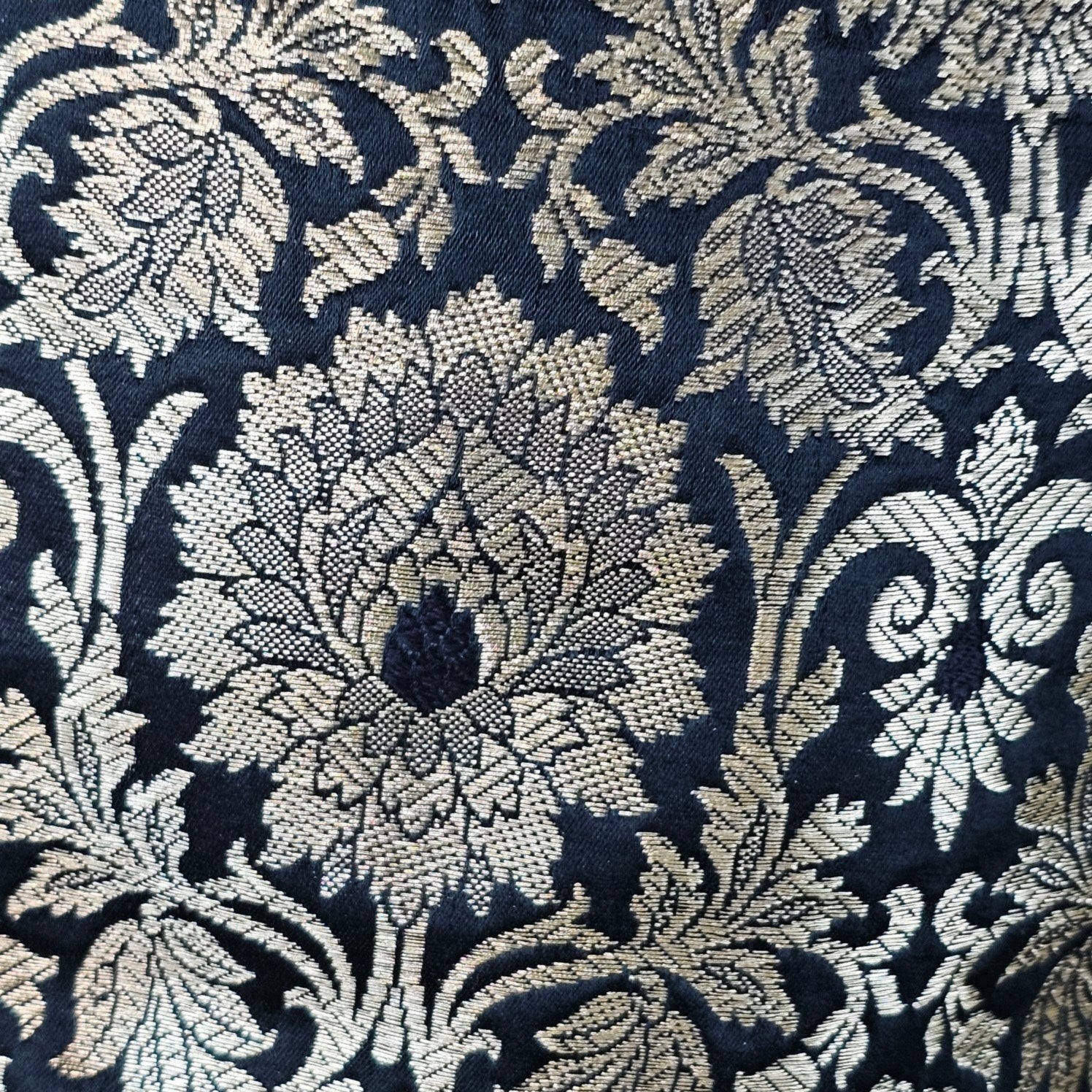 This is a elegant brocade blouse woven with intricate floral zari motifs in shimmering silver. The deep black base paired with a traditional neckline and half sleeves makes them ideal for ethnic celebrations and festive styling, perfect for weddings, receptions, and grand festive occasions.