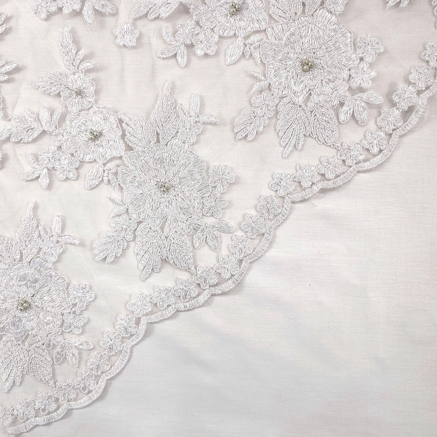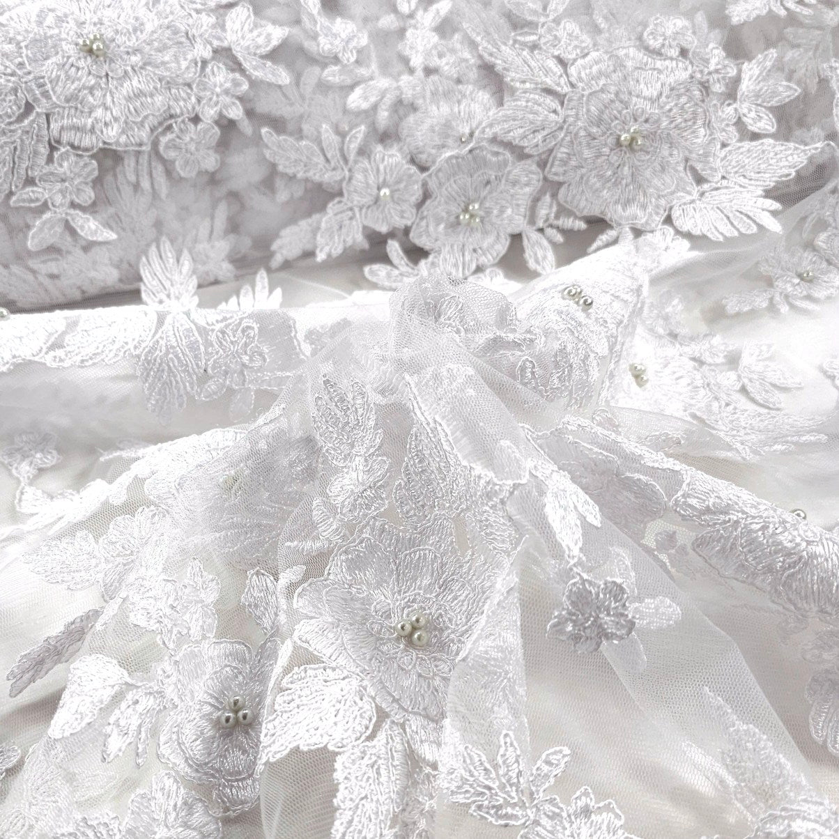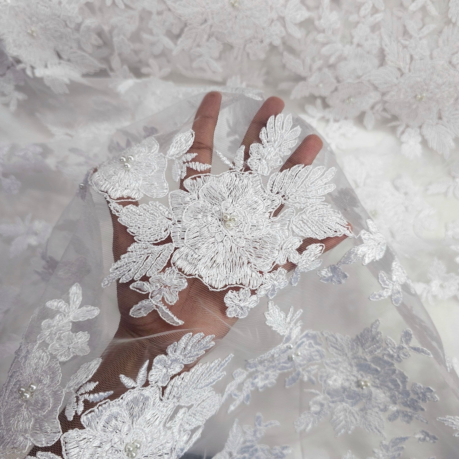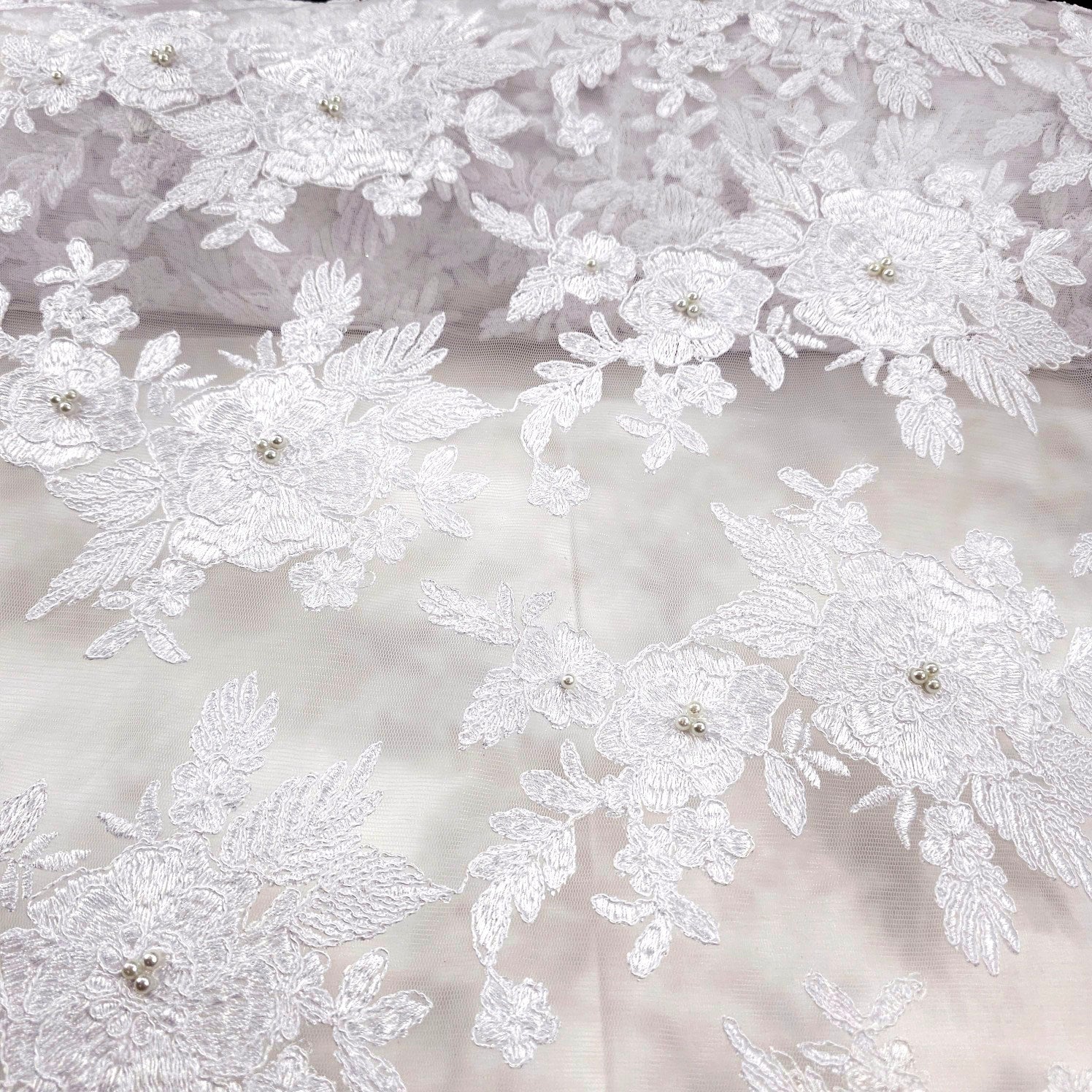 An ethereal white net fabric adorned with large, floral embroidery and delicate pearl embellishments at the center. The intricate floral clusters bloom across the sheer net base, making it a refined choice for bridal and occasion wear.