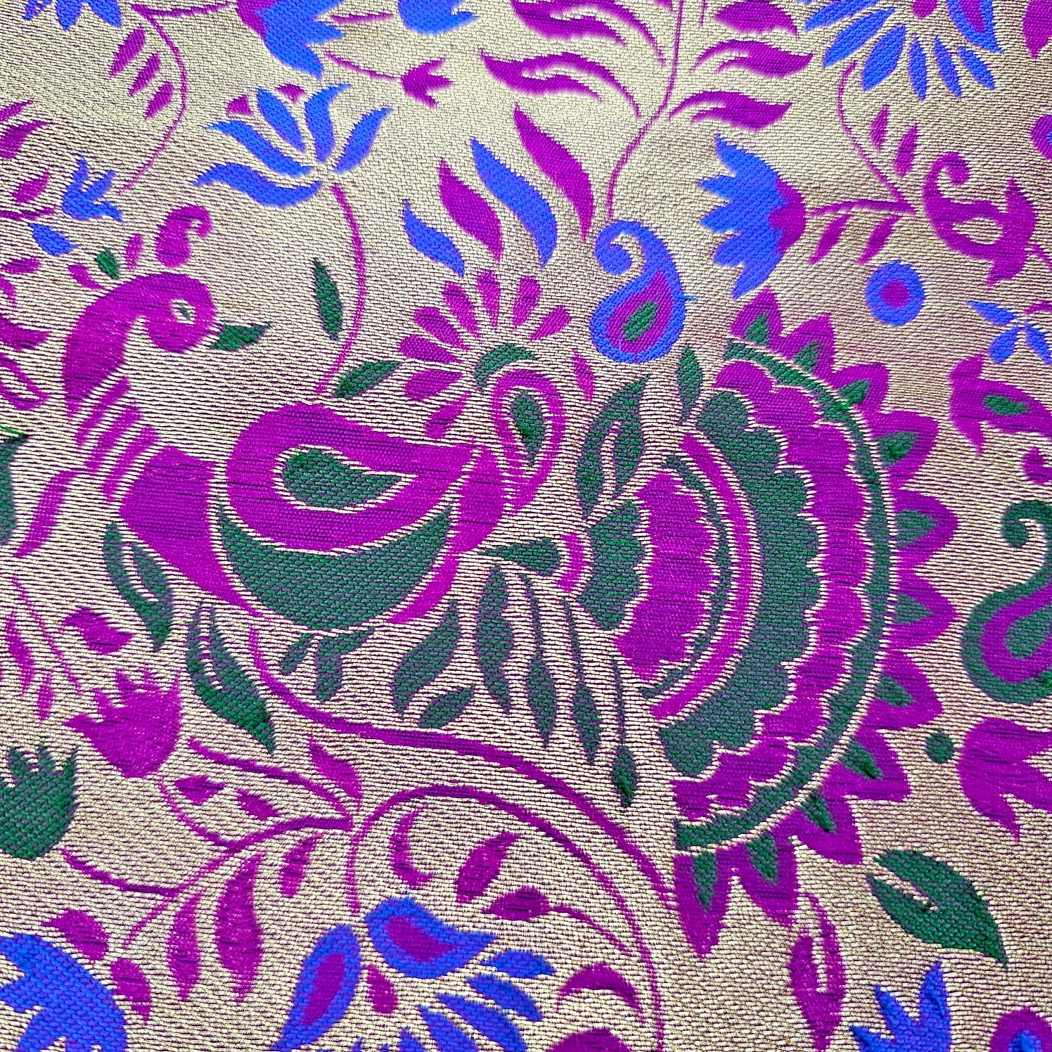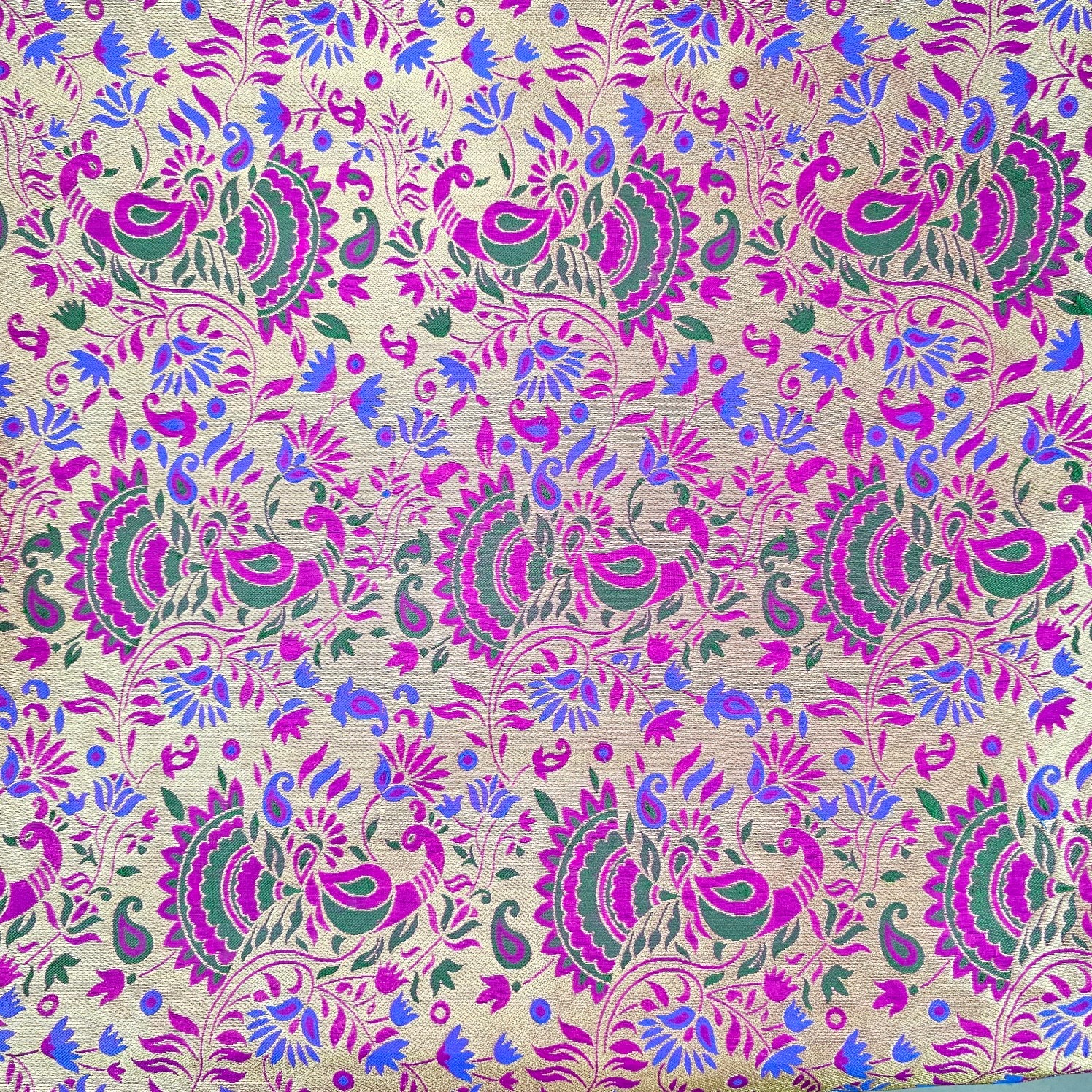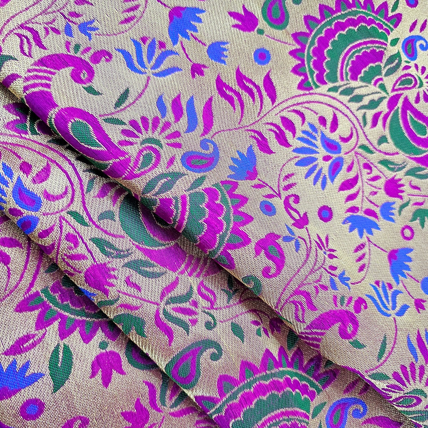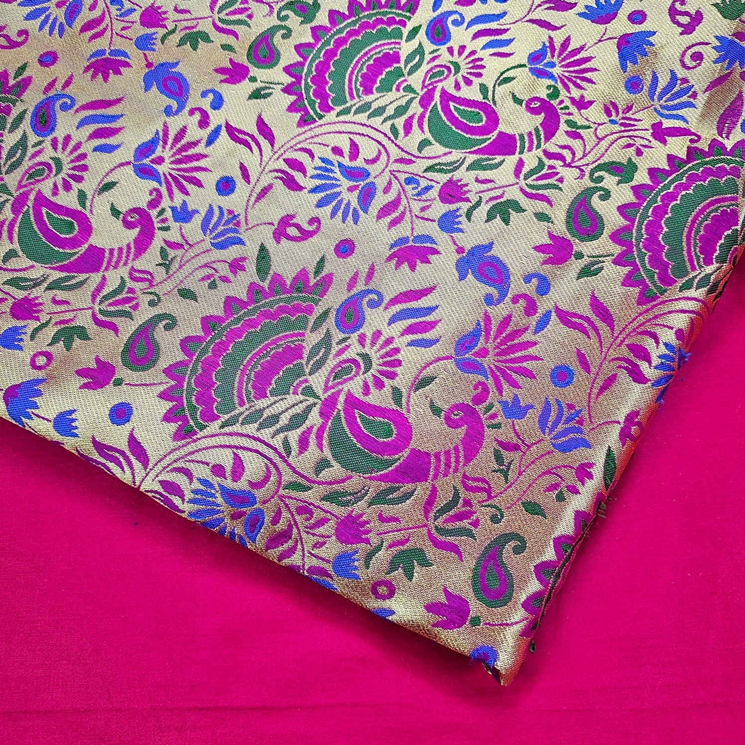 Elegant golden Paithani fabric with intricate floral and peacock motifs woven in vibrant shades of pink, blue, and green. The rich zari base enhances the regal appeal, making it perfect for traditional and festive attire.