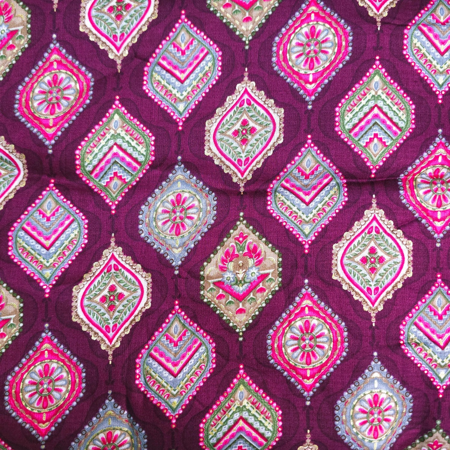 A vibrant printed cotton fabric featuring traditional diamond-shaped motifs in multicolor hues of yellow, blue, green, and orange set against a rich red base. The detailed floral and geometric elements within each motif give it a festive and cultural appeal. Soft, breathable, and comfortable, this fabric is perfect for ethnic wear, casual outfits