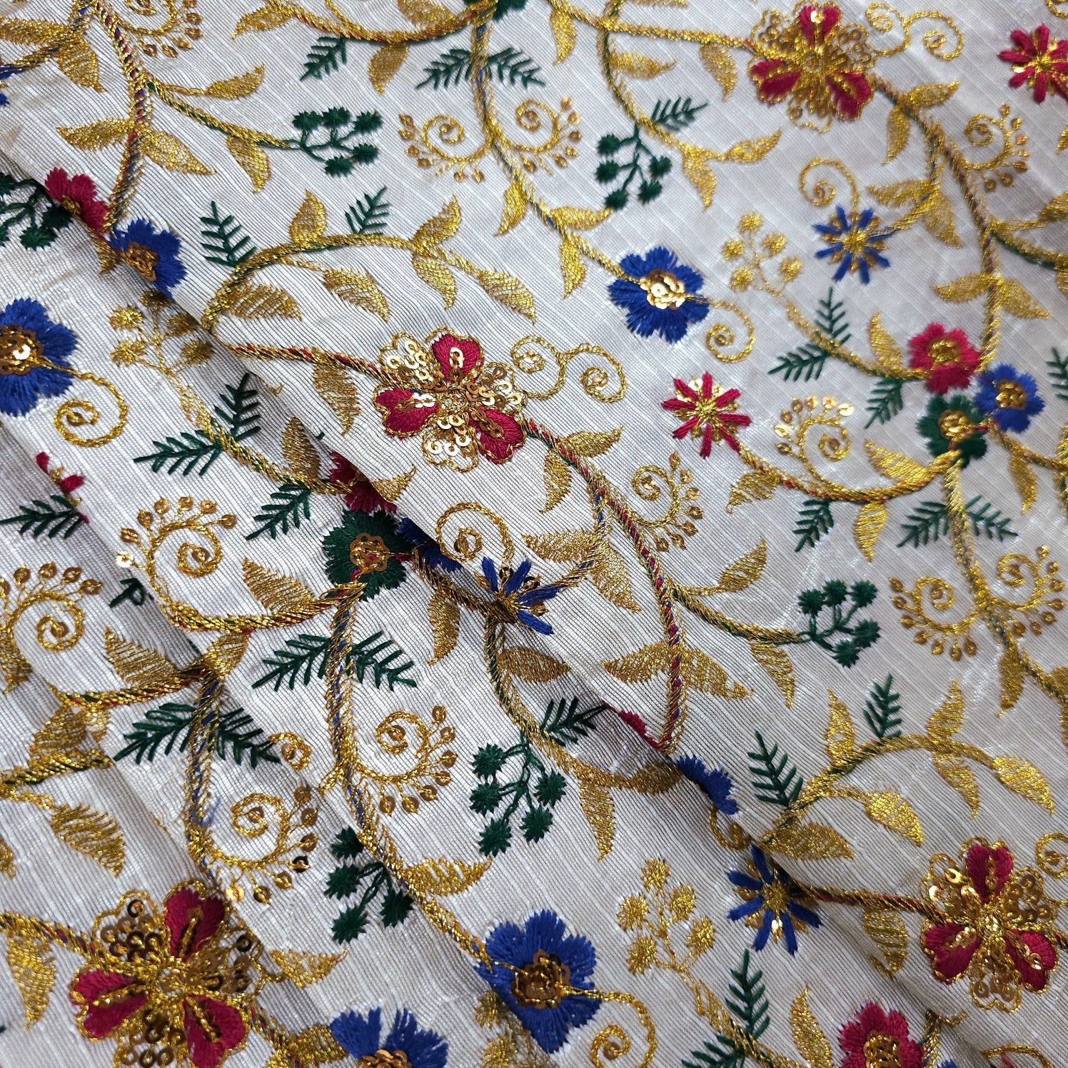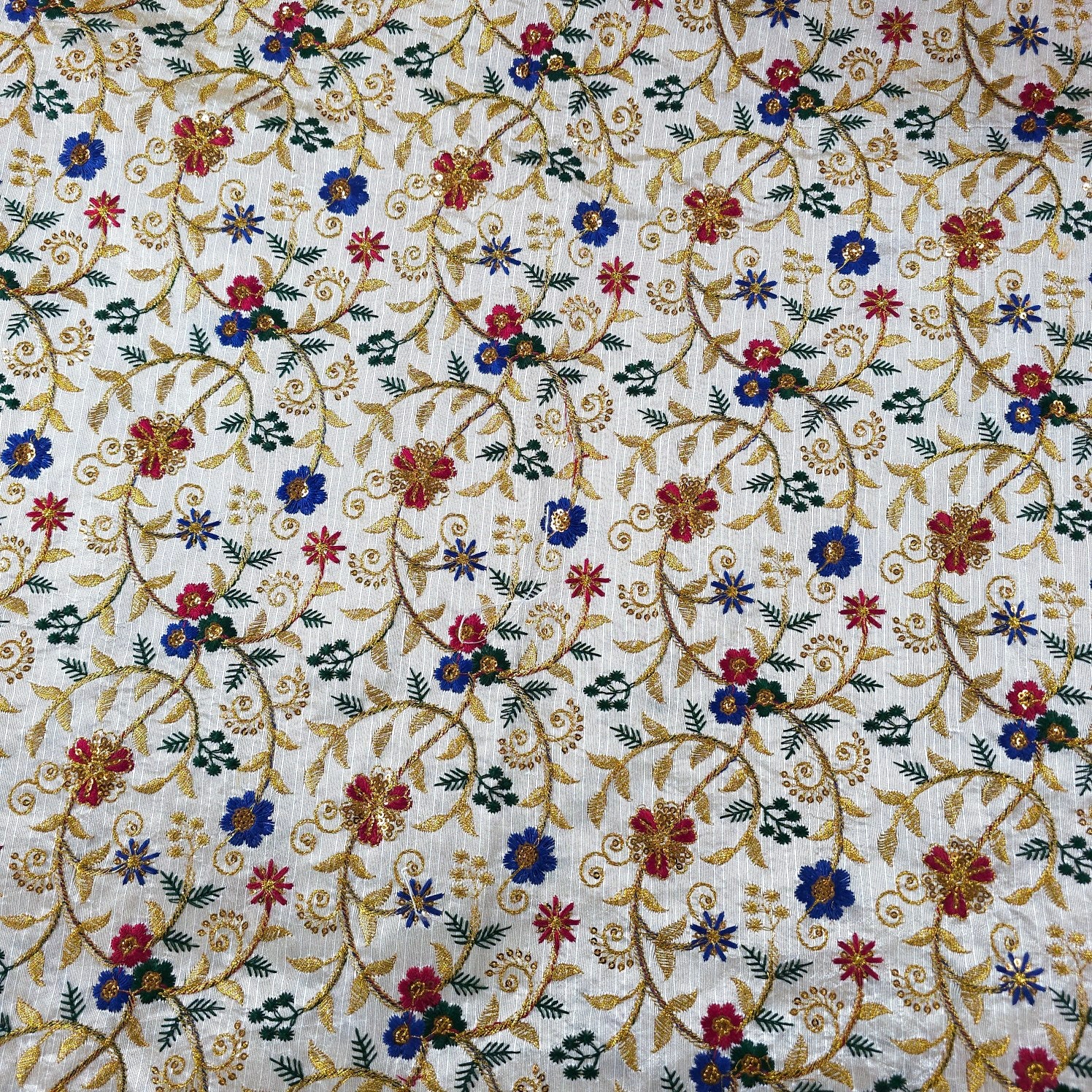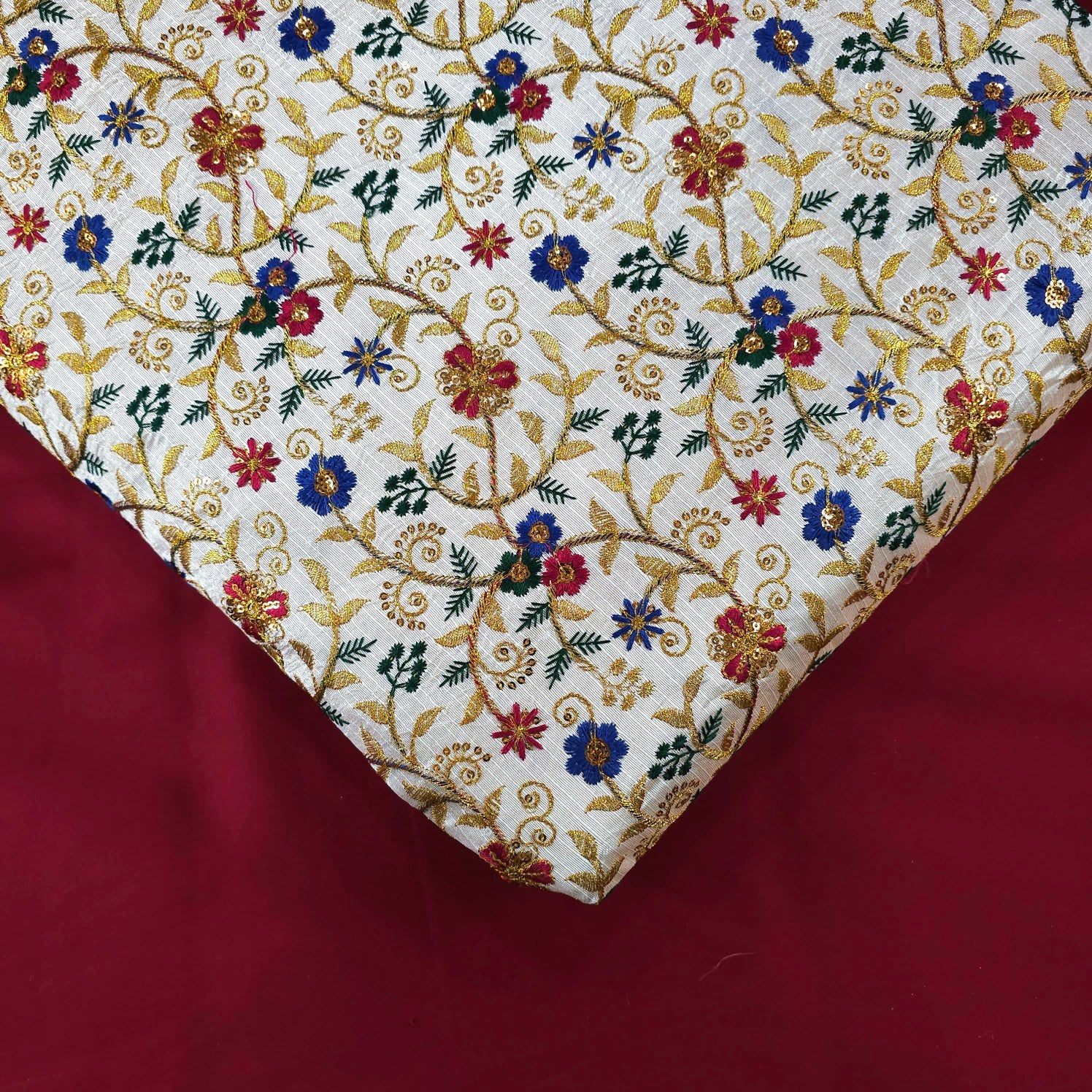 This fabric offers a perfect balance between tradition and refinement. Fabric adorned with floral thread embroidery that gracefully spans the surface. This fabric’s gentle tone and reflective highlights make it perfect for minimal yet festive ethnic styles.