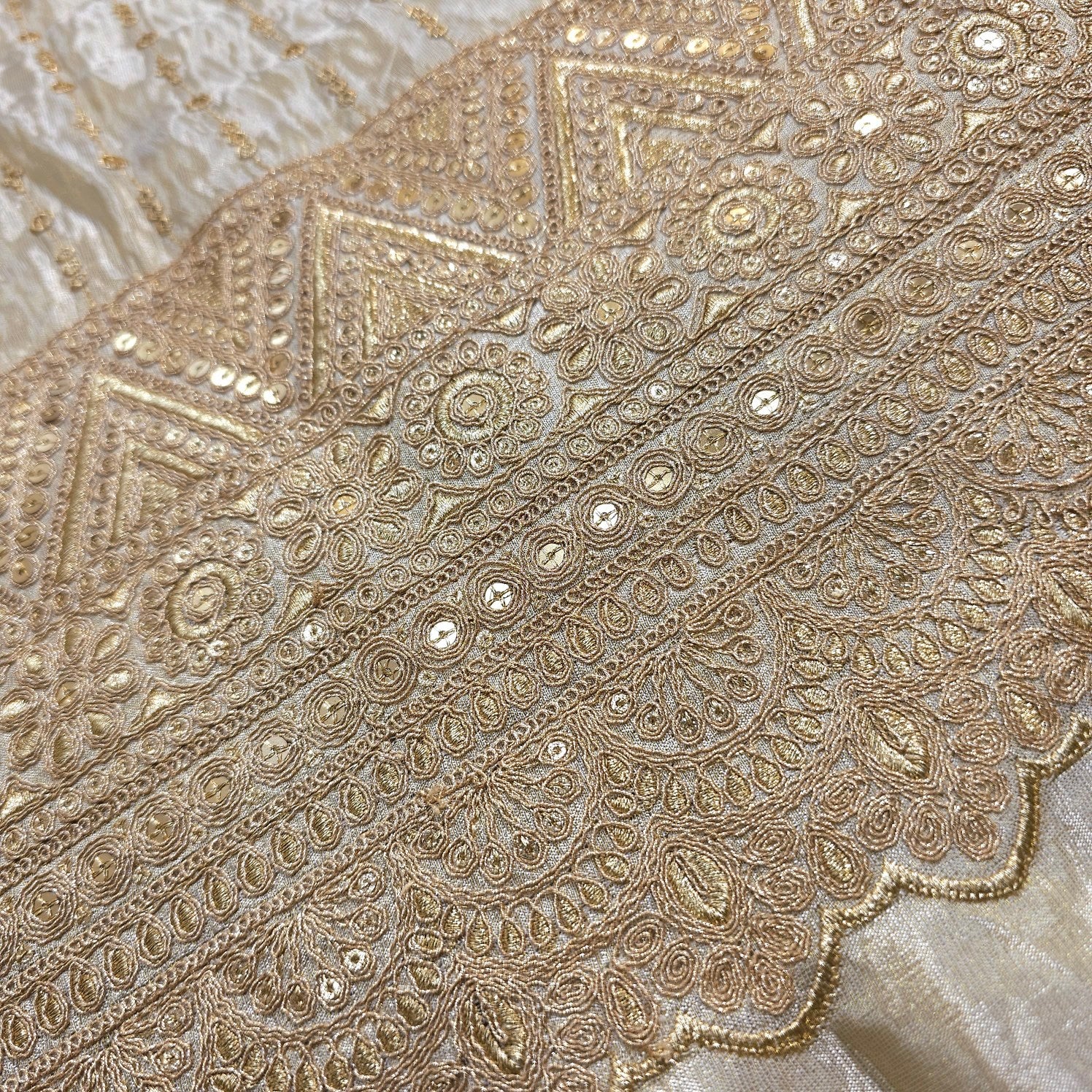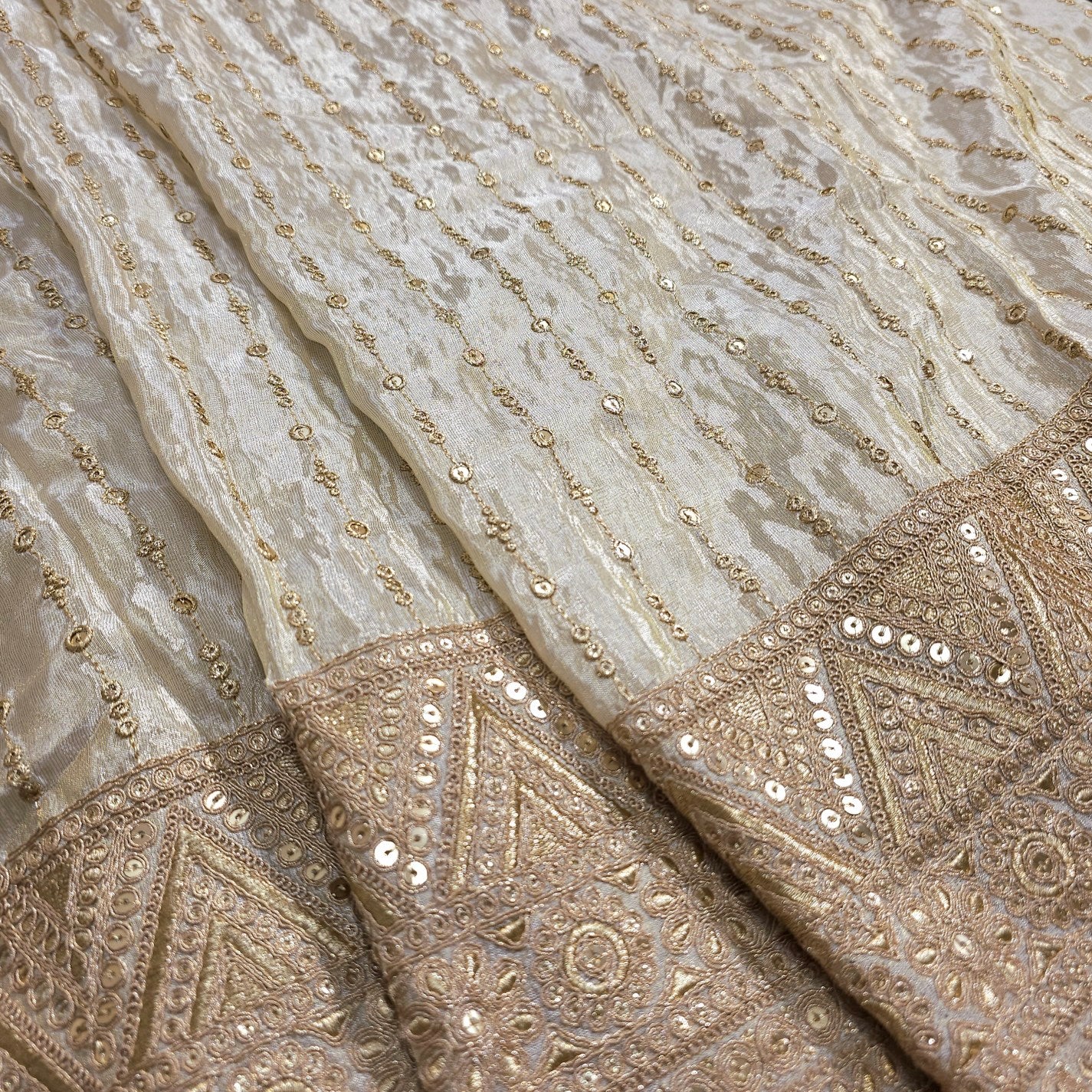 An elegant dyeable shimmer tissue fabric adorned with geometric border and linear work. The fine zari and resham weaving enhances the sheen and adds a luxurious depth, making it perfect for special occasion ensembles. The base is dyeable work will remains as it is.