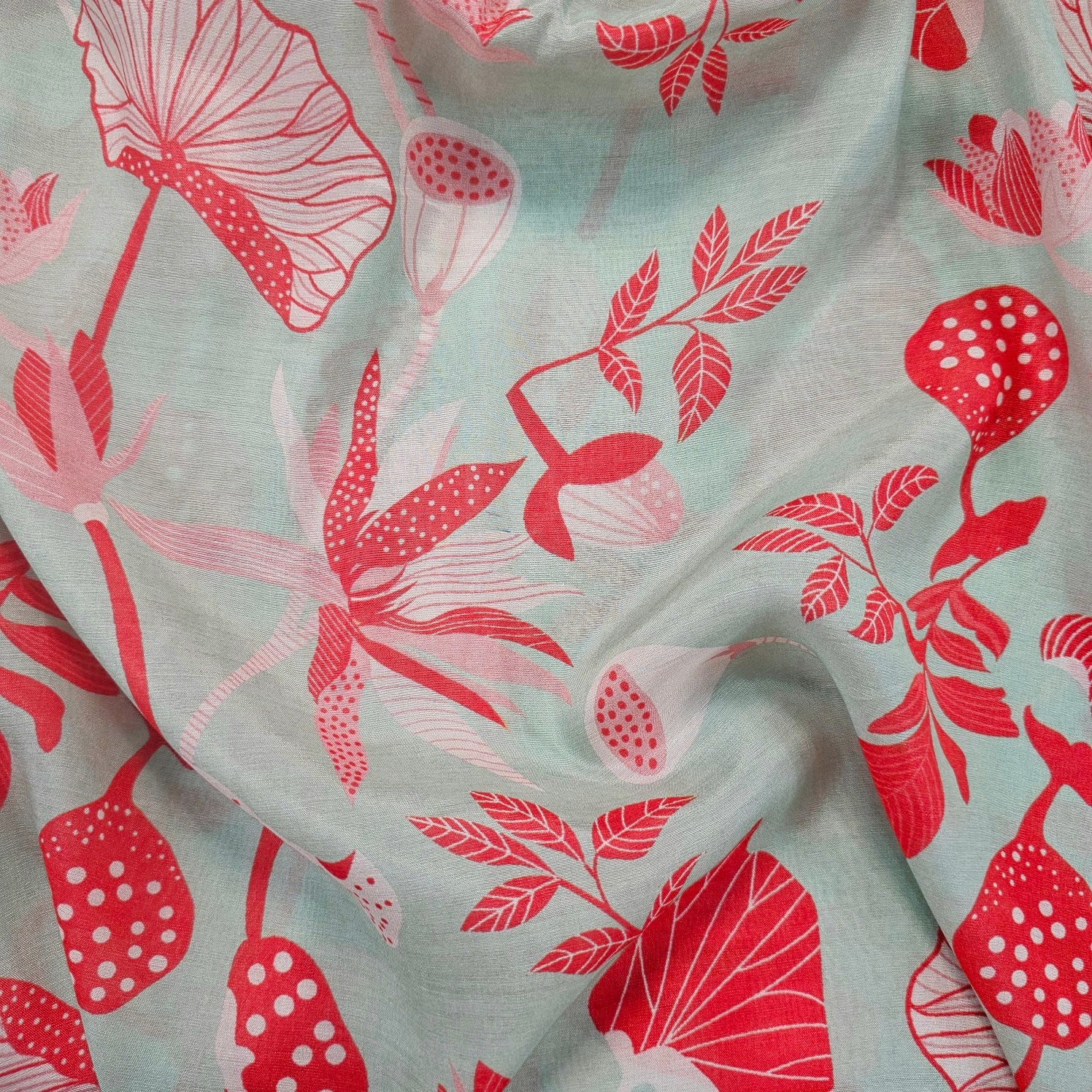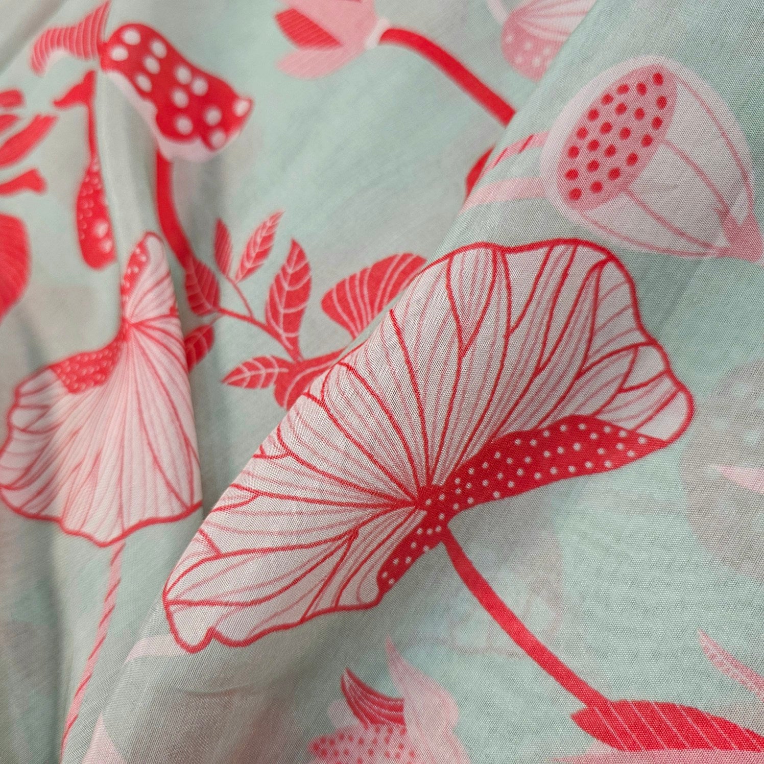 A soft and airy muslin/cotton voile fabric featuring a delicate botanical print inspired by nature’s beauty. The intricate floral and foliage motifs create a harmonious blend of elegance and freshness. The semi-sheer texture makes it an ideal choice for summer wear, exuding grace and lightness.