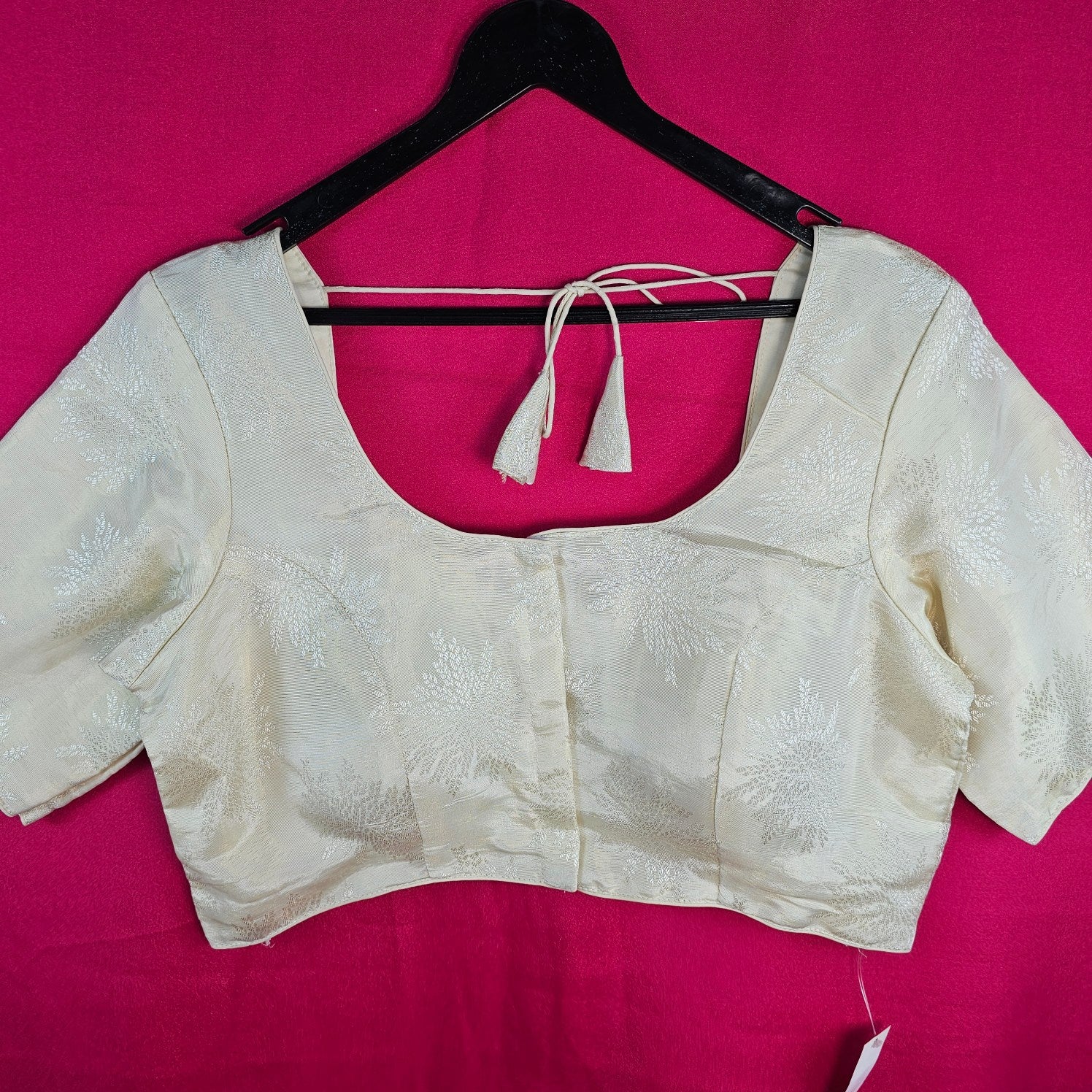 This is a graceful woven blouse in a cream shade, adorned with delicate floral motifs. Featuring a classic round neckline and half sleeves, it exudes understated elegance. Perfect for weddings, receptions, or pairing with vibrant festive ensembles.