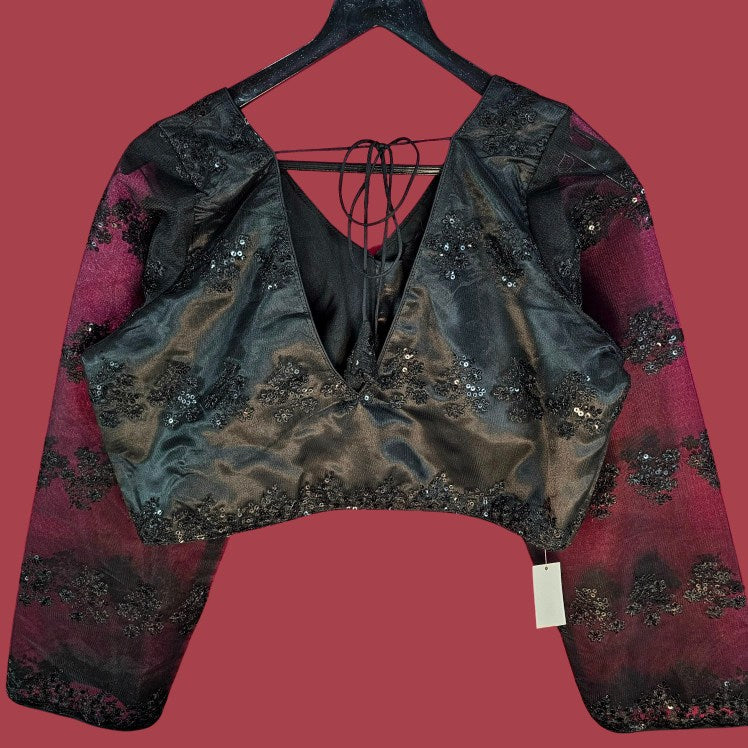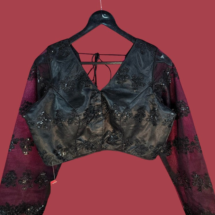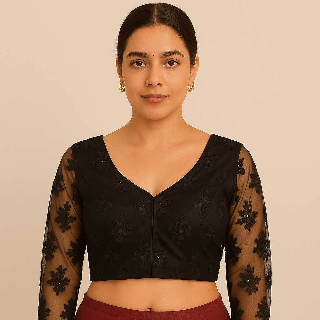 This elegant net blouse features delicate floral embroidery with Sequin work in a matching hue, creating a subtle yet sophisticated look. The front and back V-neck design enhances its graceful silhouette, making it a perfect choice for ethereal and festive ensembles.
