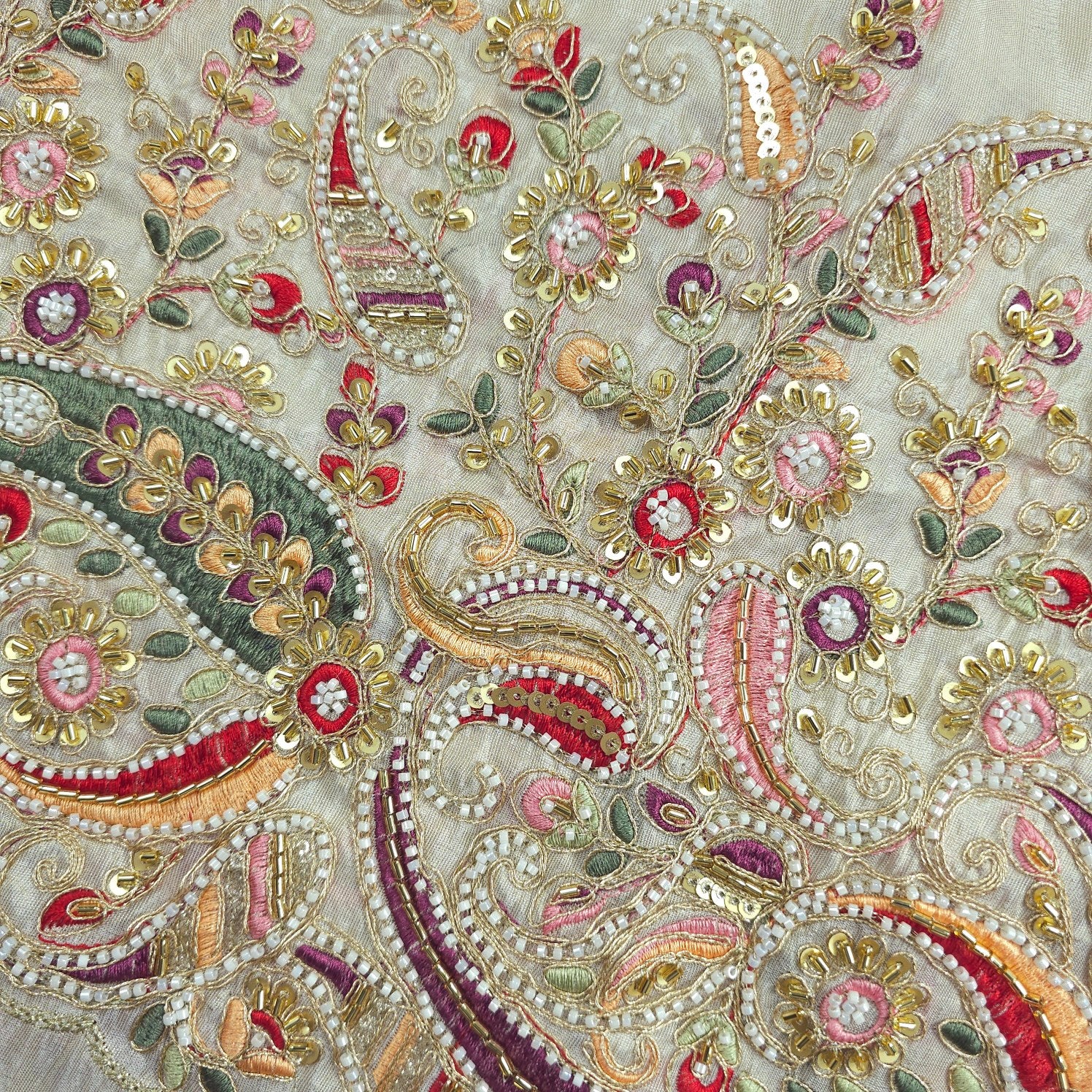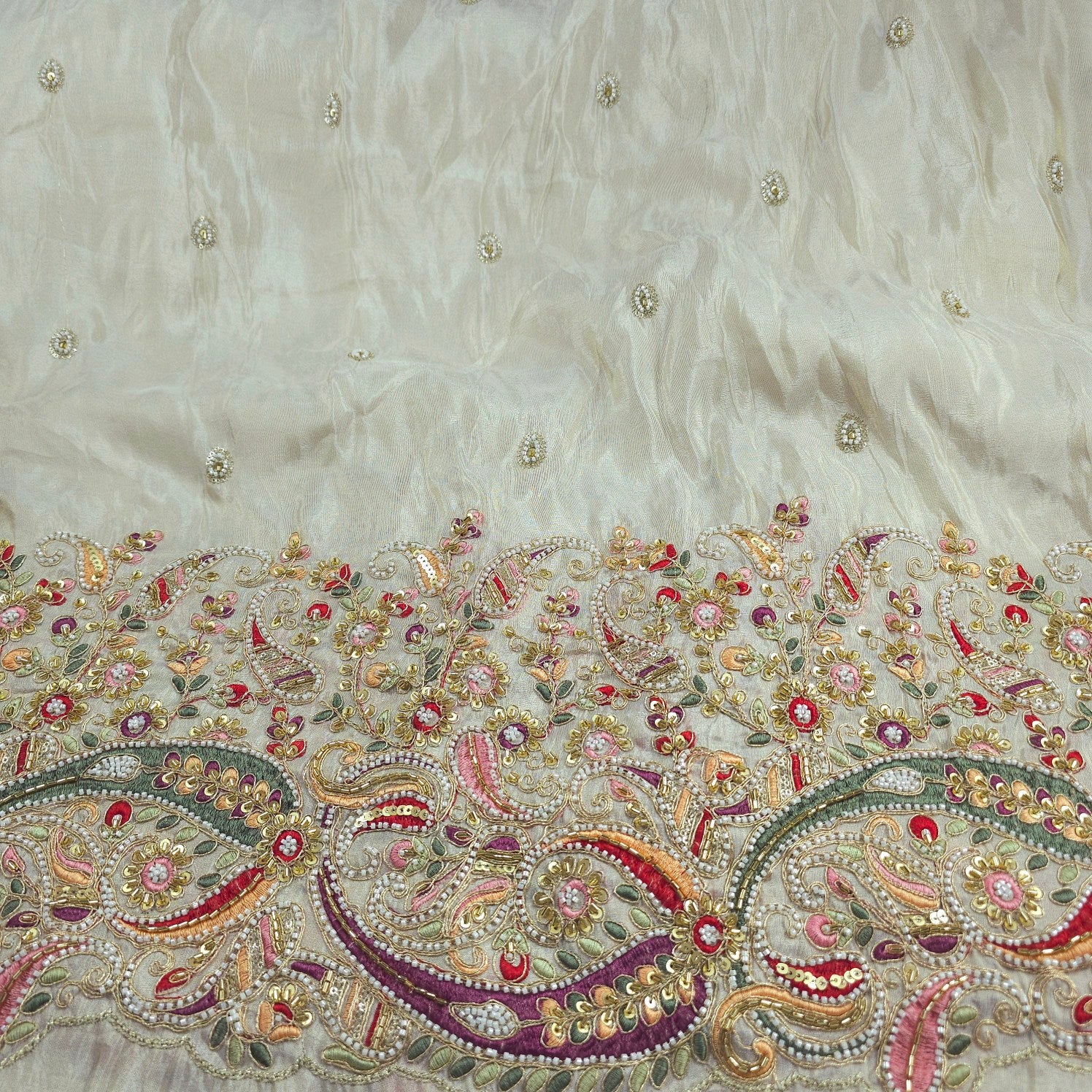 An opulent fabric crafted on a soft tissue-silk base, Zari Gulistan is adorned with an intricate border of floral vines, paisley motifs, and sequin highlights. The embroidery is rich in multicolor resham threads, gold zari, and mirror work, creating a mesmerizing blend of tradition and vibrancy. Scattered pearl-like buttis across the body add grace, making it a perfect choice for bridal and festive wear.