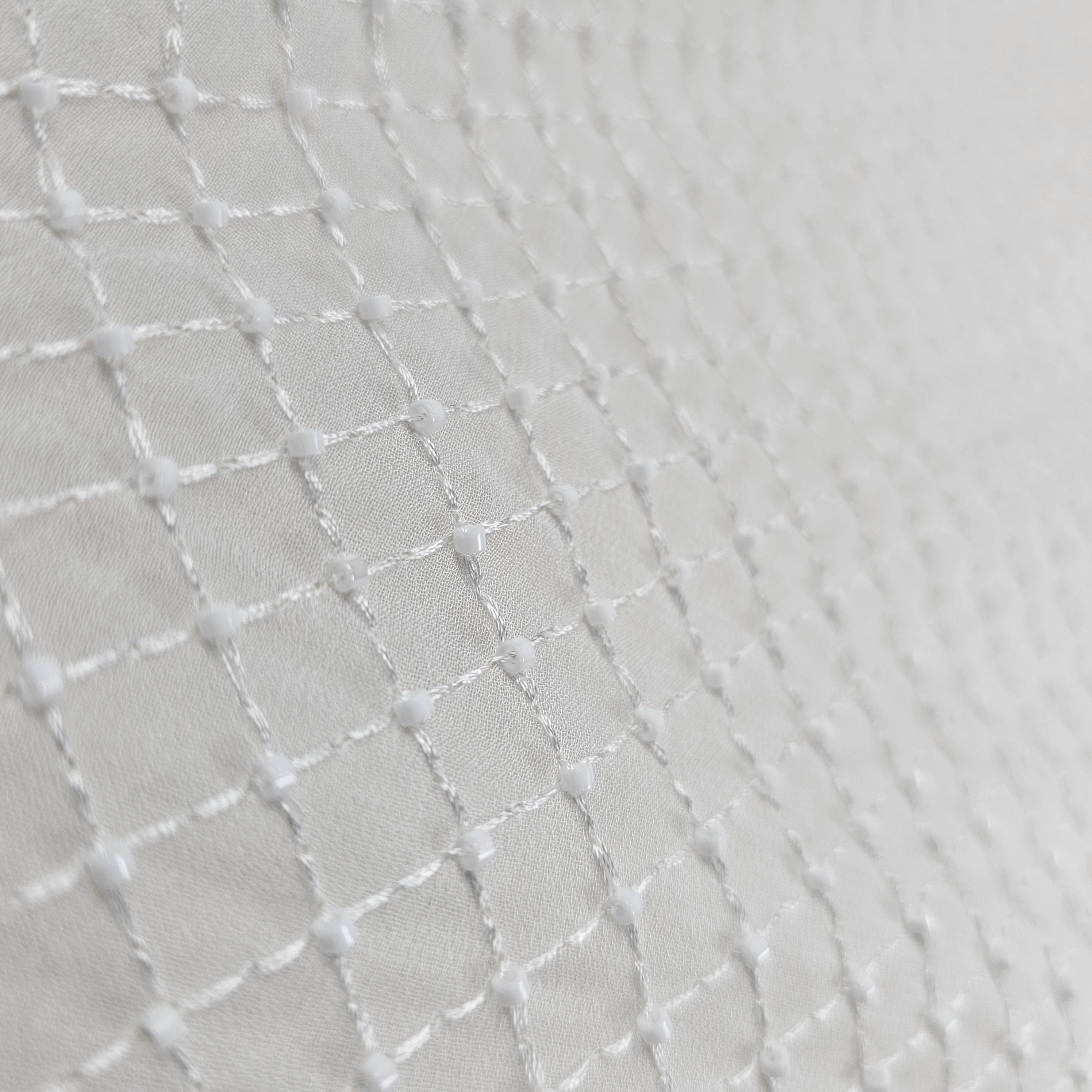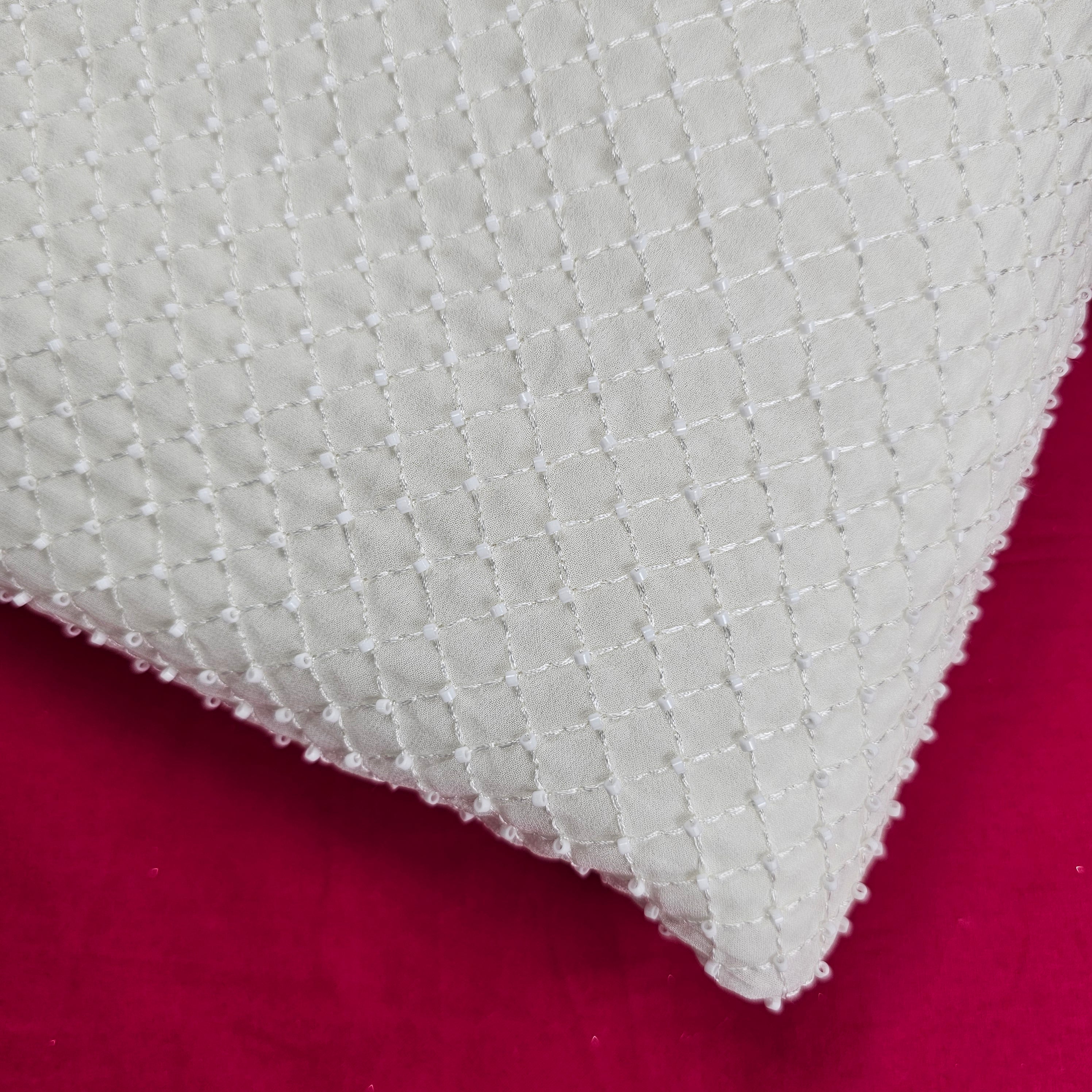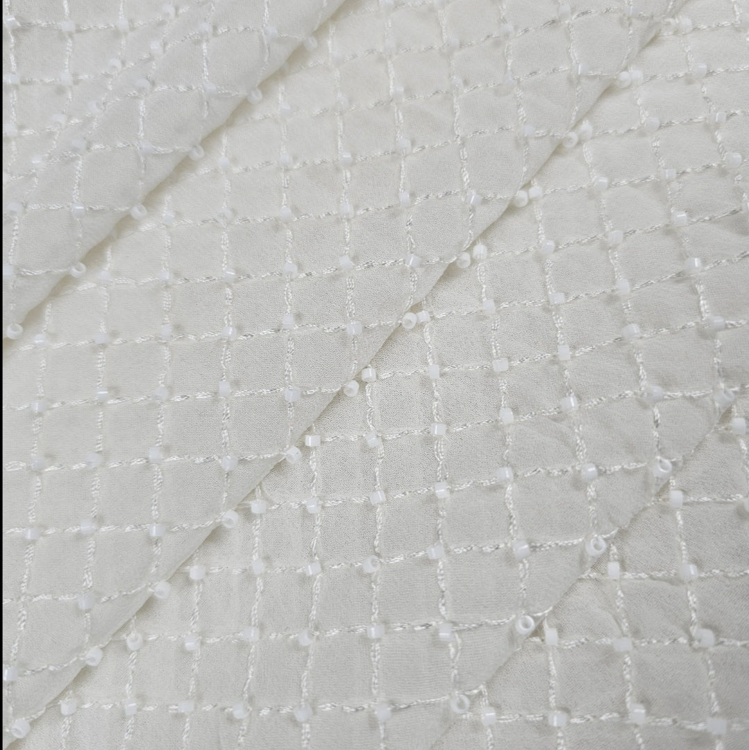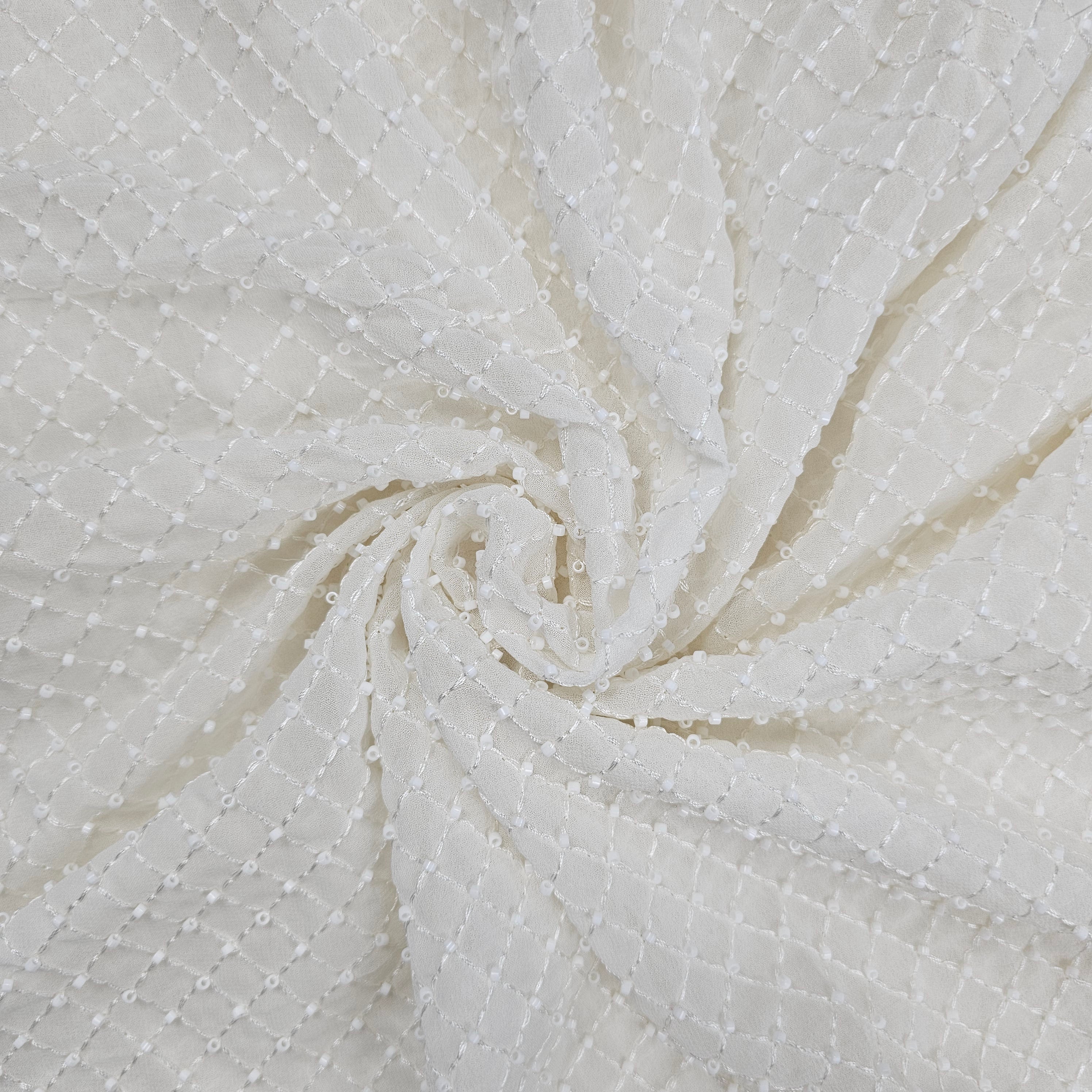 A dyeable georgette fabric featuring a delicate diamond-shaped threadwork grid. The embroidery forms a uniform geometric pattern, giving the fabric a subtly textured surface. Ideal for creating elegant ethnic or fusion wear that balances minimalism with refined detailing.
