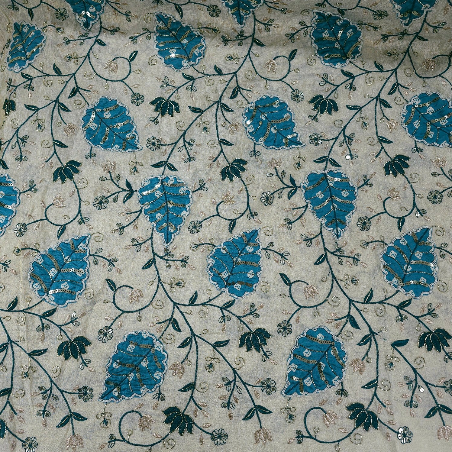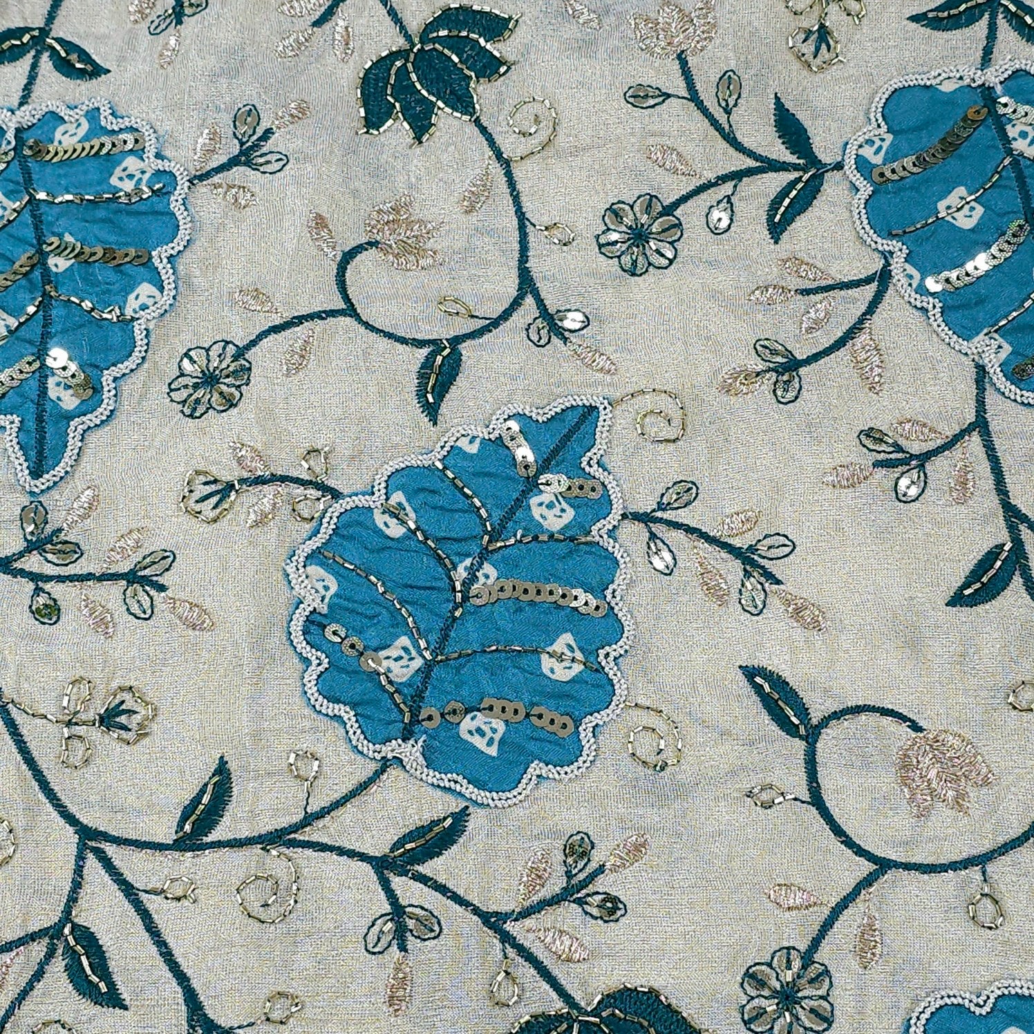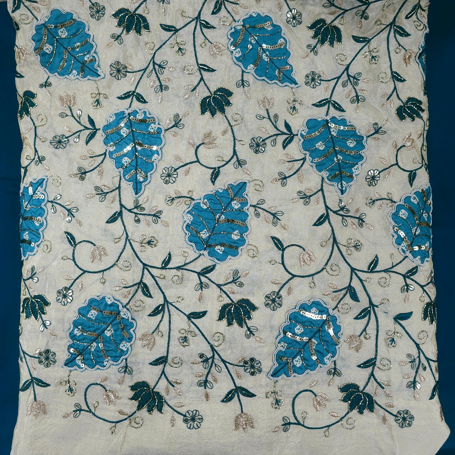 Shimmer tissue based fabric crafted, adorned with an leaves patchwork and all over floral vines, and sequin highlights. The embroidery is rich in resham threads, gold zari, and mirror work, creating a mesmerizing blend of tradition and vibrancy. After dyeing the work will remain as it is only base color will change. Making it a perfect choice for bridal and festive wear.
