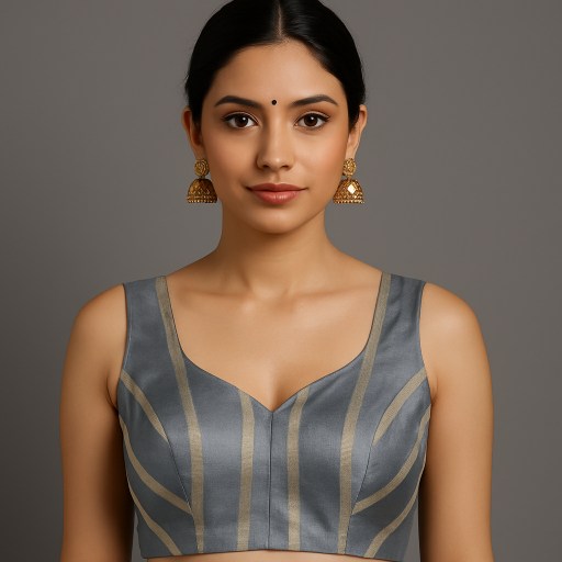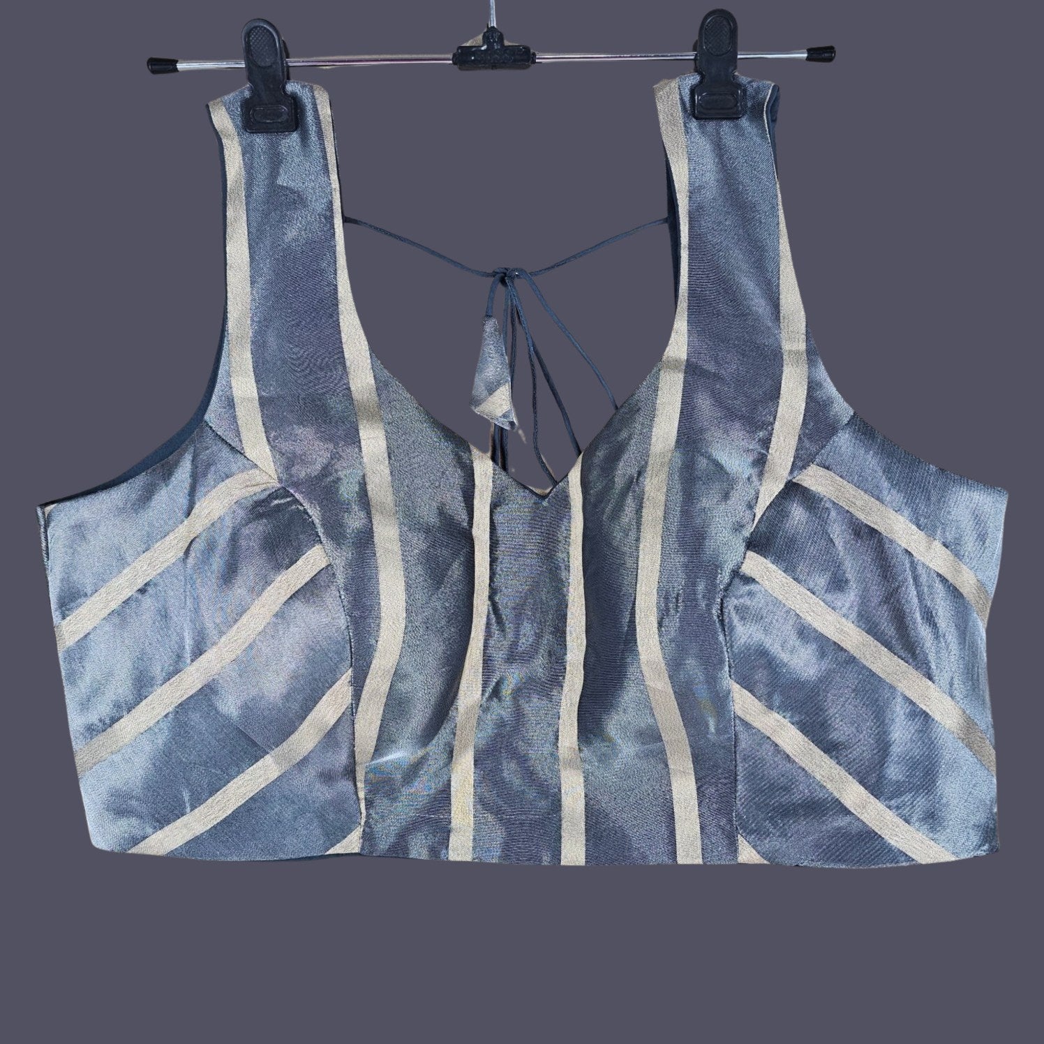 This grey color two-tone blouse features golden panel detailing that adds a modern twist to traditional wear. With its sleeveless cut and deep neckline, it’s perfect for bold festive looks. Ideal for pairing with sarees or lehengas for a stylish statement.