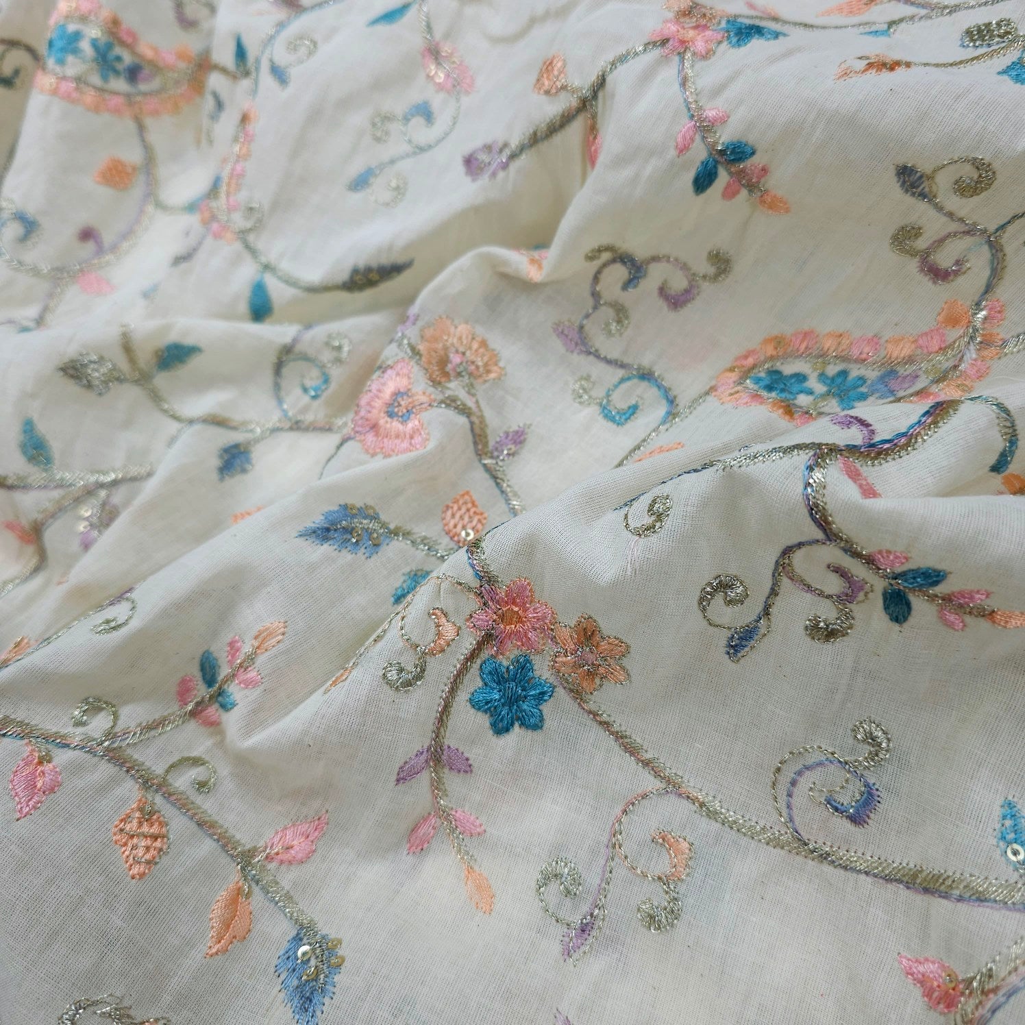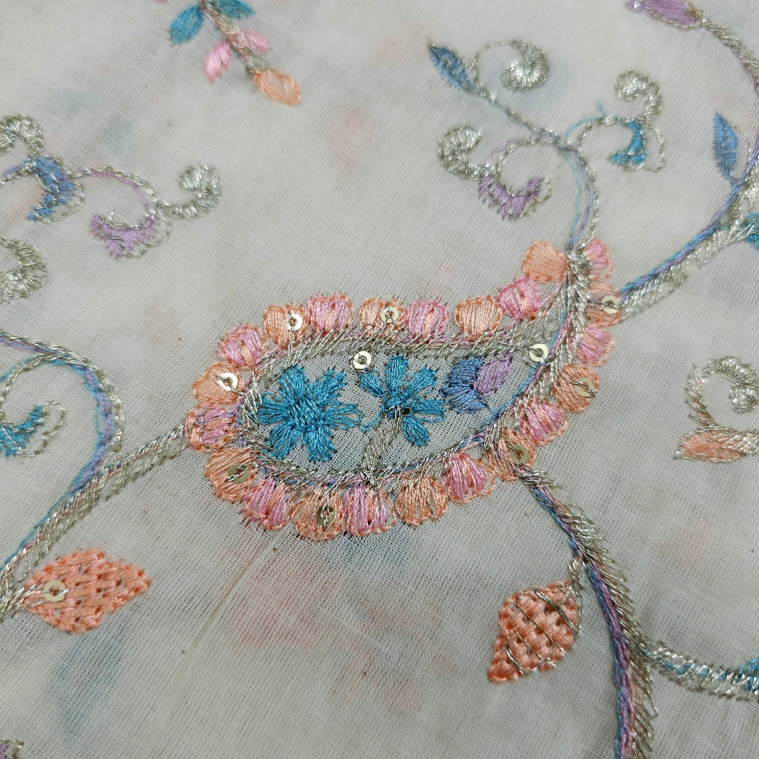 ✔ Intricate thread embroidery with floral and vine motifs