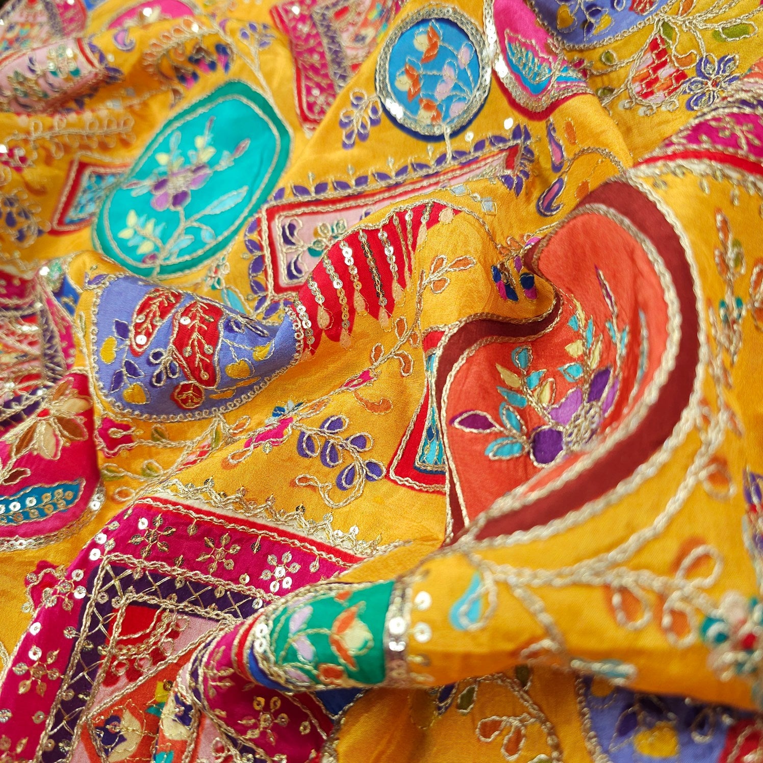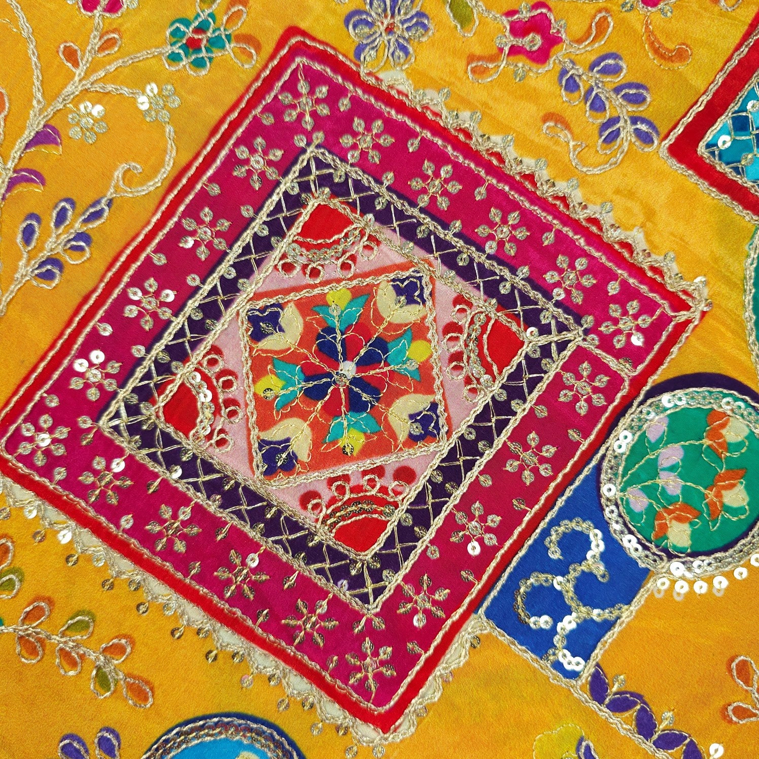 ✔ Intricate thread embroidery with floral and vine motifs